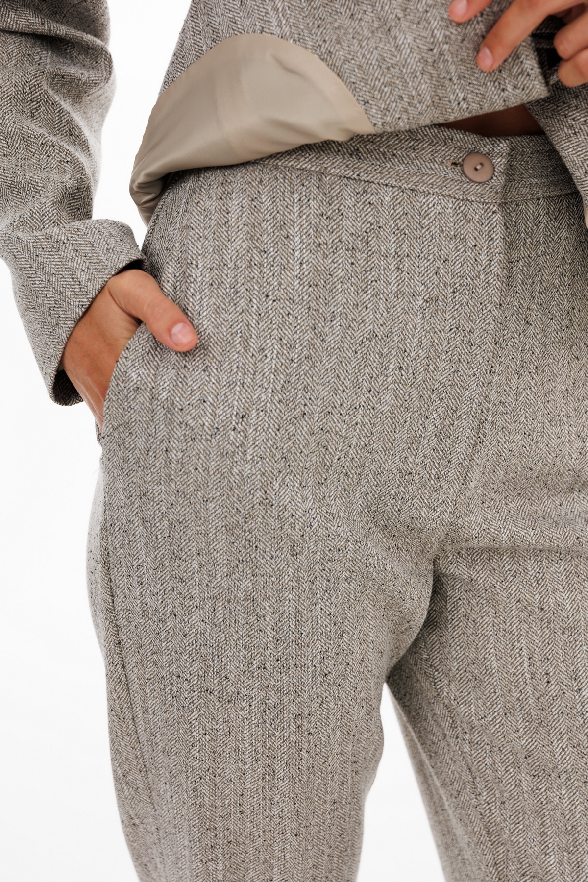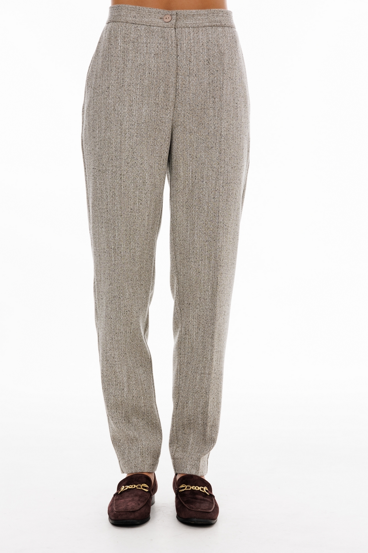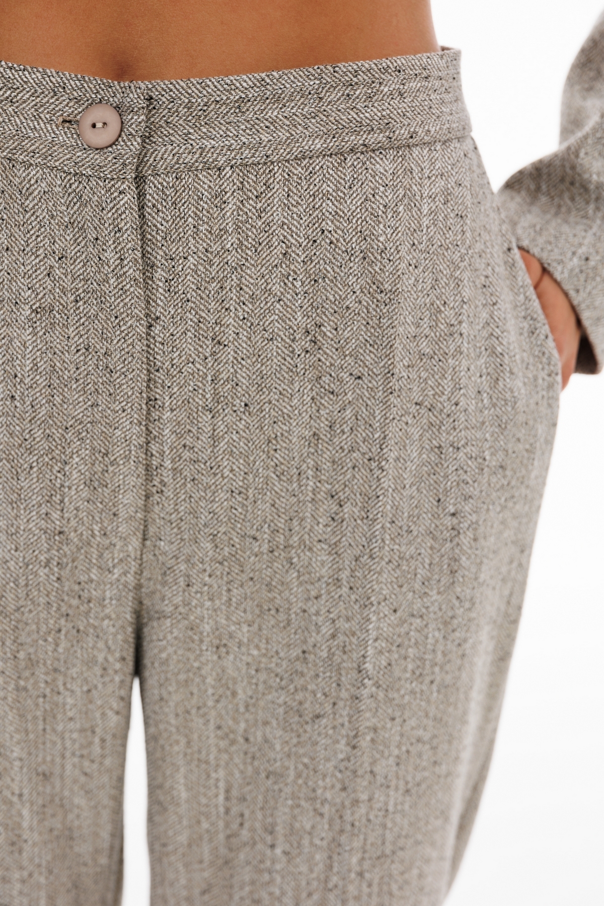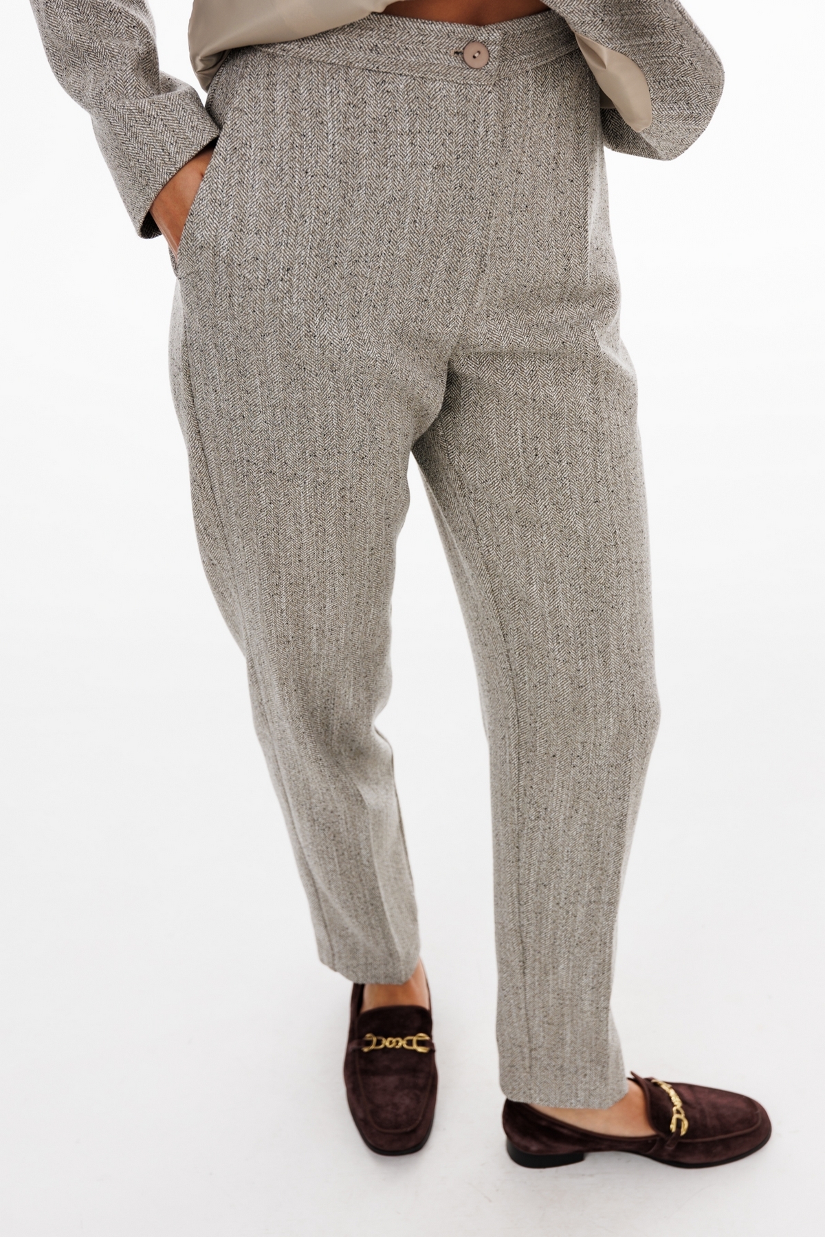 Брюки выполнены из костюмной ткани меланж с рисунком "елочка". Брюки зауженные к низу, длиной 7/8, на притачном поясе. Спереди боковые карманы с наклонным входом и застежка на пуговицу и молнию с гульфиком. По задней части пояса эластичная тесьма. Передние и задние части брюк заутюжены на кант.