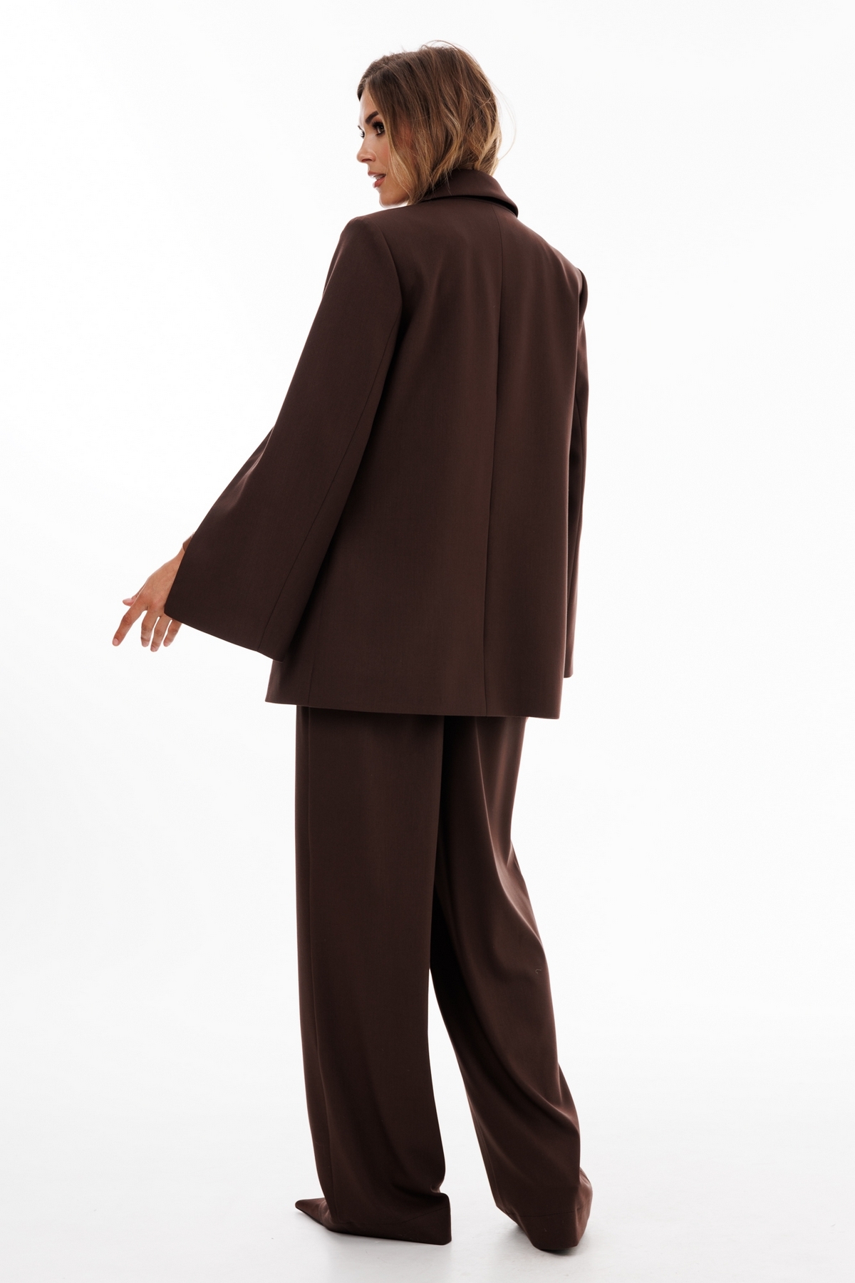 Брюки выполнены из костюмной ткани. Брюки прямого покроя длиной в пол, на притачном поясе с эластичной тесьмой. Спереди боковые карманы с наклонным входом.