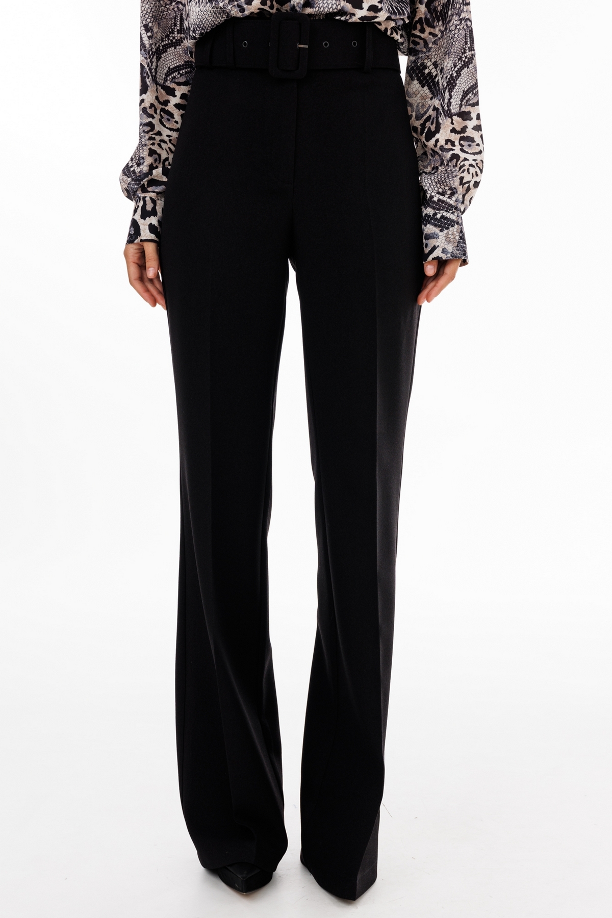 Брюки выполнены из костюмной ткани. Брюки покроя "клеш", на притачном поясе, длиной в пол. Спереди застежка на молнию с гульфиком, потайную пуговицу и два брючных крючка. Передние и задние части брюк заутюжены на кант. В комплект входит съемный пояс из основной ткани.