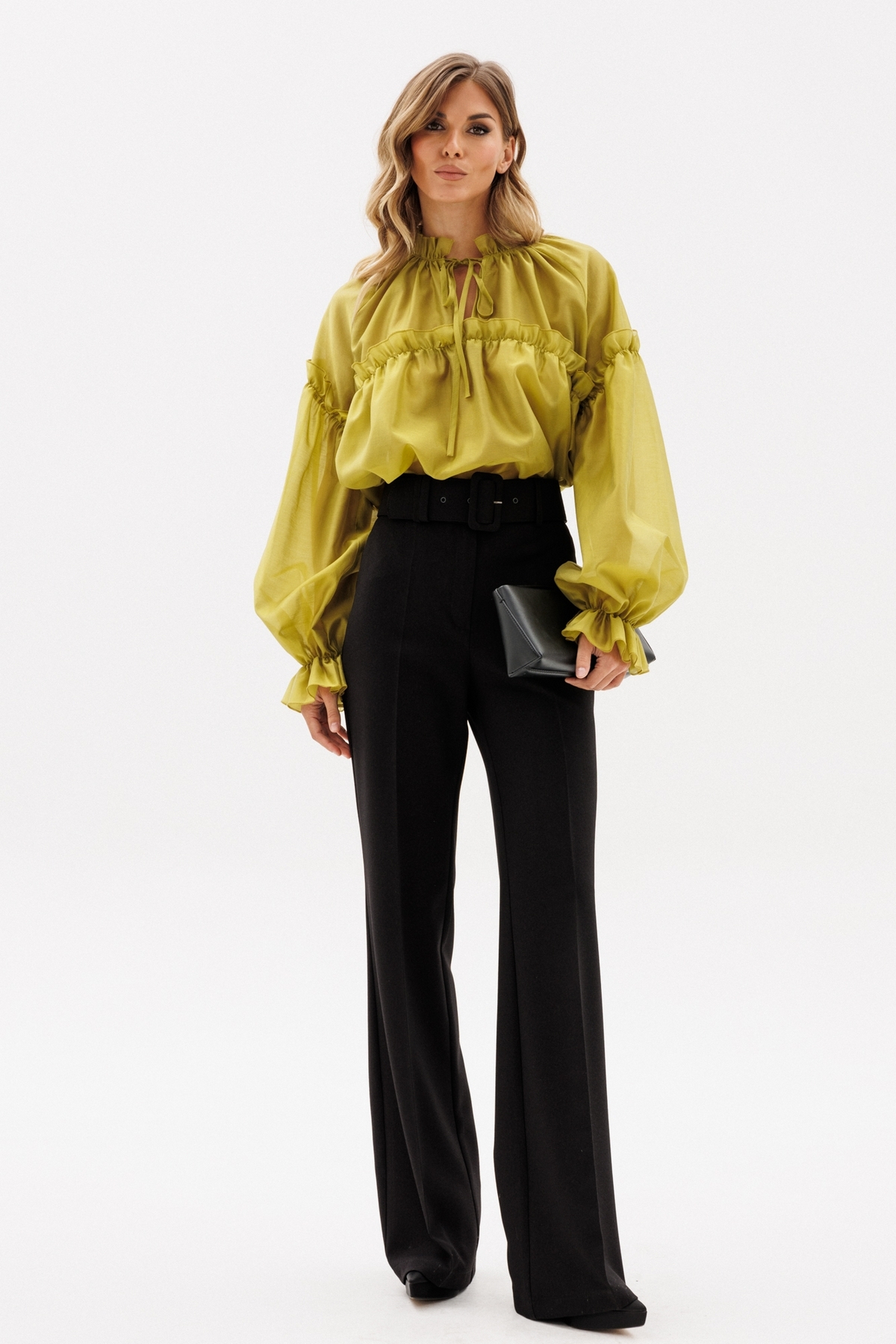 Брюки выполнены из костюмной ткани. Брюки покроя "клеш", на притачном поясе, длиной в пол. Спереди застежка на молнию с гульфиком, потайную пуговицу и два брючных крючка. Передние и задние части брюк заутюжены на кант. В комплект входит съемный пояс из основной ткани.