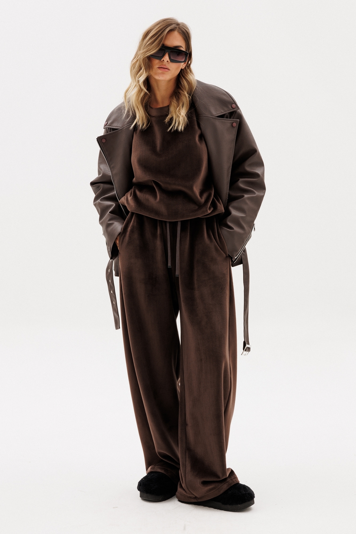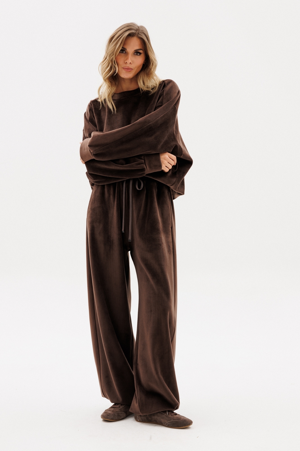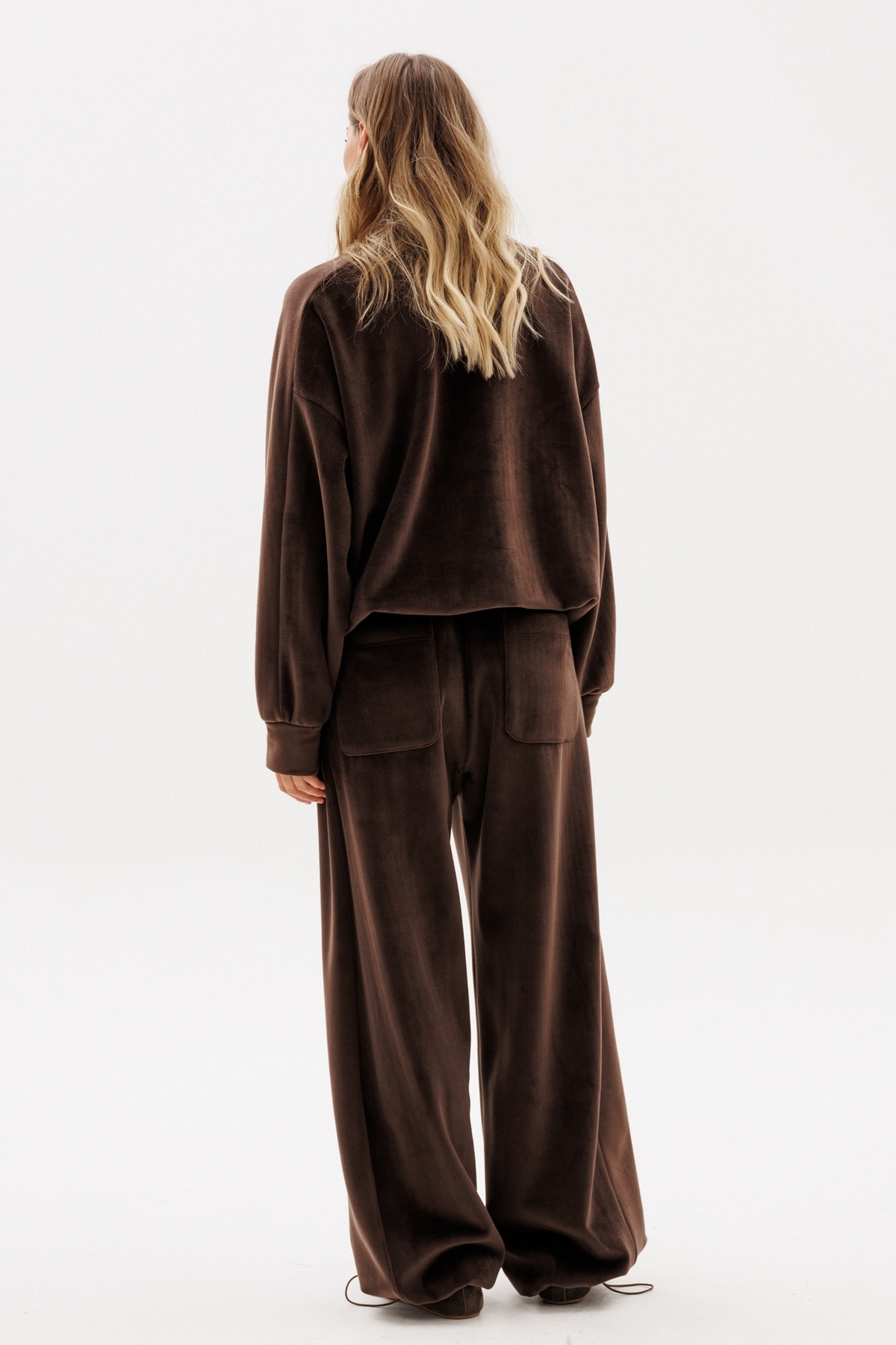 Комплект: джемпер+брюки. Комплект выполнен из двустороннего велюра в мелкий рубчик. Джемпер О-образного силуэта, покроя "oversize", длиной до линии бедер. Перед и спинка цельные. Горловина округлой формы, обработана бейкой. Плечевой шов удлинен. Рукав рубашечного покроя, одношовный. Низ рукава на манжете. Верхняя часть рукава переходит в кокетку переда т спинки и доходит до горловины. По низу джемпера обработан пояс. Пояс, манжеты, верхняя часть рукава и бейка горловины выполнены из основной, но без рубчика. Брюки на притачном поясе с эластичной тесьмой, прямого силуэта, длиной в пол, покроя "oversize". Боковой шов заменен лампасом. В швах лампаса карманы. Сзади накладные карманы. В пояс протянут шнур с наконечниками. По низу брюк втянута эластичная тесьма с фиксаторами. Лампасы и пояс выполнены из основной ткани, но без рубчика.