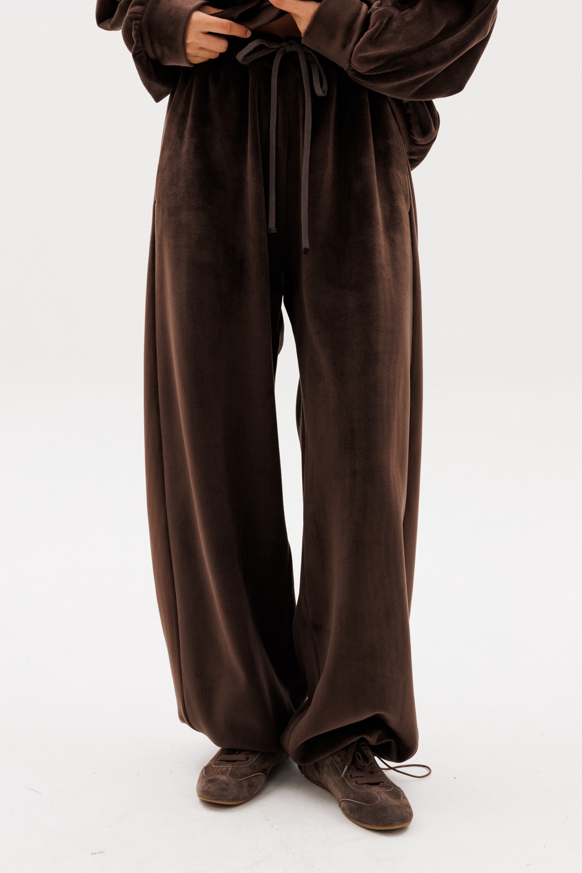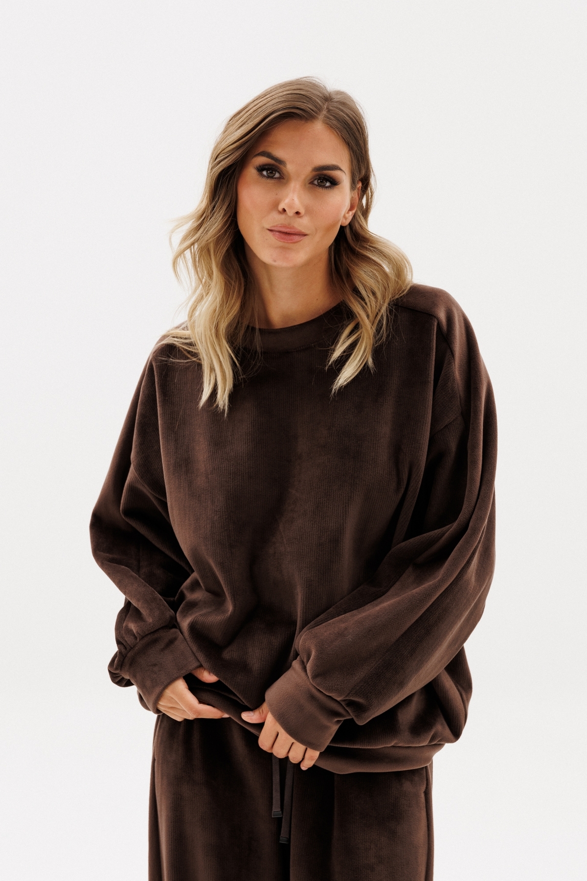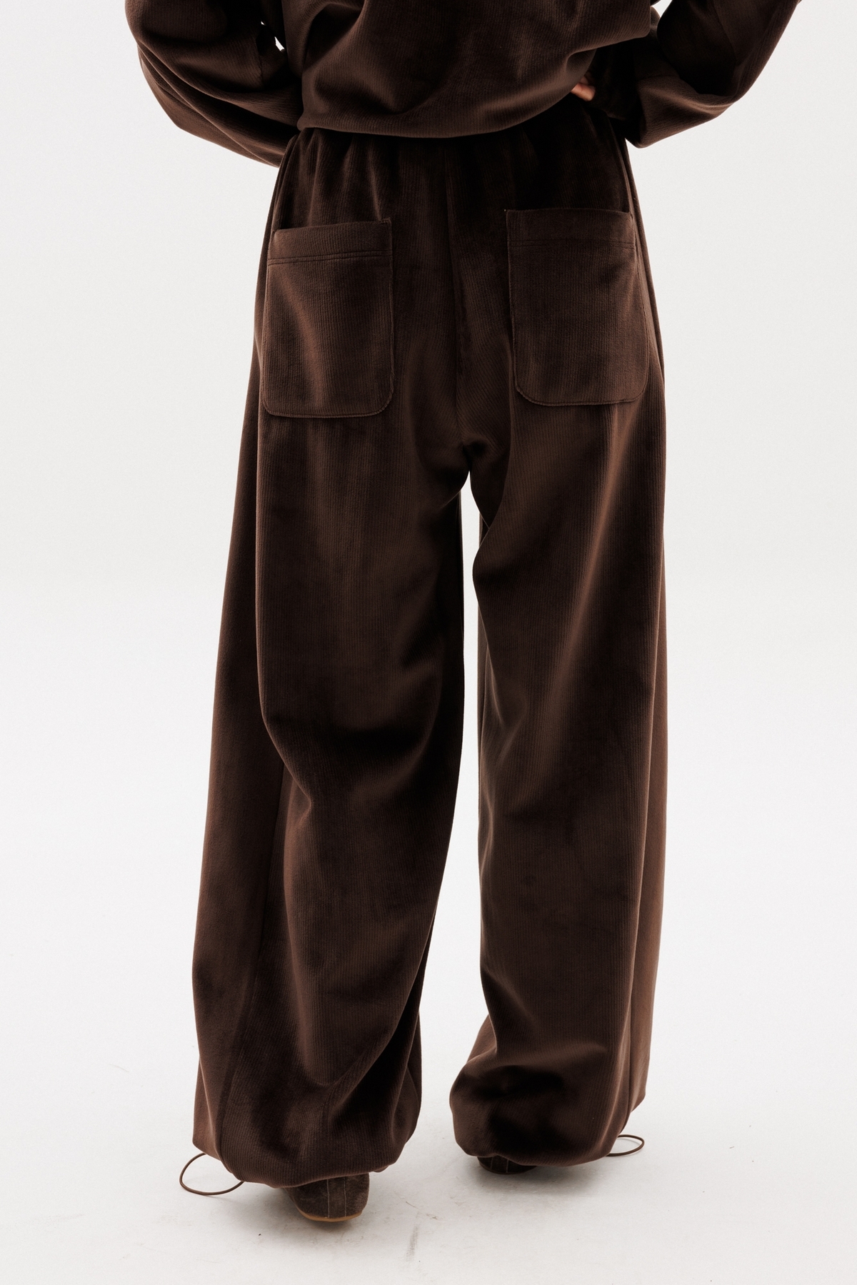 Комплект: джемпер+брюки. Комплект выполнен из двустороннего велюра в мелкий рубчик. Джемпер О-образного силуэта, покроя "oversize", длиной до линии бедер. Перед и спинка цельные. Горловина округлой формы, обработана бейкой. Плечевой шов удлинен. Рукав рубашечного покроя, одношовный. Низ рукава на манжете. Верхняя часть рукава переходит в кокетку переда т спинки и доходит до горловины. По низу джемпера обработан пояс. Пояс, манжеты, верхняя часть рукава и бейка горловины выполнены из основной, но без рубчика. Брюки на притачном поясе с эластичной тесьмой, прямого силуэта, длиной в пол, покроя "oversize". Боковой шов заменен лампасом. В швах лампаса карманы. Сзади накладные карманы. В пояс протянут шнур с наконечниками. По низу брюк втянута эластичная тесьма с фиксаторами. Лампасы и пояс выполнены из основной ткани, но без рубчика.