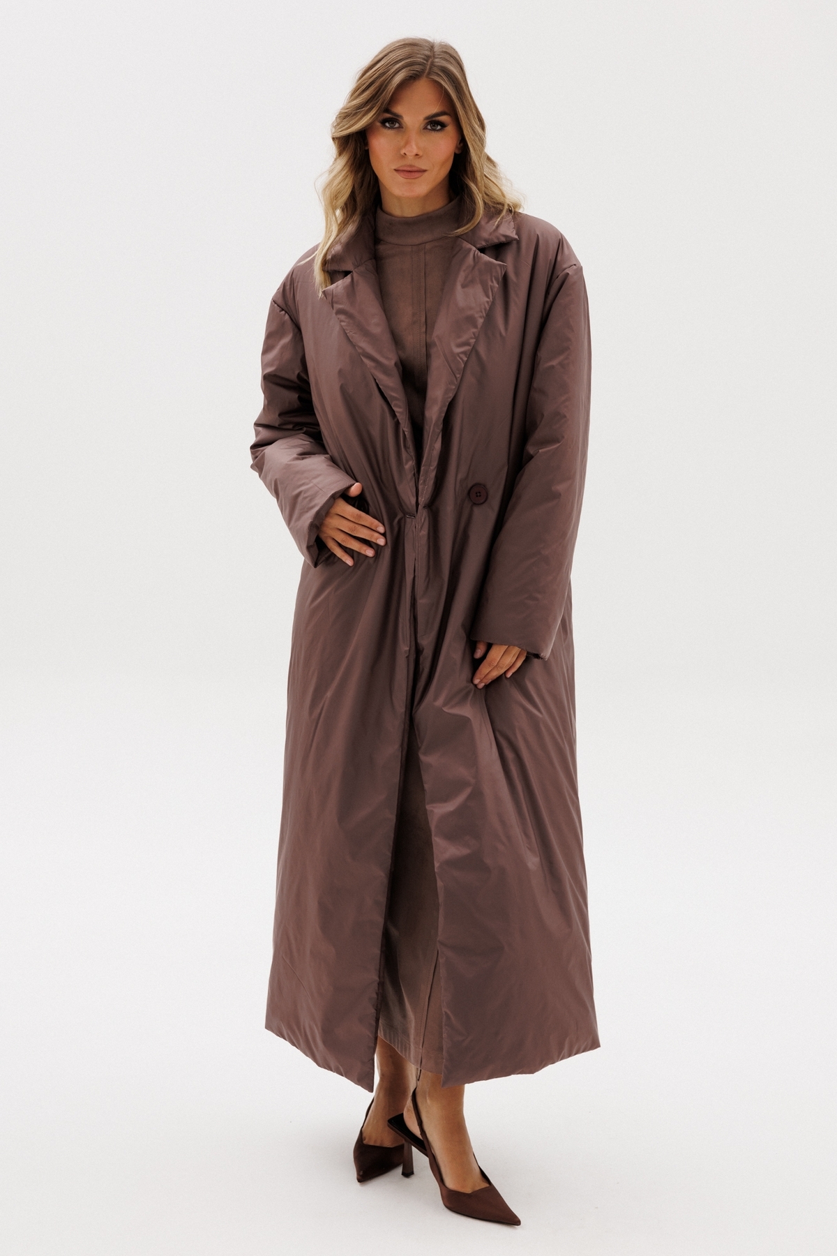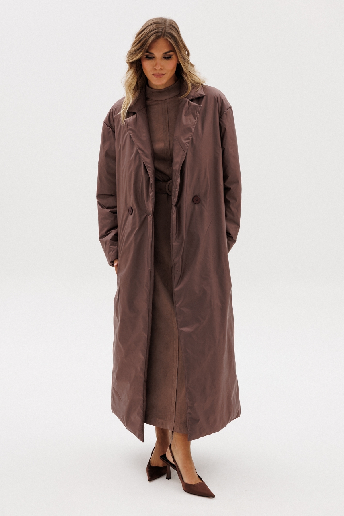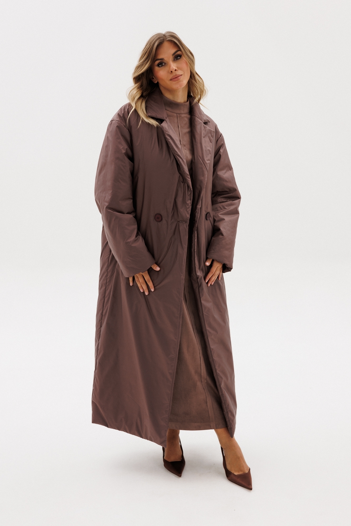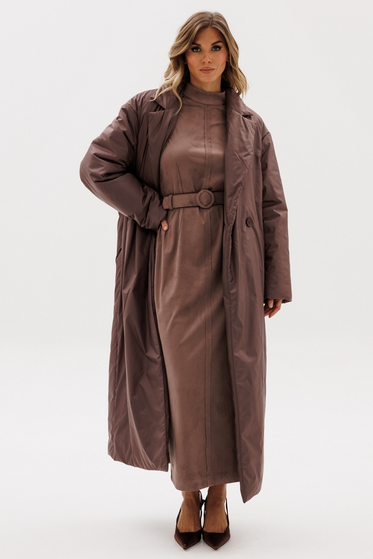 Пальто выполнено из плащевой ткани с утеплителем Isosoft. Пальто прямого силуэта, длиной до линии щиколотки. Спереди двубортная застежка на один ряд пуговиц и прорезные карманы в швах. Спинка со средним швом. Плечевой шов спущен. Воротник пиджачного типа. Рукав рубашечного покроя, двухшовный. Пальто на притачной по низу подкладке. Пояс из основной ткани входит в комплект.