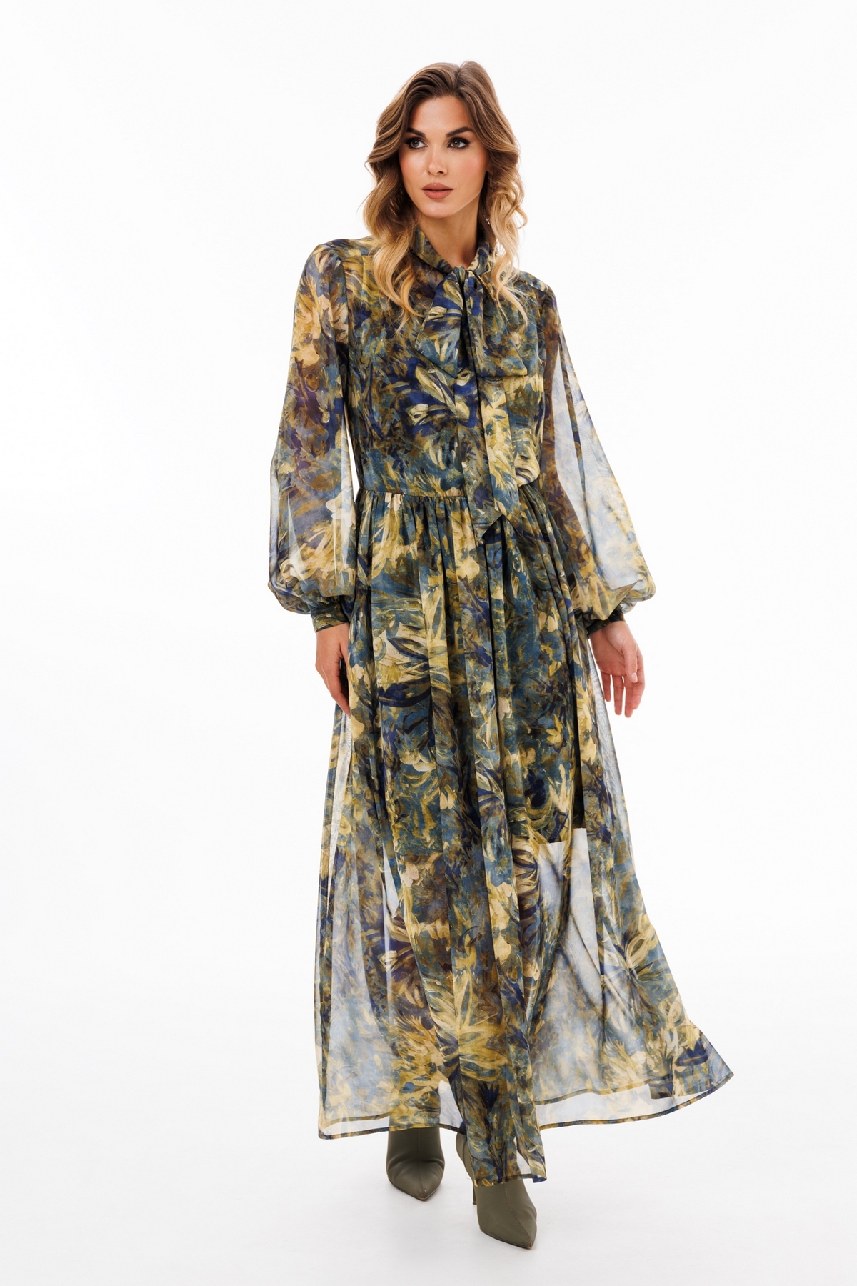 Платье выполнено из шифона с принтом. Платье Х-образного силуэта, отрезное по линии талии, длиной до щиколотки. Перед лифа и спинка цельные. Воротник-стойка переходящий в бант. Рукав втачной, одношовный, расширенный книзу. Низ рукава собран на сборку. Манжет застегивается на две прорезные петли и пуговицы. Платье присборено на эластичную тесьму по линии талии. Платье на подкладке.