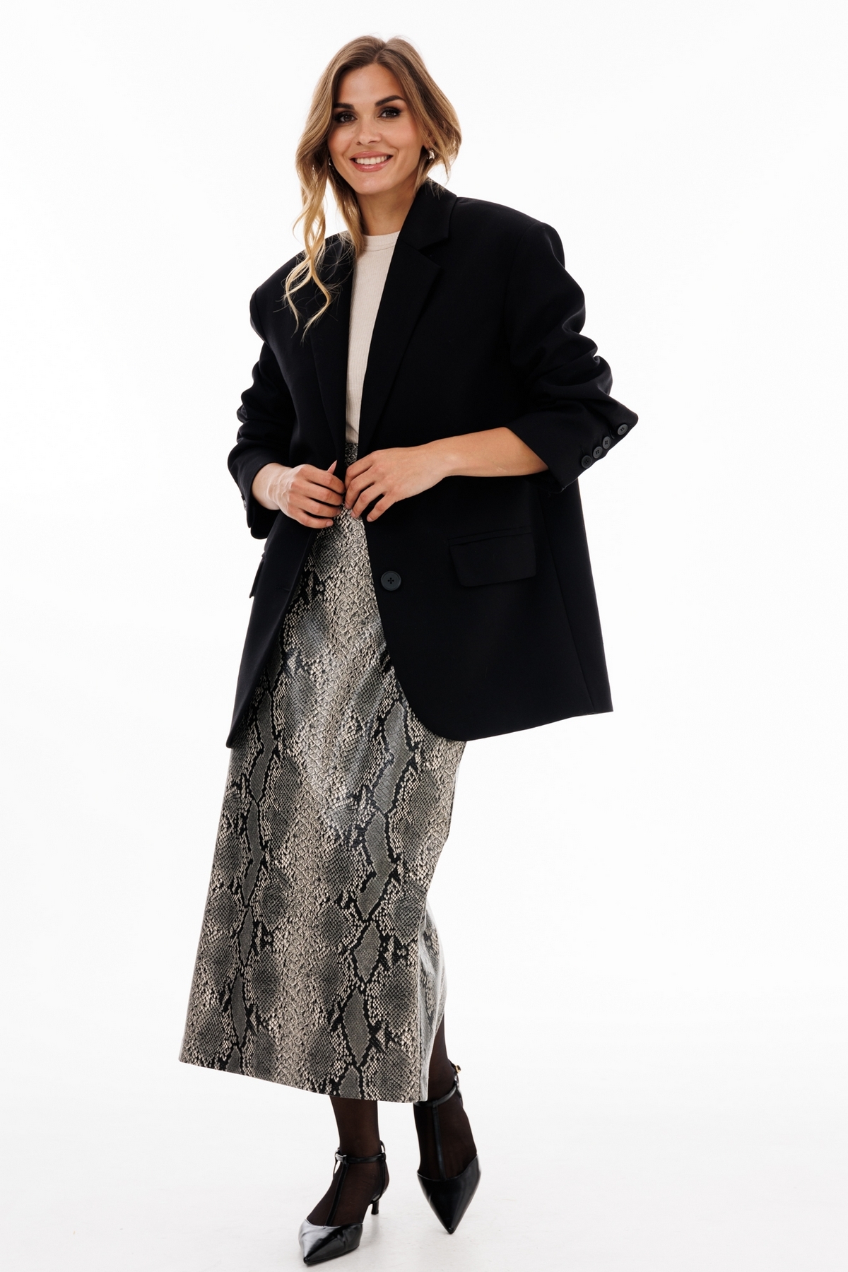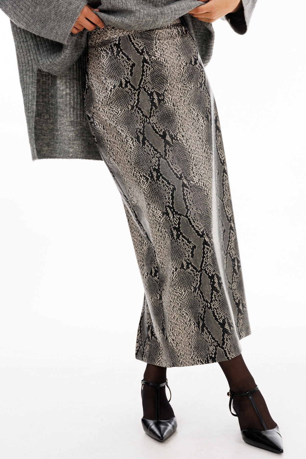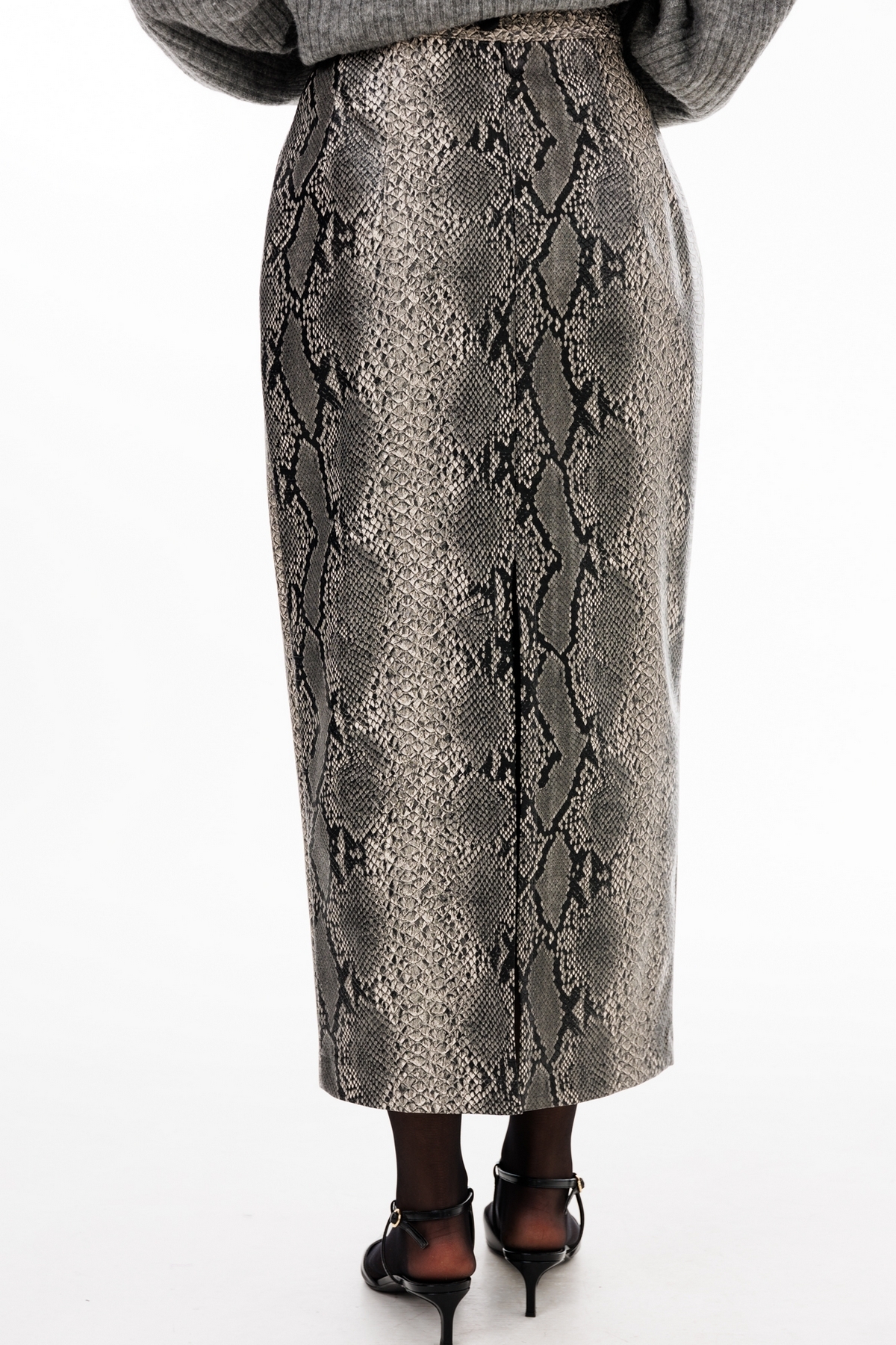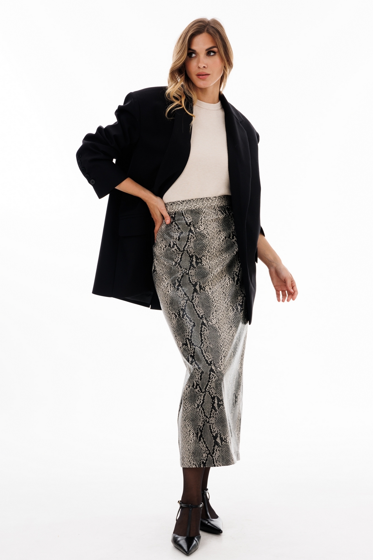 Юбка выполнена из искусственной кожи с анималистичным принтом. Юбка заужена к низу, на притачном поясе, длиной миди. Застежка сзади на потайную молнию и пуговицу. Сзади в среднем шве разрез. Юбка на отлетной по низу подкладке.