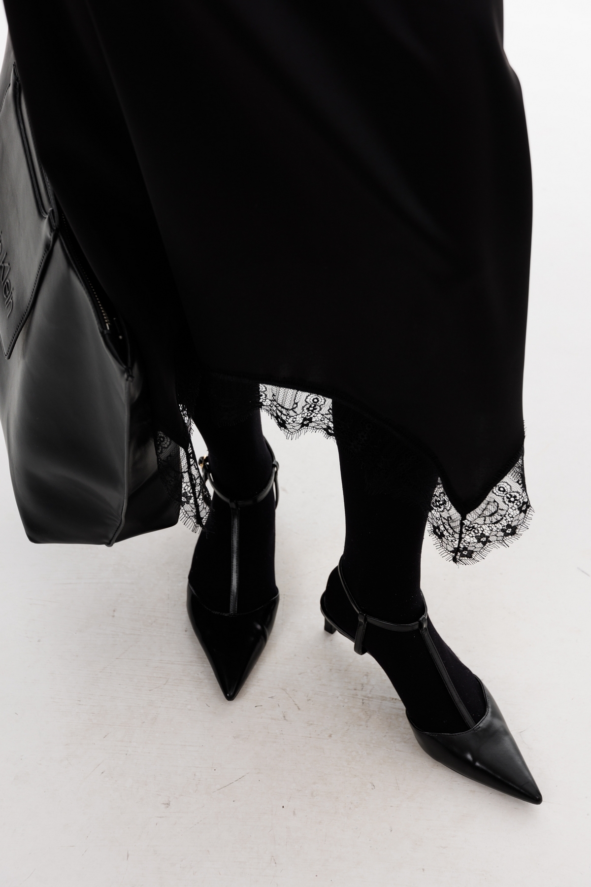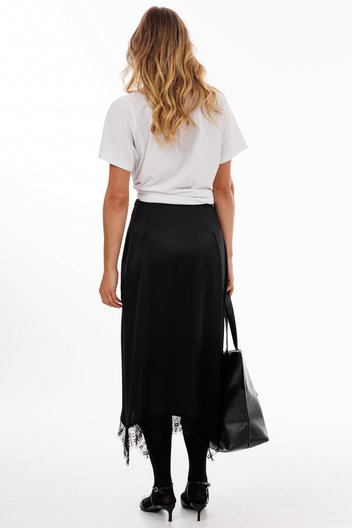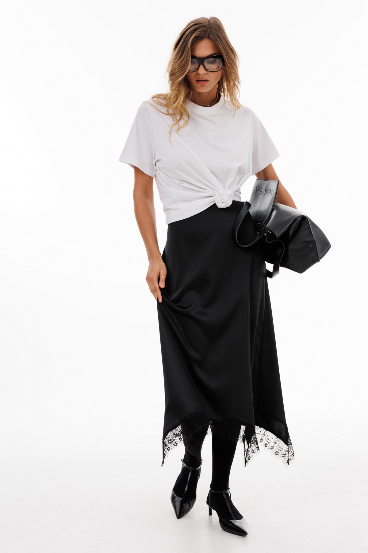 Юбка выполнена из атласа. Юбка А-образного силуэта, длиной миди. Переднее и заднее полотнище цельные и расширены к низу. Низ юбки фигурной формы, обработан кружевом. ВЗастежка в левом боковом шве на потайную молнию и пуговицу. Юбка без подкладки.
