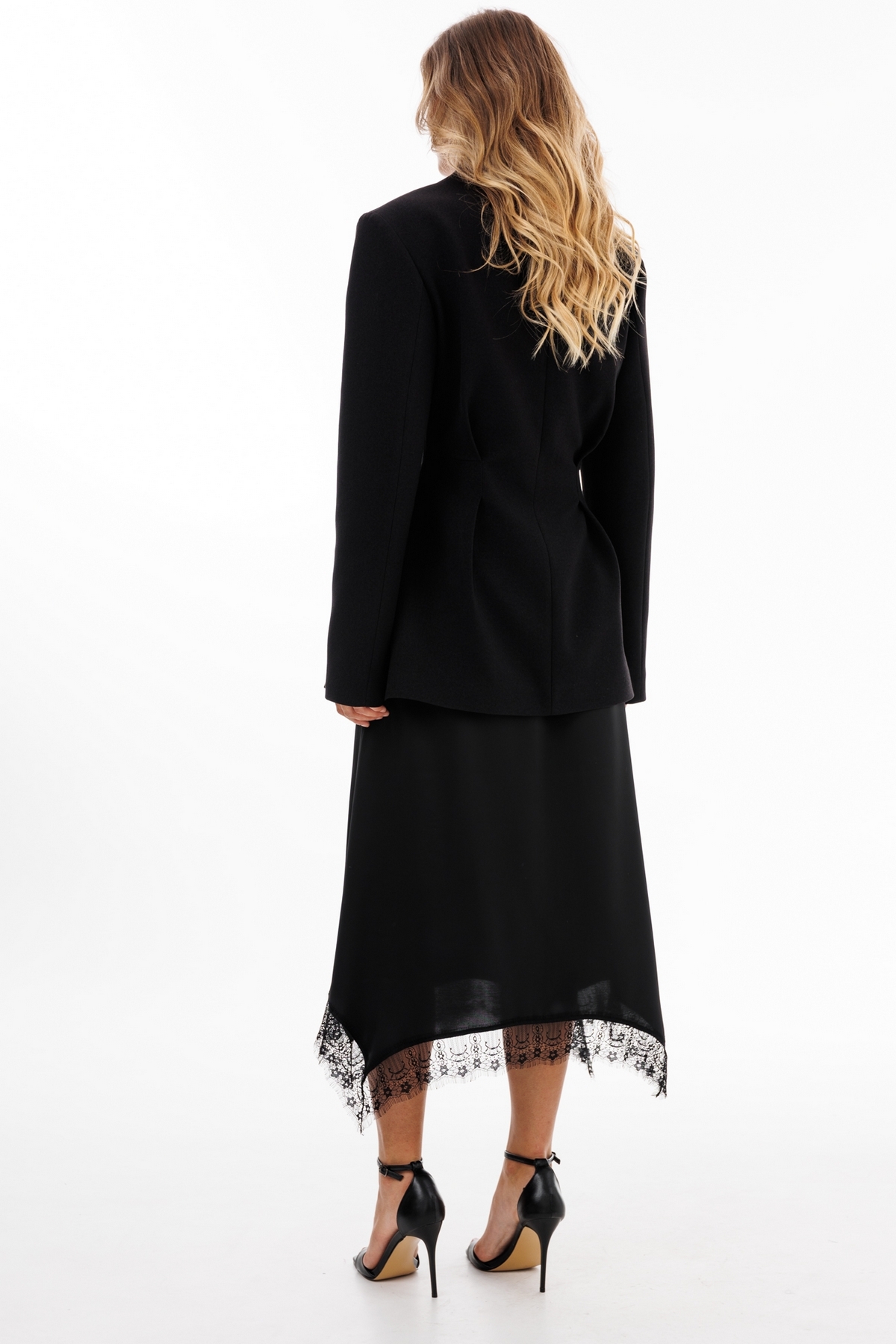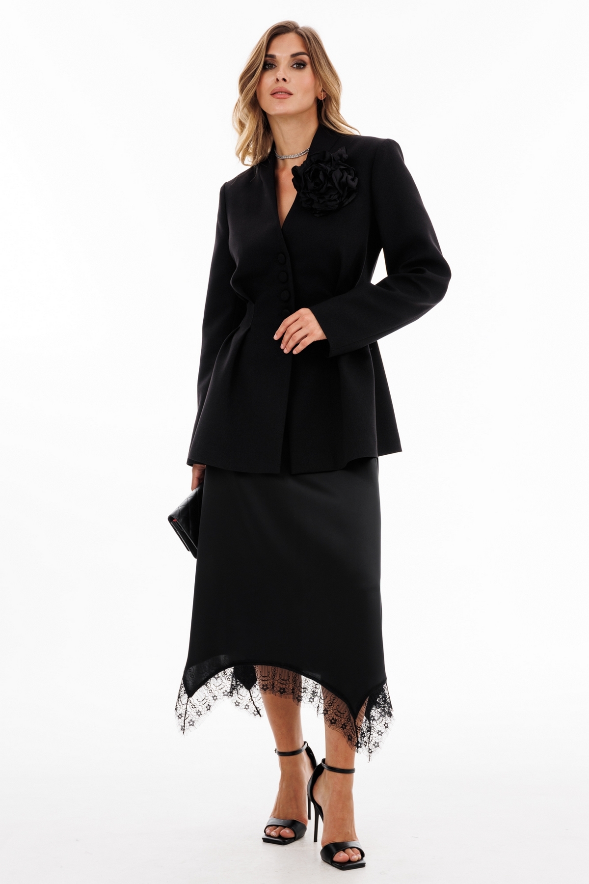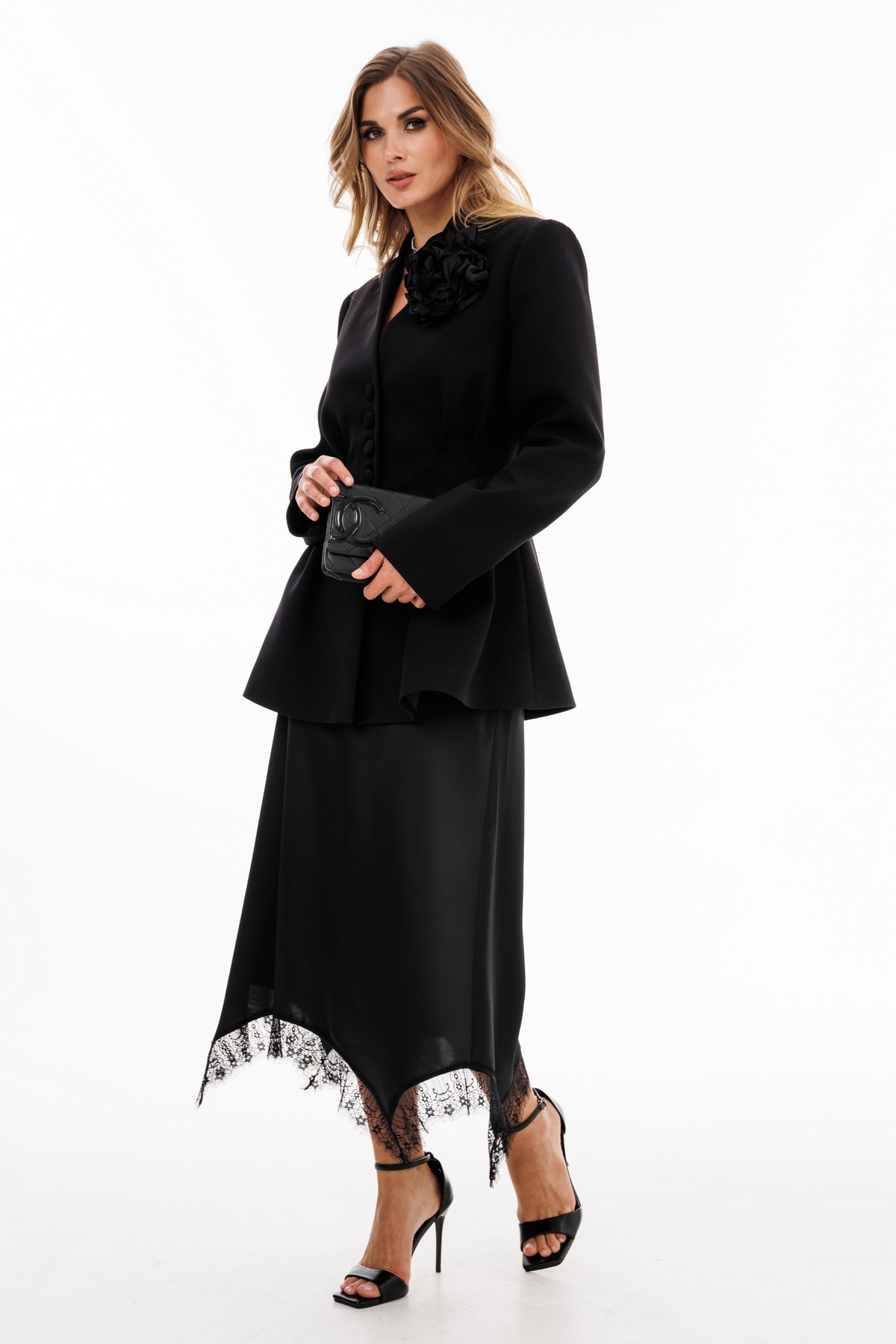Юбка выполнена из атласа. Юбка А-образного силуэта, длиной миди. Переднее и заднее полотнище цельные и расширены к низу. Низ юбки фигурной формы, обработан кружевом. ВЗастежка в левом боковом шве на потайную молнию и пуговицу. Юбка без подкладки.