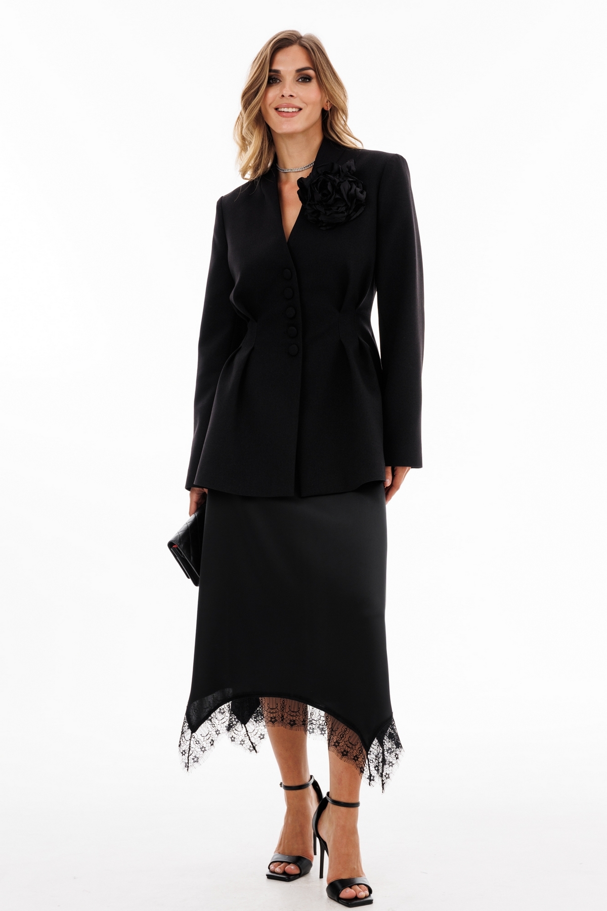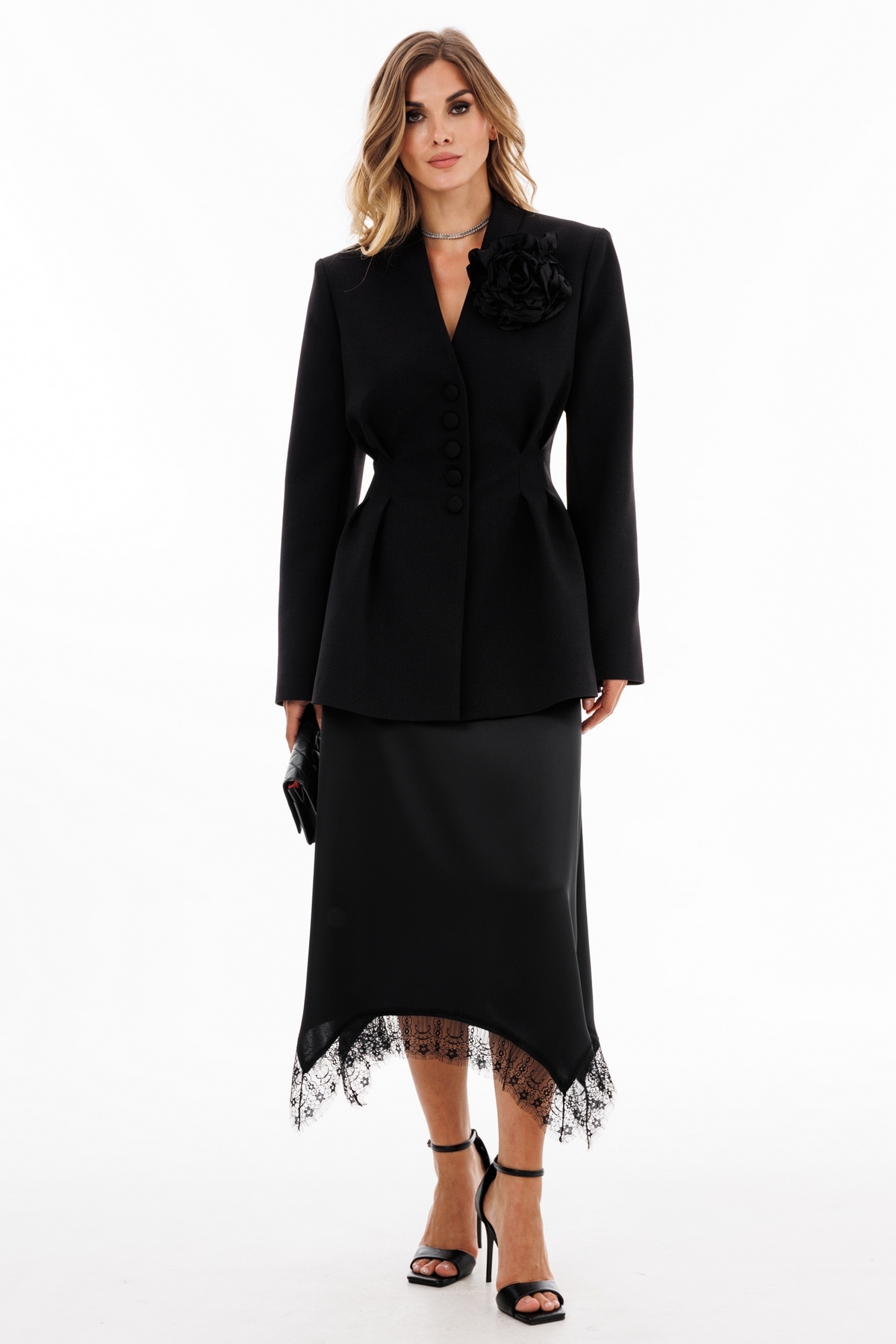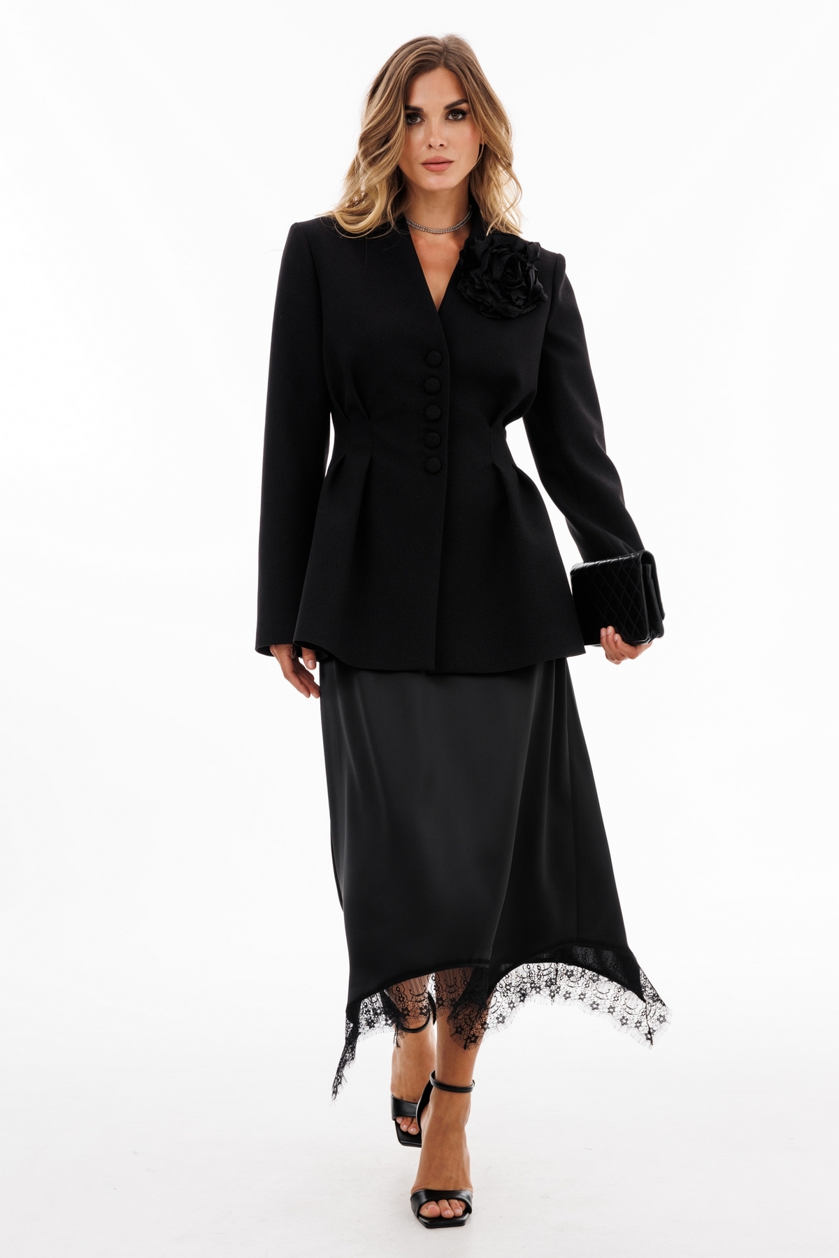 Юбка выполнена из атласа. Юбка А-образного силуэта, длиной миди. Переднее и заднее полотнище цельные и расширены к низу. Низ юбки фигурной формы, обработан кружевом. ВЗастежка в левом боковом шве на потайную молнию и пуговицу. Юбка без подкладки.