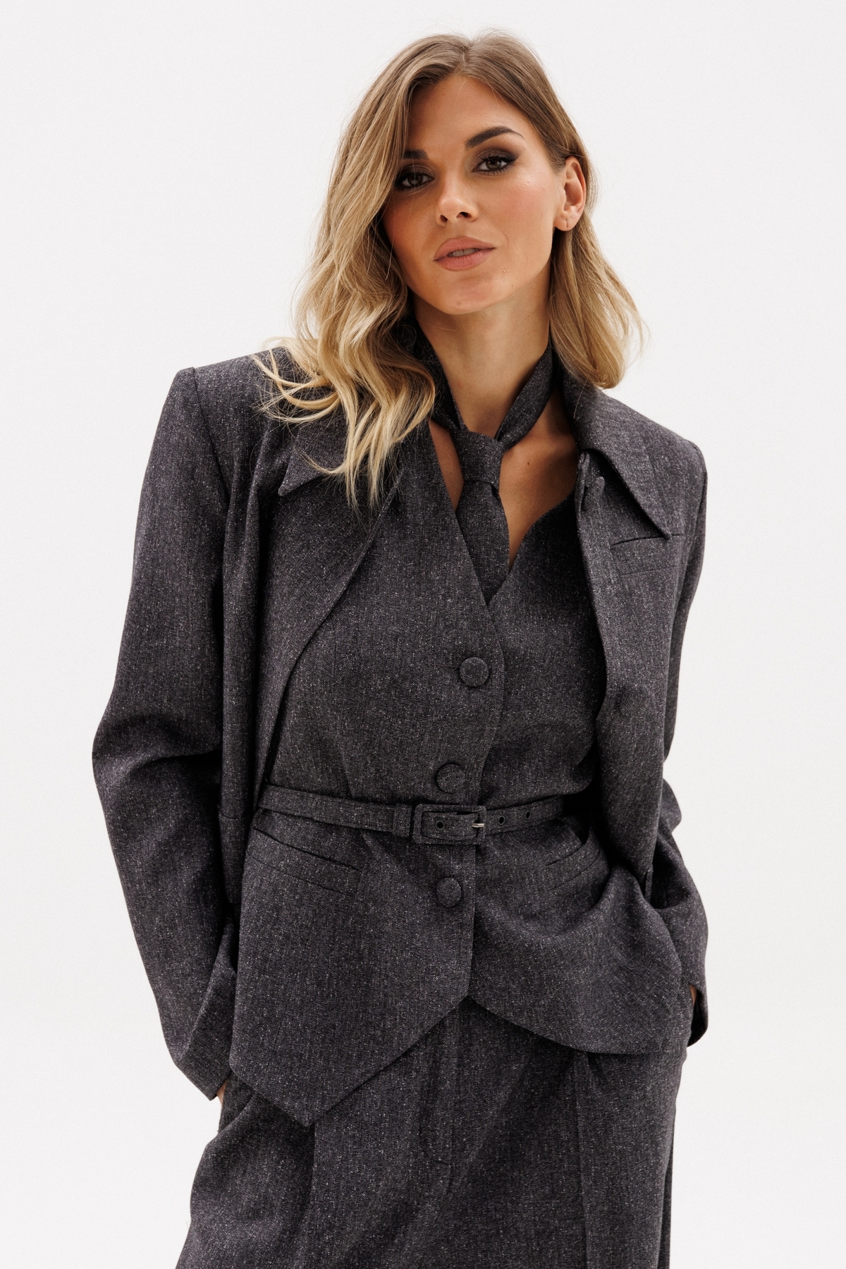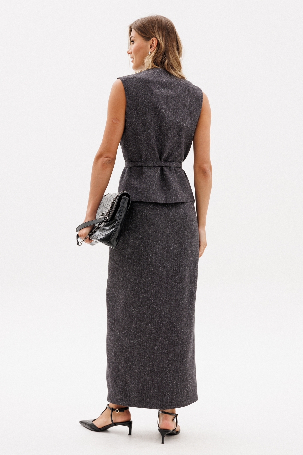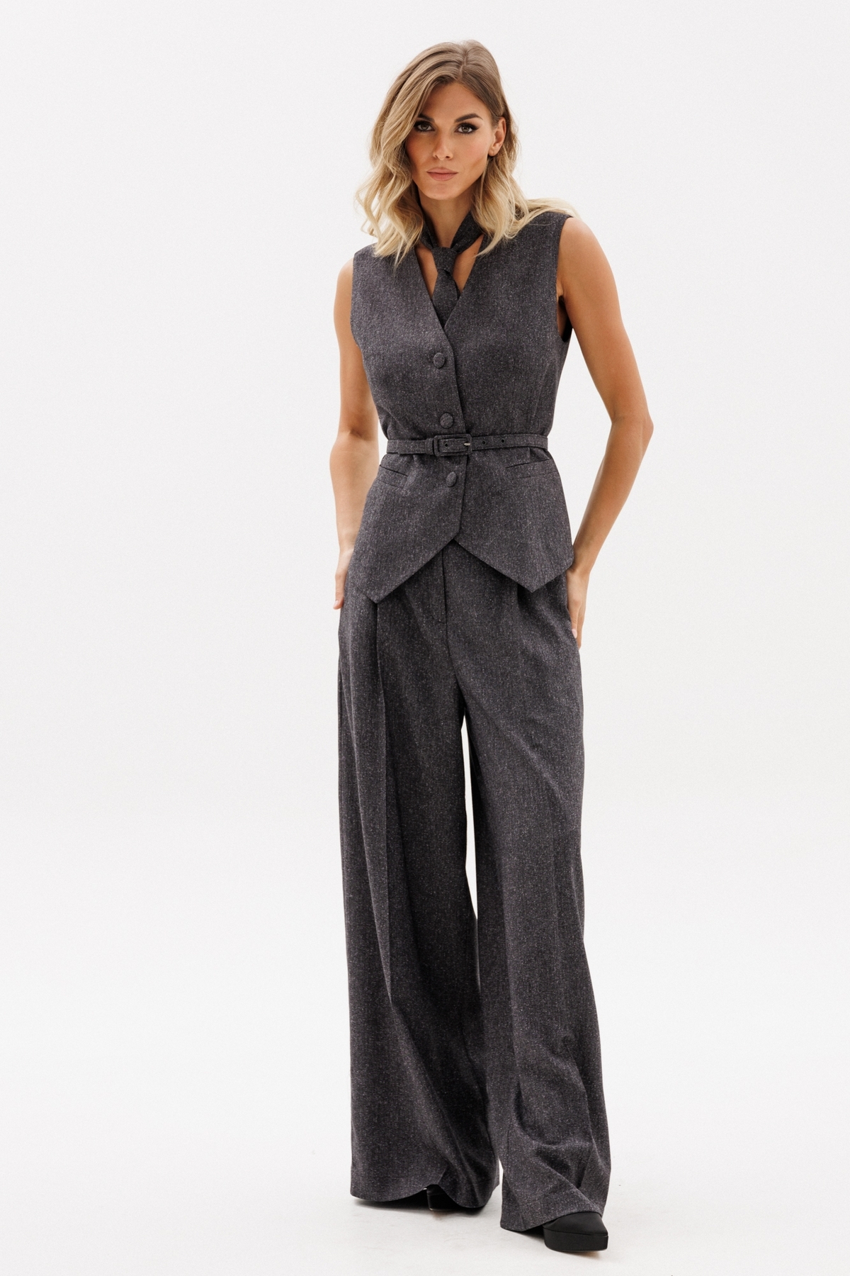 Жилет выполнен из костюмной ткани меланж. Жилет полуприлегающего силуэта, длиной до линии бедер. Низ жилета фигурной формы. Спереди декоративные карманы и центральная застежка на пуговицы. Горловина переда V-образной формы. Жилет на притачной по низу подкладке. В комплект входит ремень из основной ткани с обтяжной пряжкой.