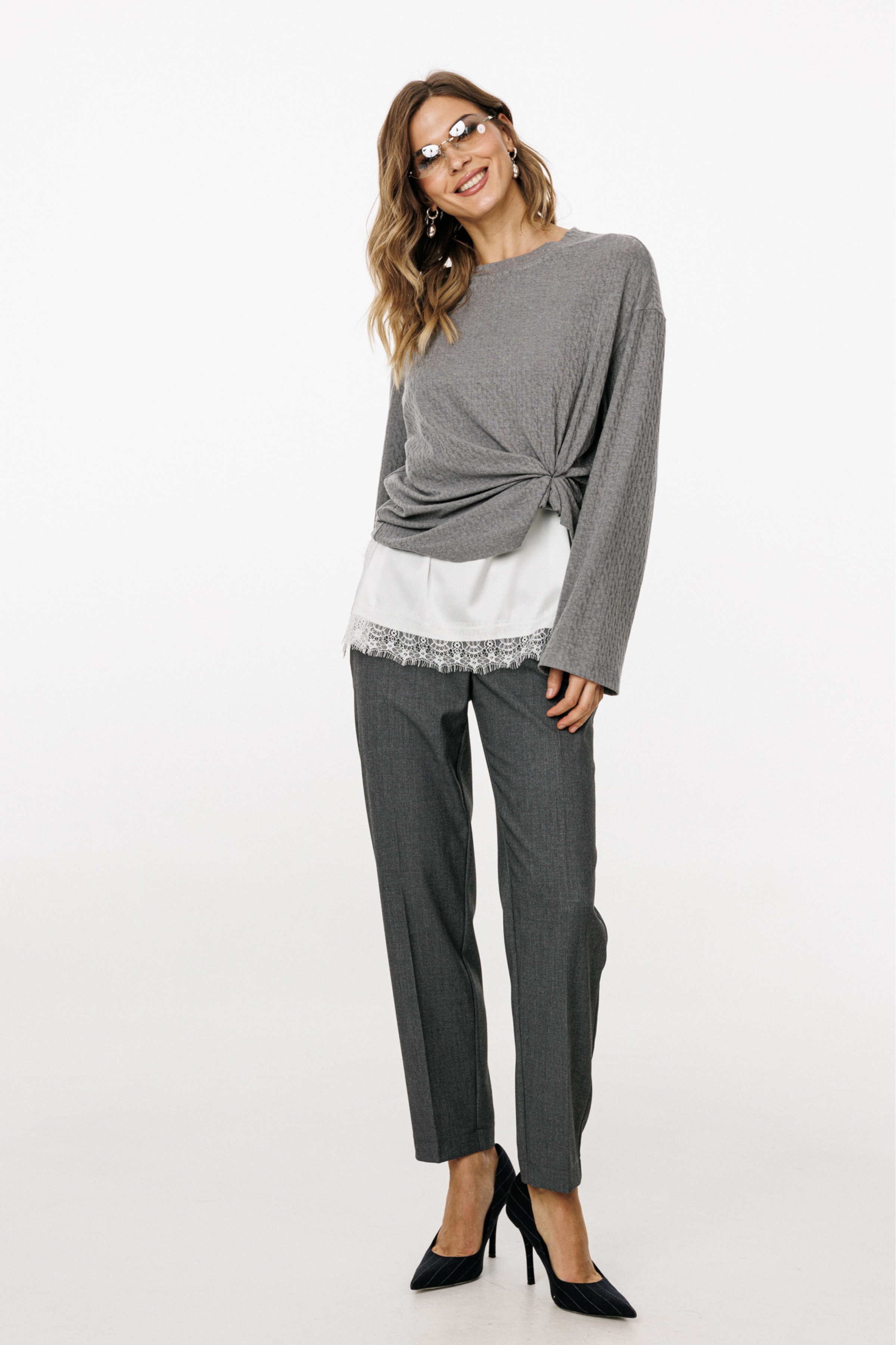 Брюки выполнены из костюмной ткани. Брюки заужены к низу, длиной 7/8, на притачном поясе. Спереди боковые карманы с наклонным входом и застежка на пуговицу и молнию. Сзади таллиевые вытачки и декоративные прорезные карманы. По задней части пояса эластичная тесьма.