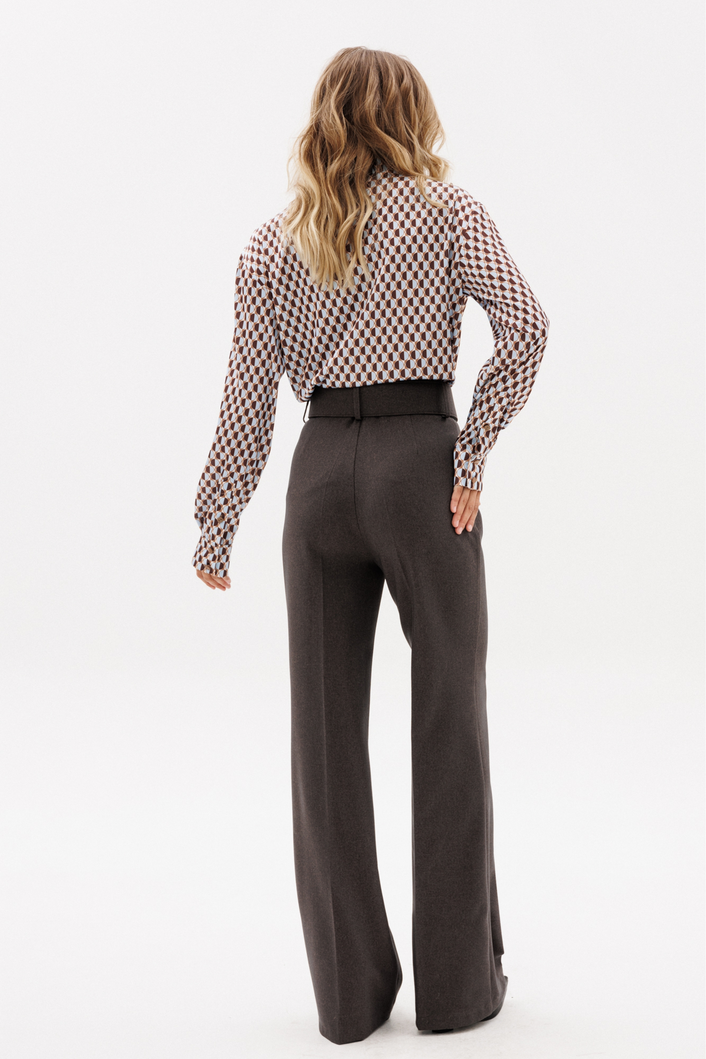 Брюки выполнены из костюмной ткани. Брюки покроя ""клеш"", на притачном поясе, длиной в пол. Спереди застежка на молнию с гульфиком, потайную пуговицу и два брючных крючка. Передние и задние части брюк заутюжены на кант. В комплект входит съемный пояс из основной ткани.