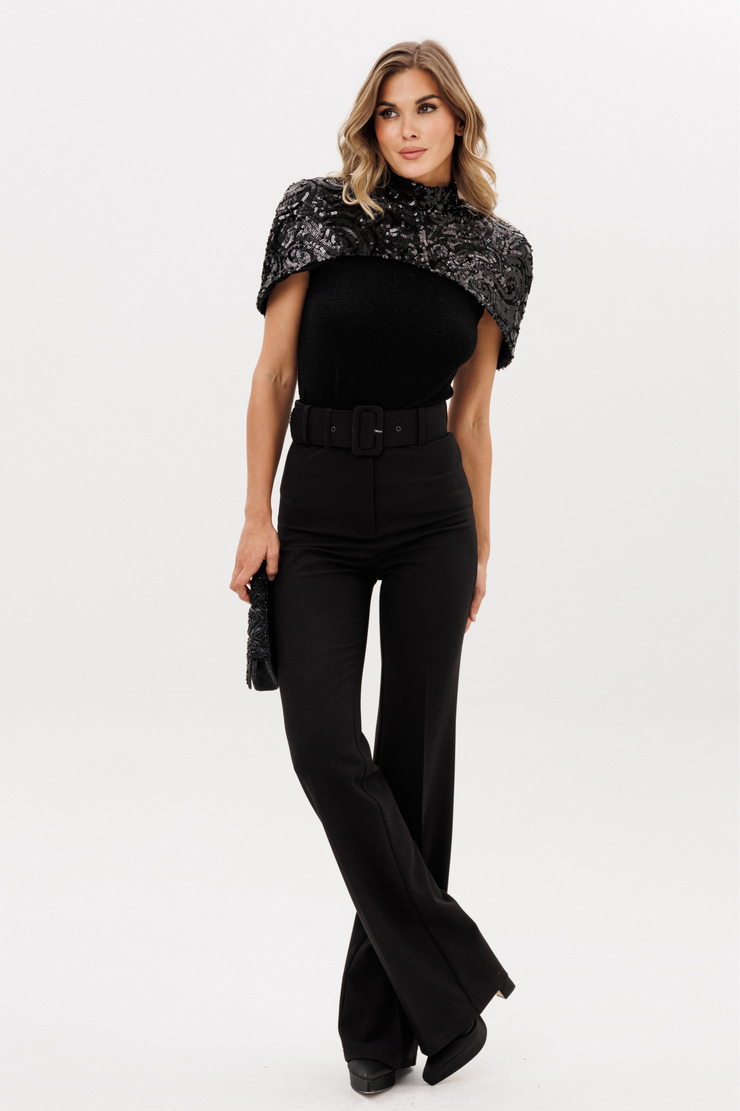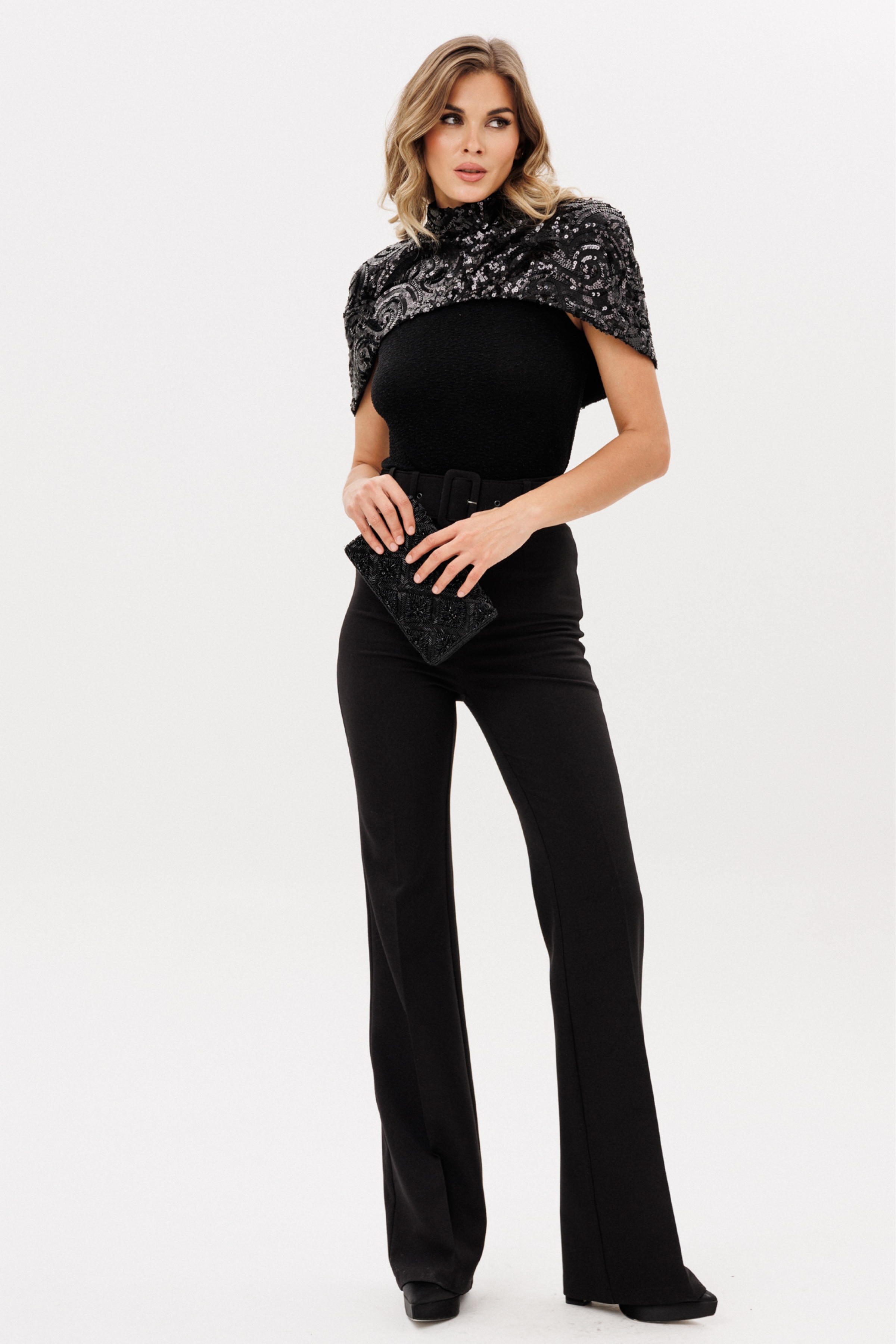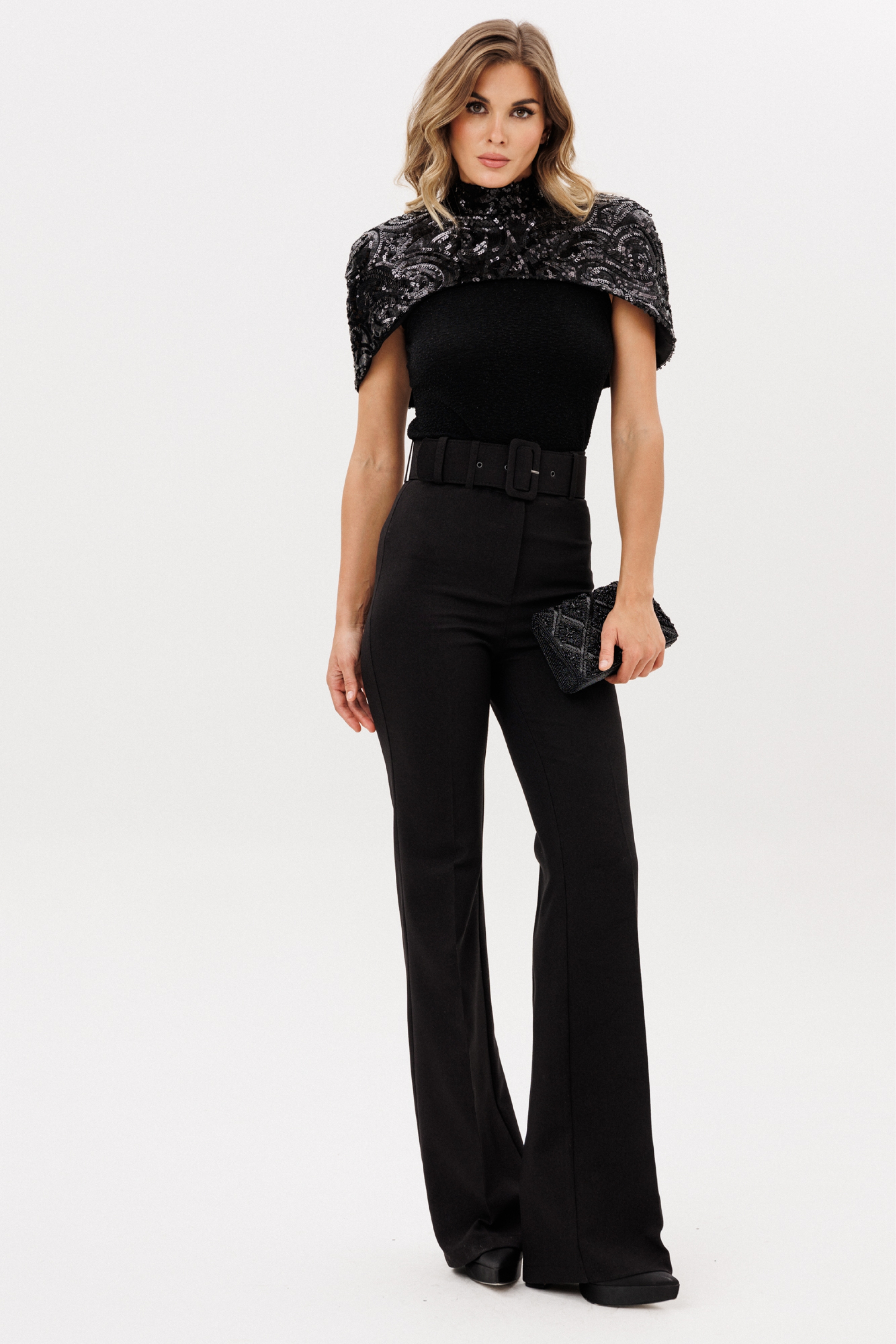 Брюки выполнены из костюмной ткани. Брюки покроя "клеш", на притачном поясе, длиной в пол. Спереди застежка на молнию с гульфиком, потайную пуговицу и два брючных крючка. Передние и задние части брюк заутюжены на кант. В комплект входит съемный пояс из основной ткани.