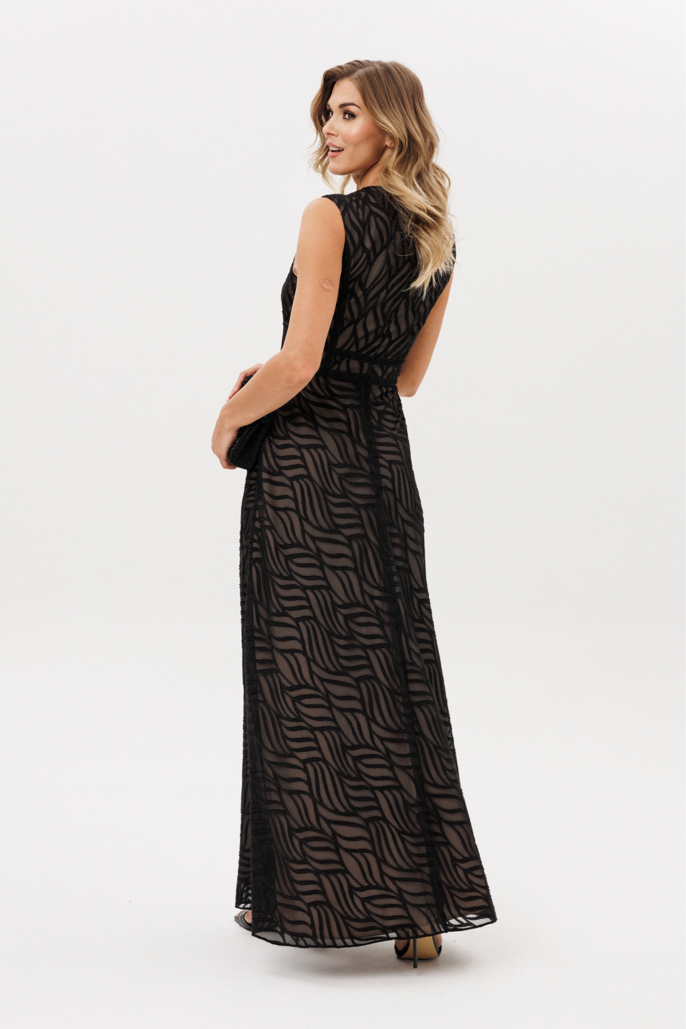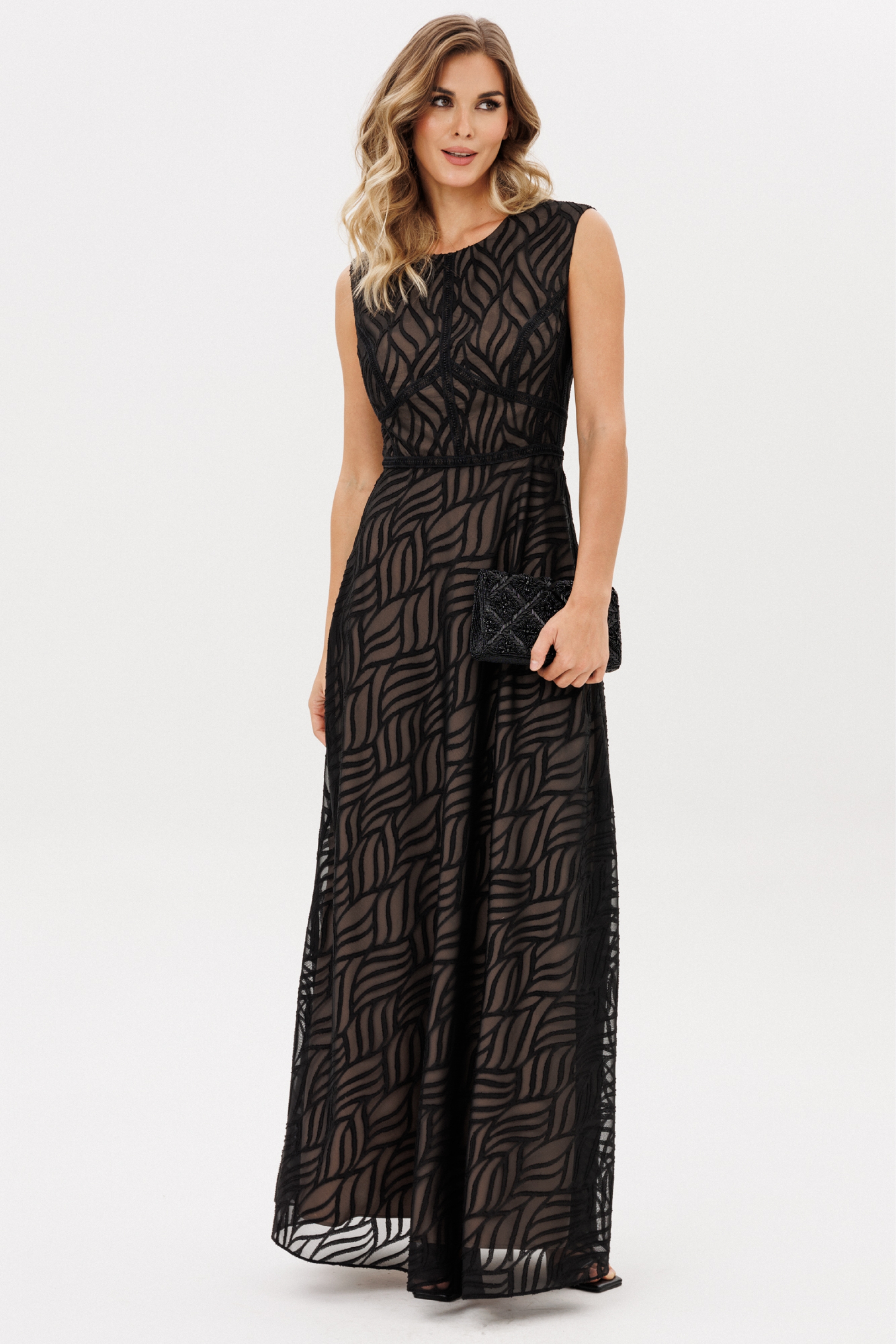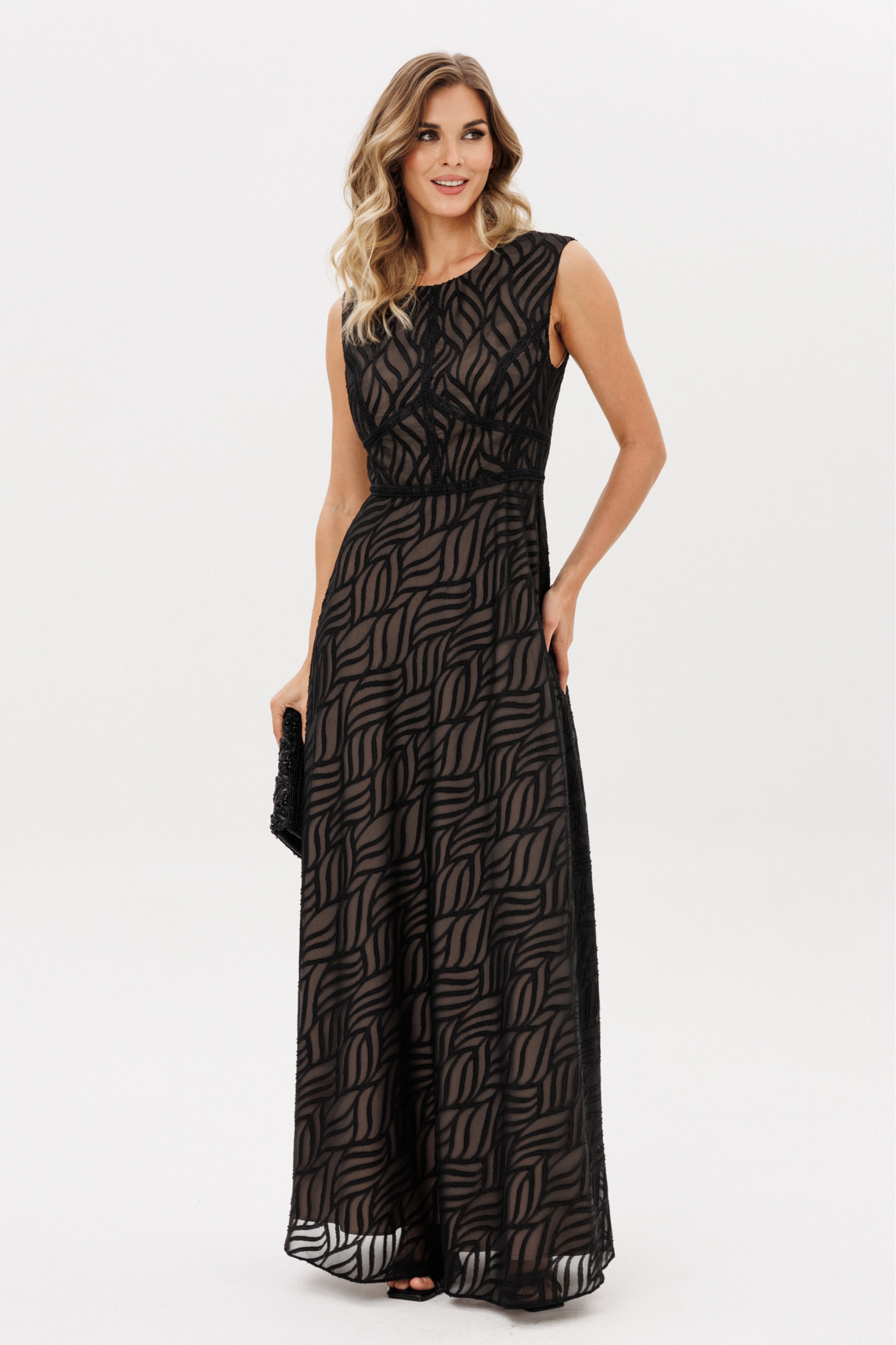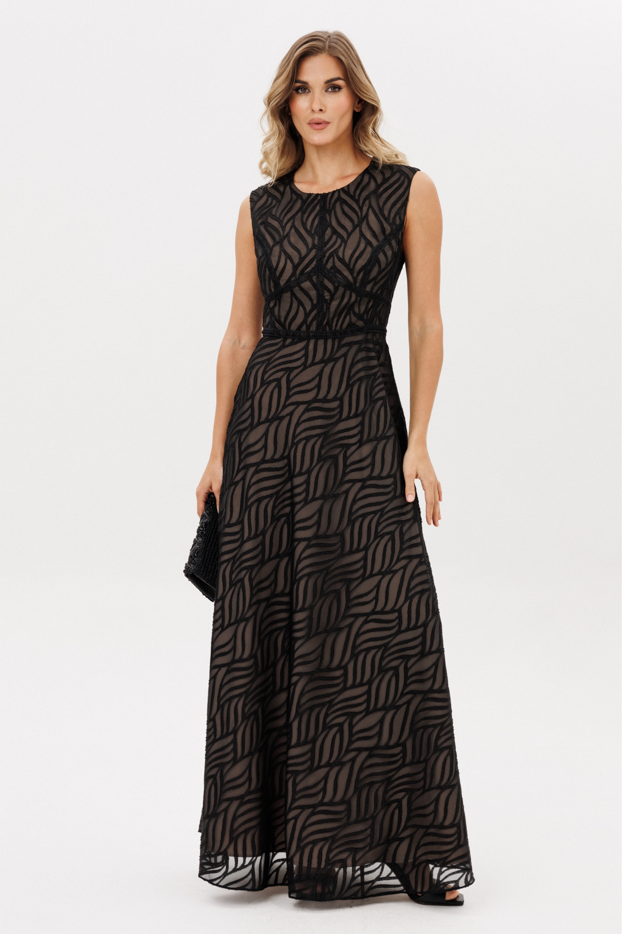 Платье выполнено из шифона с жаккардовым рисунком. Платье Х-образного силуэта, отрезное по линии талии, длиной миди. Спереди средний шов и горизонтальный подрез. Застежка на потайную молнию сзади в среднем шве спинки и юбки. Горловина округлой формы. Юбка расширена к низу и выкроена по косой. Платье декорировано настрочной тесьмой по всем резным линиям лифа и линии талии. Платье на отлетной по низу подккладке телесного цвета.