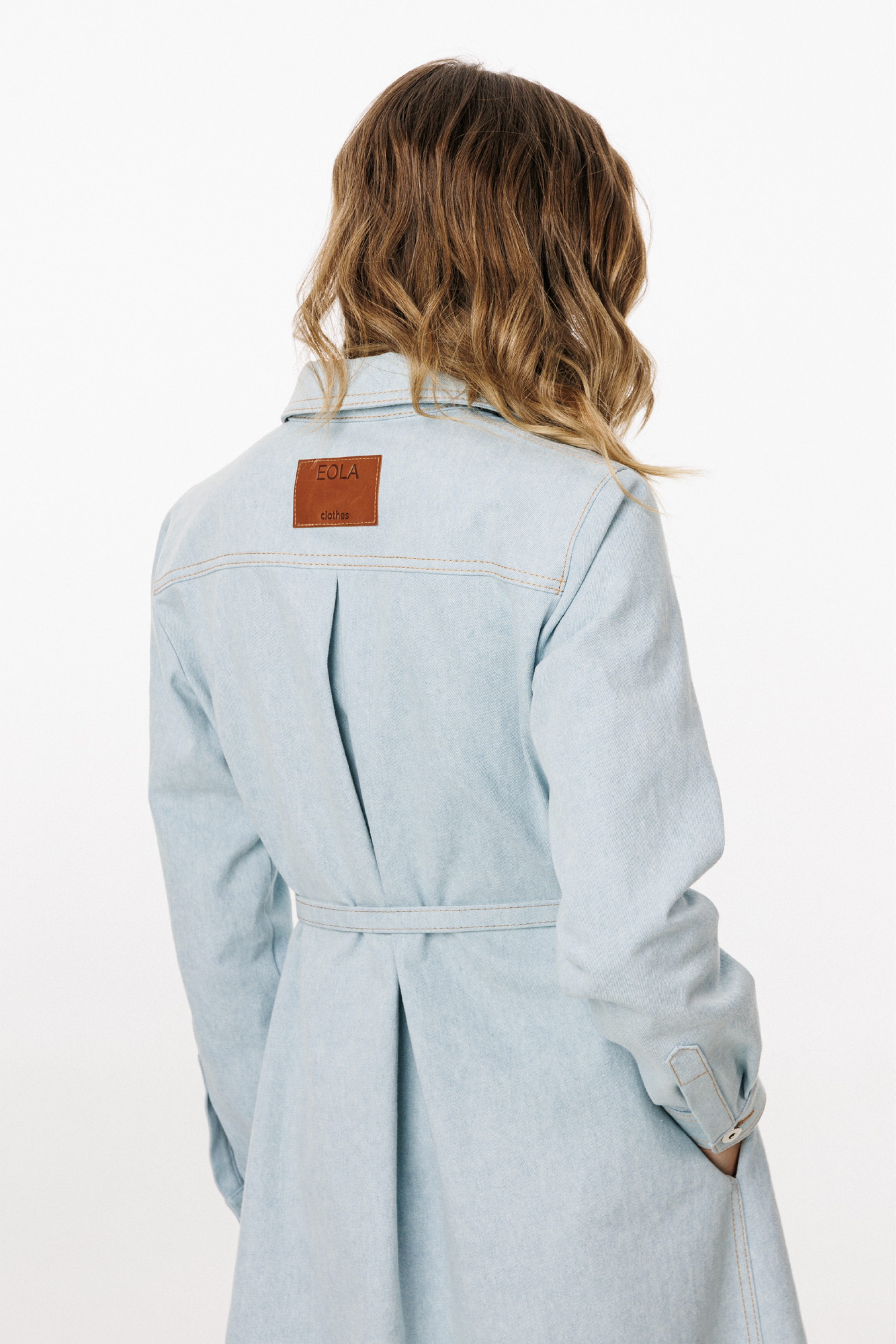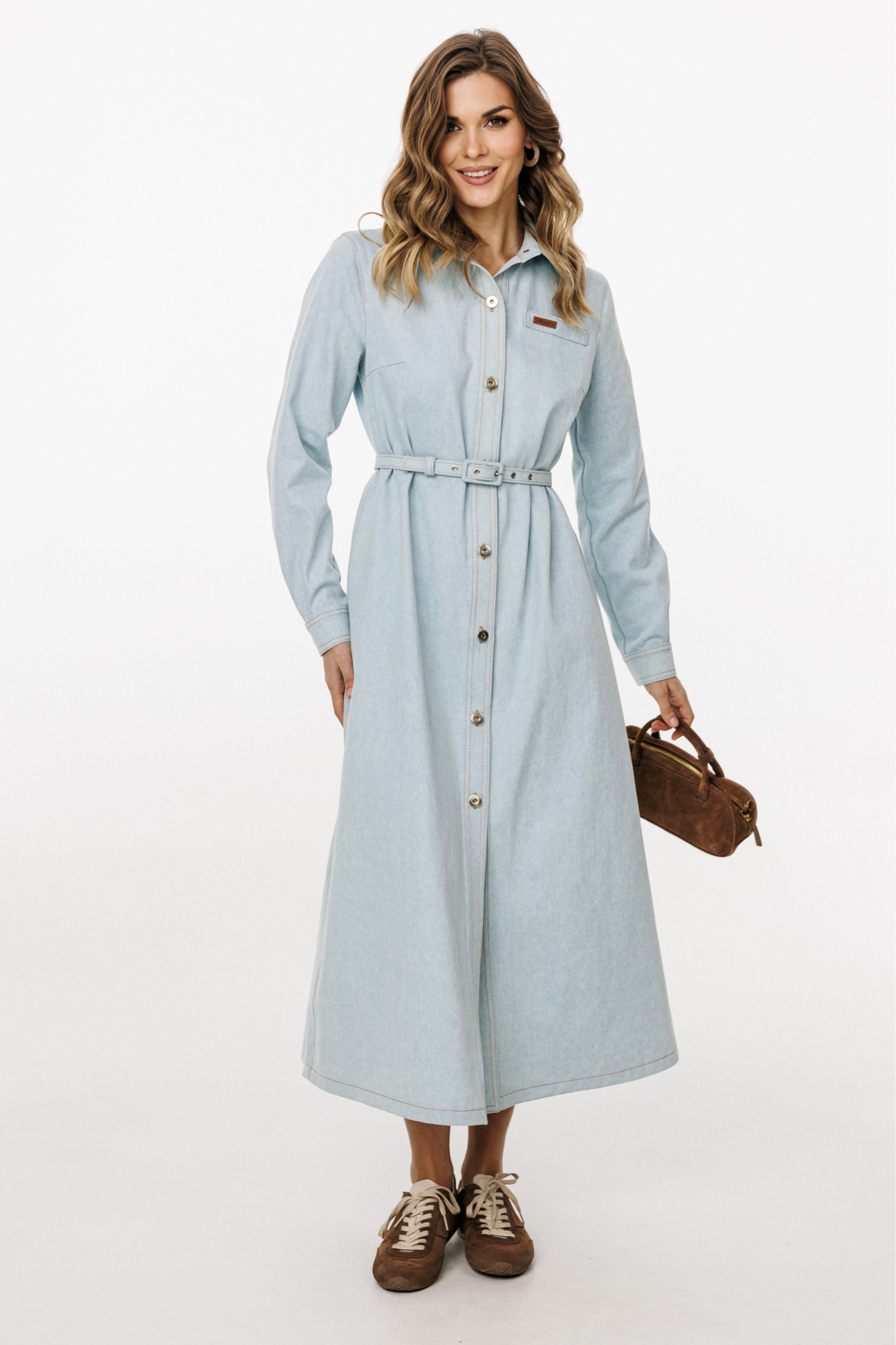 Платье выполнено из плотного джинса. Платье А-образного силуэта, длиной миди. Застежка спереди на металлические пробивные пуговицы. На спинке кокетка и встречная складка от нее. Воротник стояче-отложной с отрезной стойкой. Рукав втачной, одношовный, с прорезью и складками по низу. Низ рукава на манжете, застегивающейся на пуговицу. В боковых швах карманы. Платье декорировано нашивками из натуральной кожи по переду и спинке.