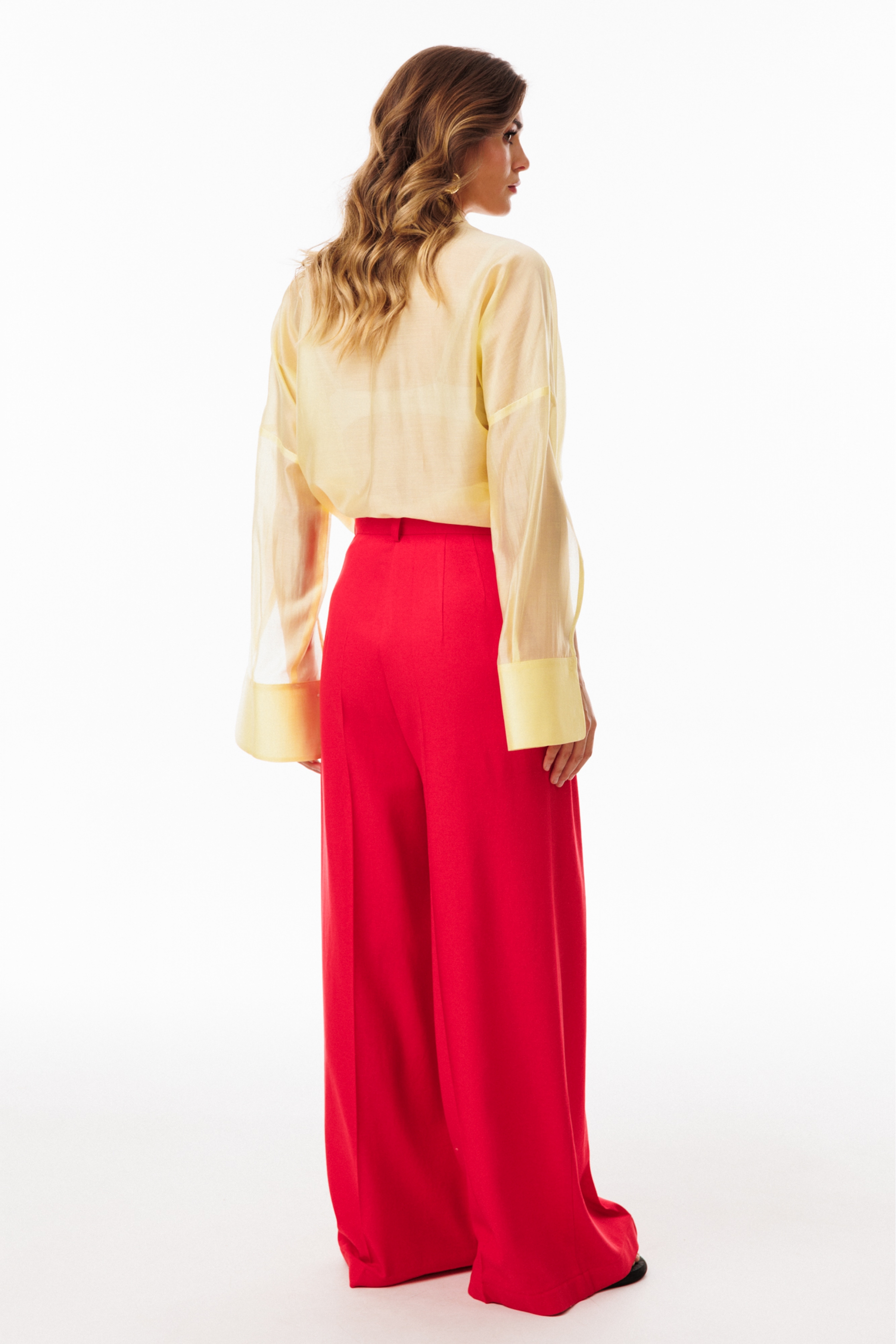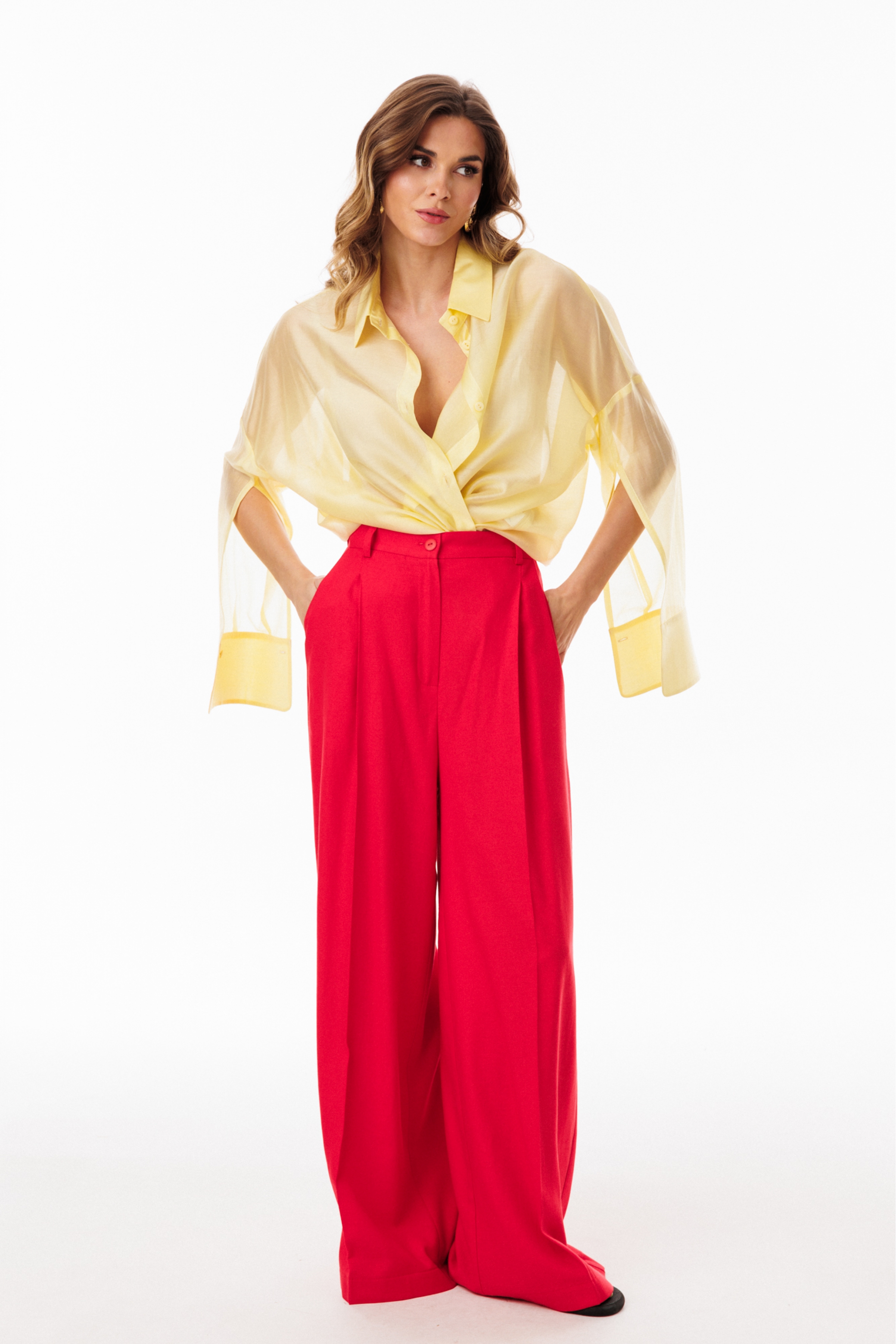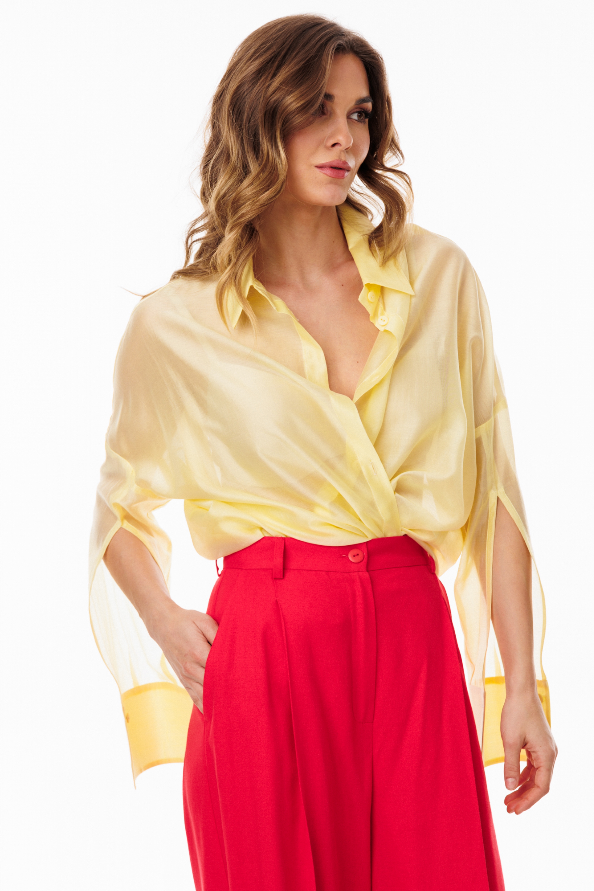 Блузка выполнена из плательно-блузочной ткани. Блузка прямого силуэта, покроя оверсайз, длиной ниже линии бедер. Спереди центральная застежка на пуговицы. Спинка цельная, длиннее переда. Воротник стояче-отложной. Плечевой шов спущен. Рукав рубашечного покроя, двухшовный, с прорезью по переду. Низ рукава на притачной манжете, застегивающейся на пуговицу. В боковых швах разрезы.