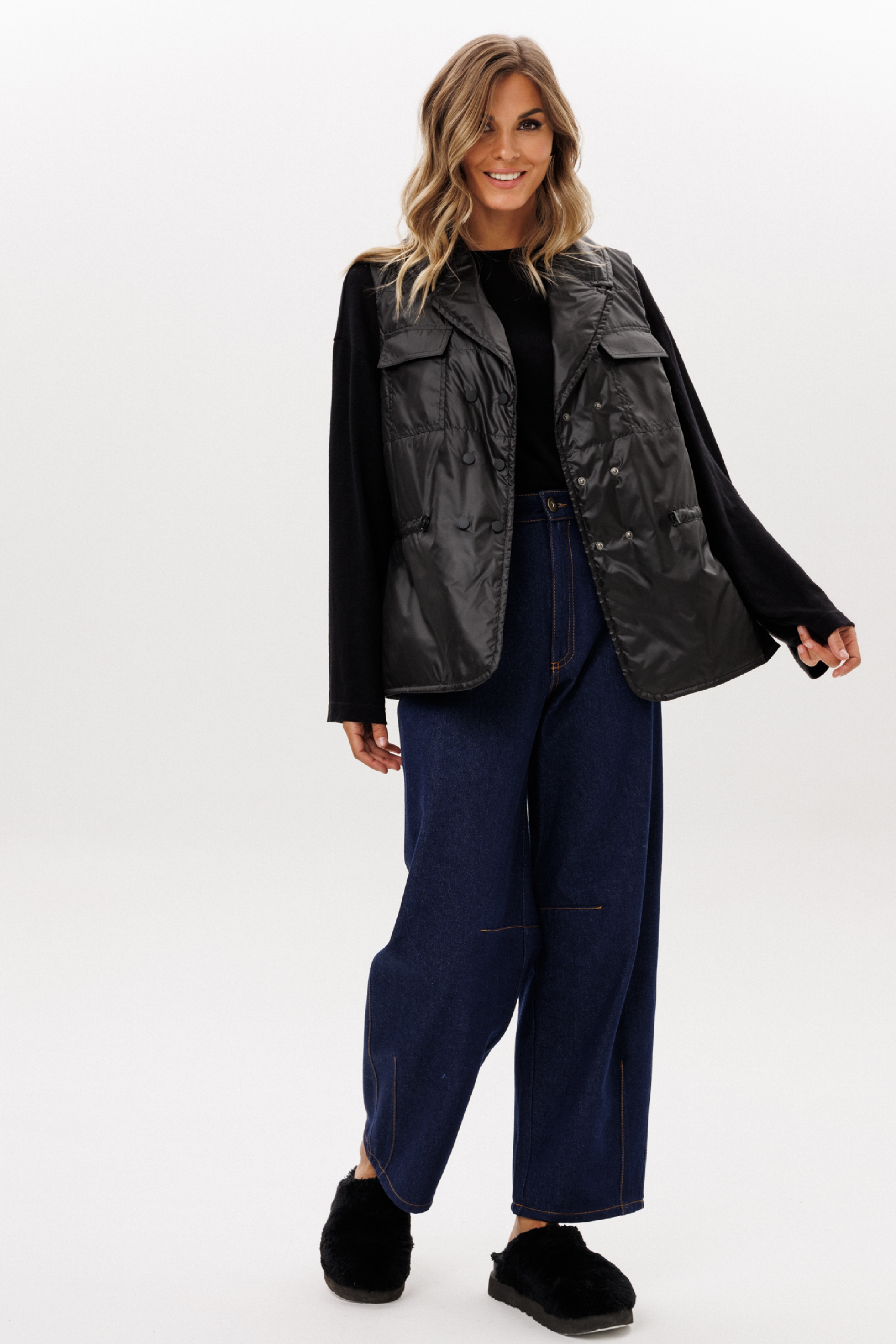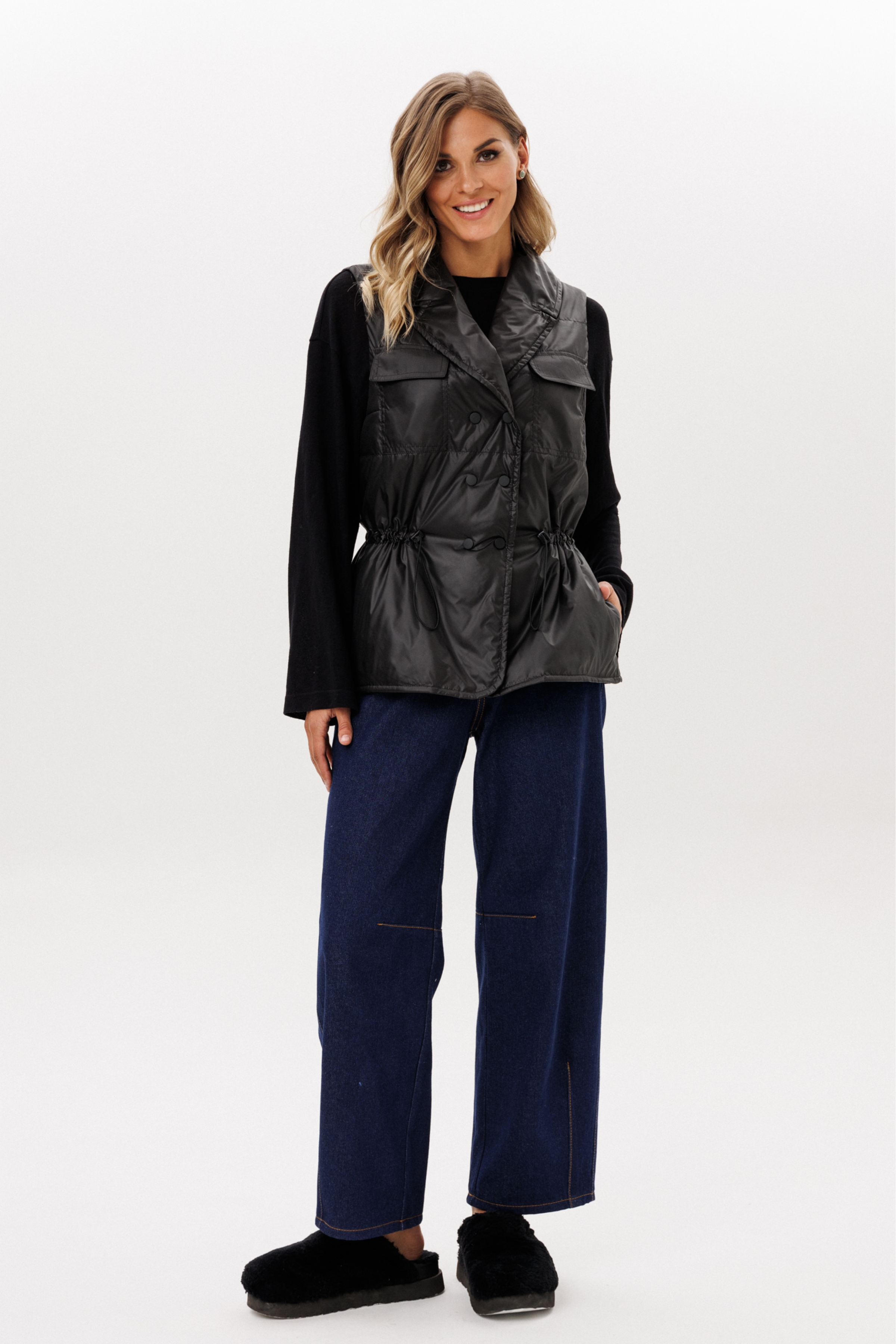Джинсы-багги выполнены из плотного джинса. Брюки на притачном поясе, длиной до линии щиколотки, расширенные от бедер и слегка зауженные к низу. Спереди боковые карманы с фигурным входом. Застежка на пуговицу и молнию с гульфиком. На задних частях кокетки и накладные карманы. На передней и задней части коленные вытачки.