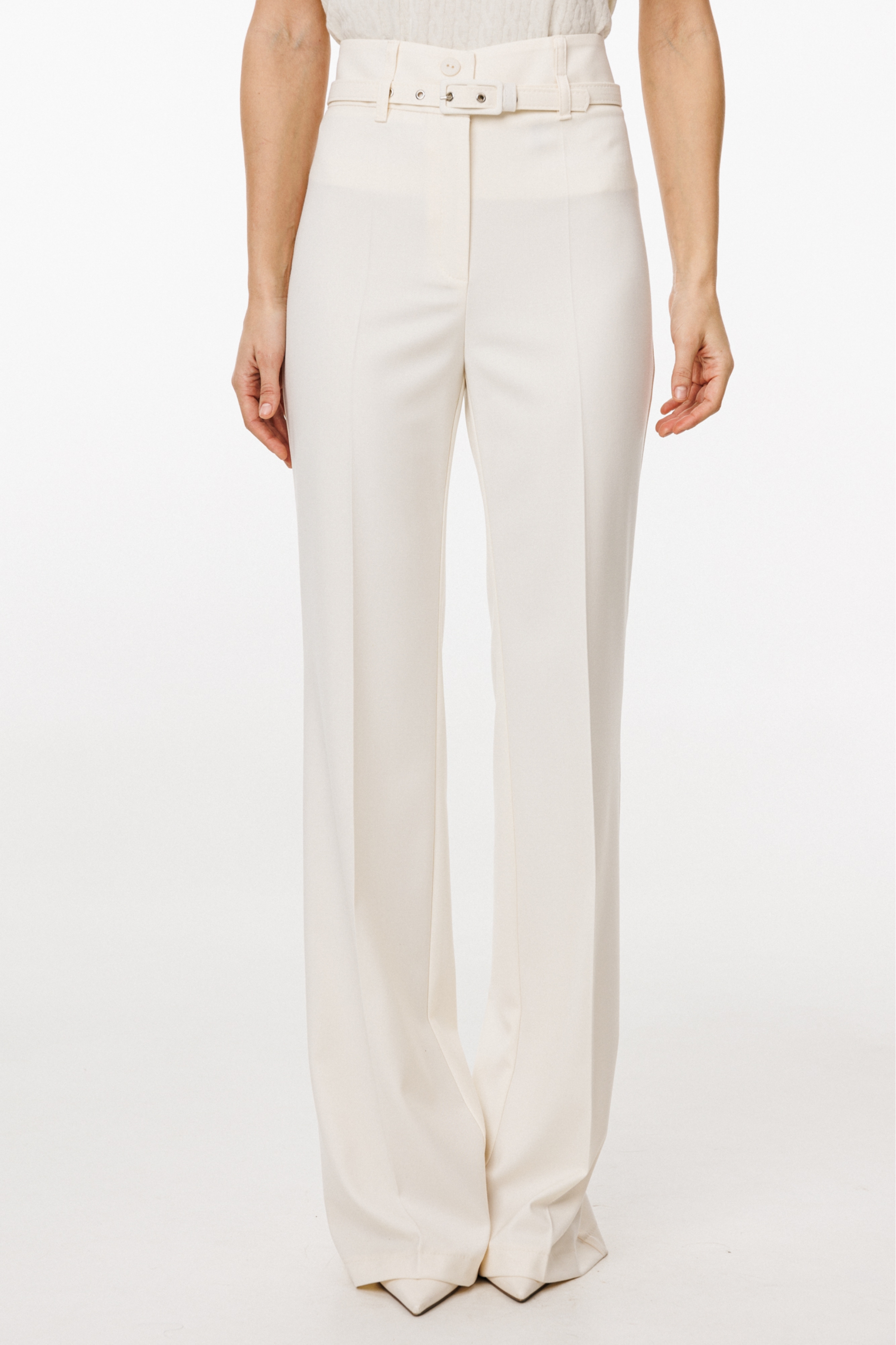 Брюки выполнены из костюмной ткани. Брюки покроя ""клеш"", на притачном поясе, длиной в пол. Спереди застежка на молнию с гульфиком, потайную пуговицу и два брючных крючка. Передние и задние части брюк заутюжены на кант.