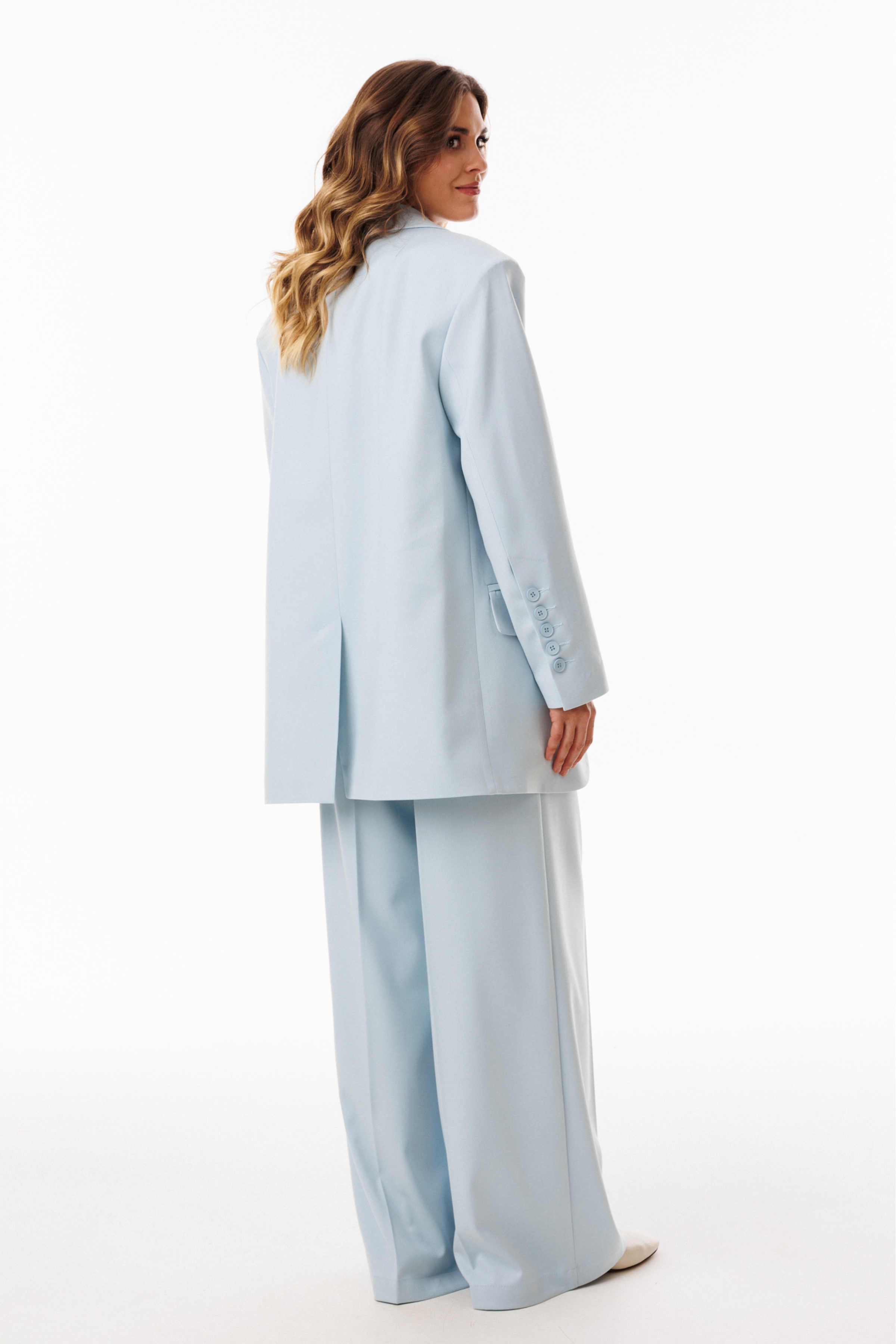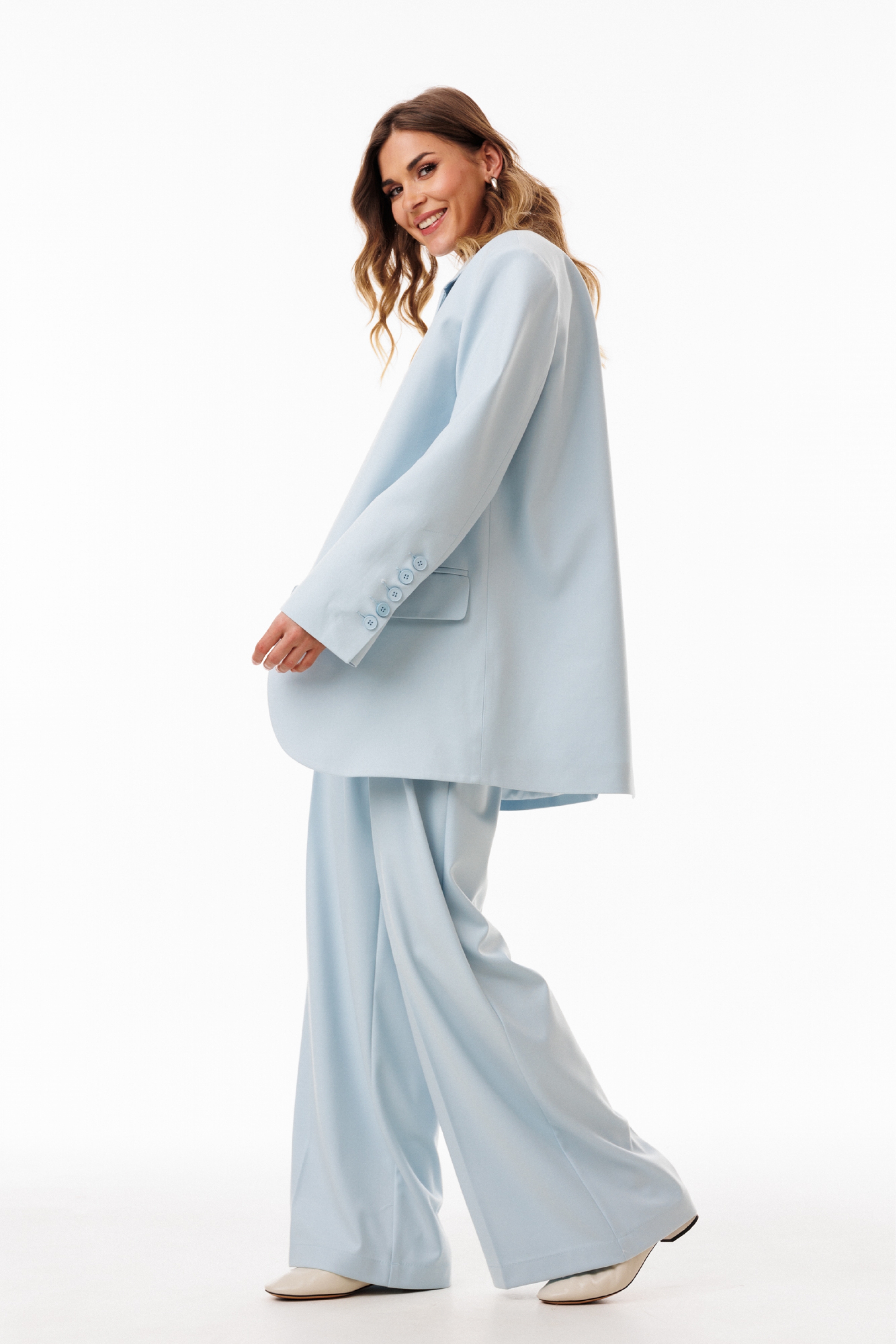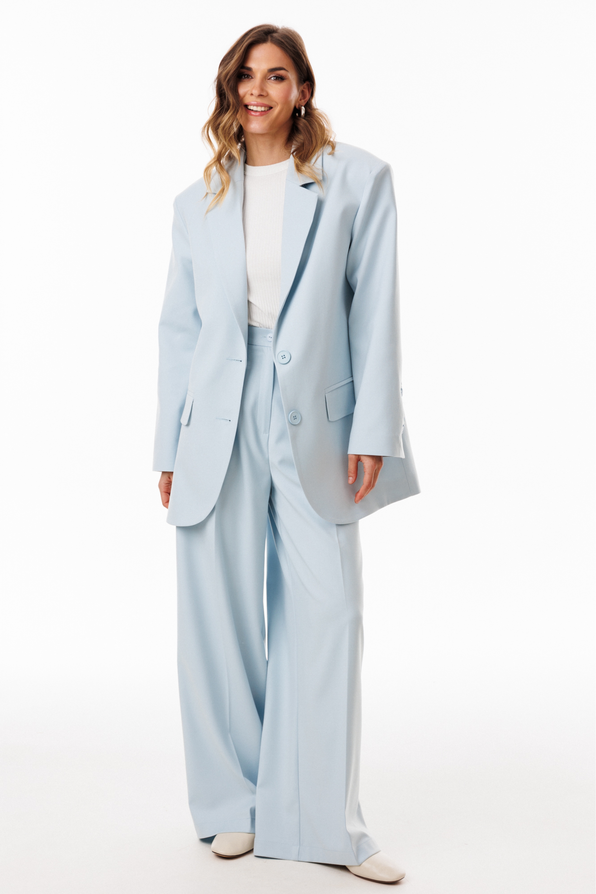 Брюки-палаццо выполнены из плательно-костюмной ткани. Брюки на притачном поясе, длиной в пол, расширенные к низу. Спереди складки и боковые карманы с наклонным входом. Застежка спереди на молнию с гульфиком и пуговицу. На задних частях обработаны талиевые вытачки.