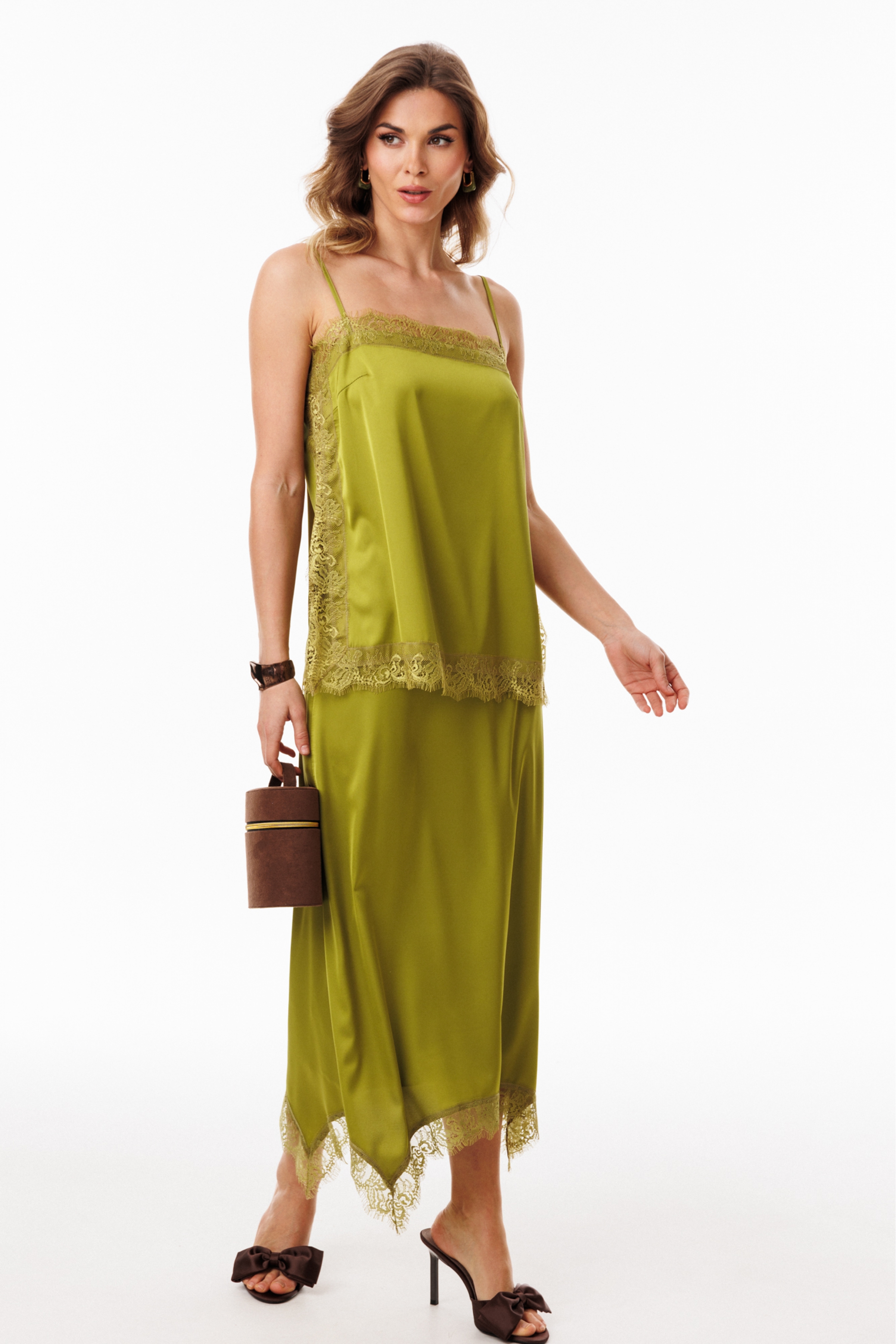 Топ выполнен из тонкого атласа. Топ прямого силуэта длиной выше линии бедер. По переду обработаны нагрудные вытачки. Топ на регулируемых бретелях из основной ткани. В боковых швах обработаны разрезы. Топ декорирован тесьмой-кружевом по горловинам переда и спинки, по боковым и по низу.