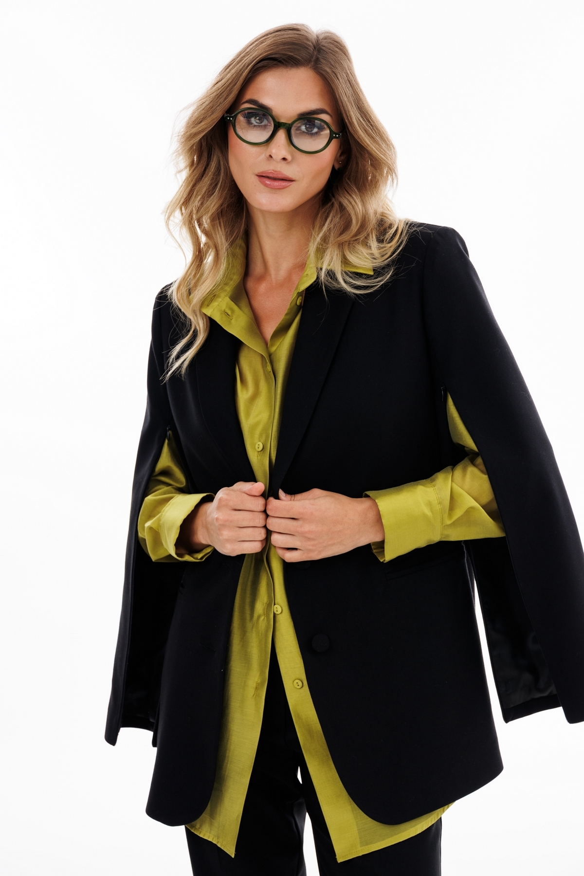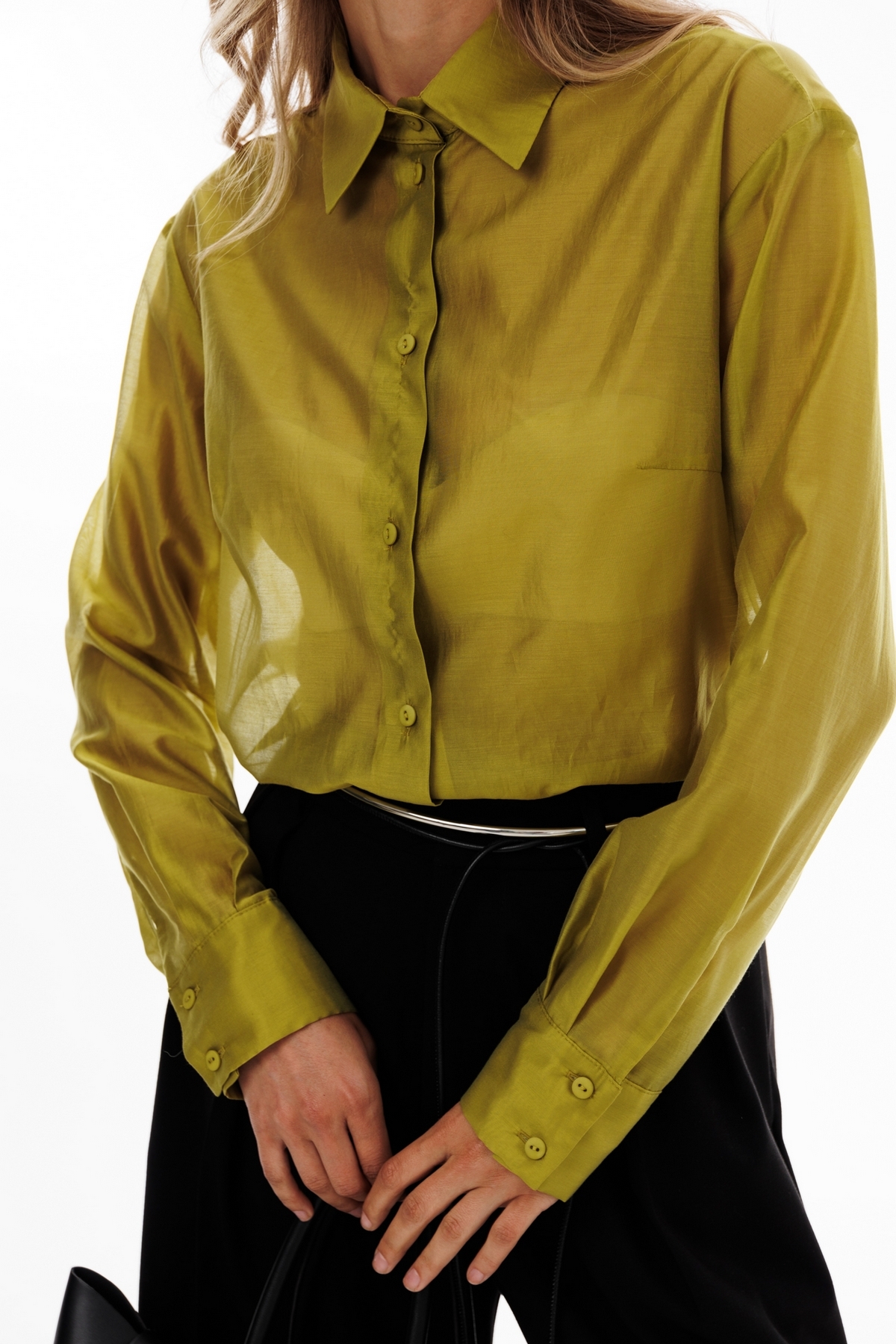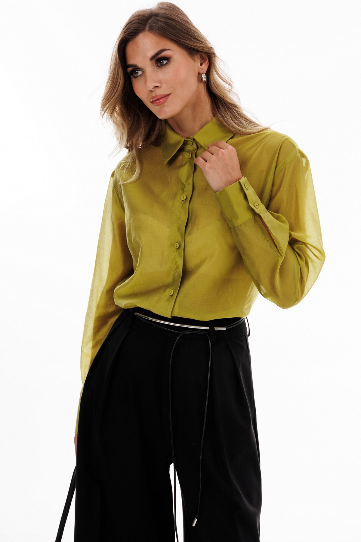 Блузка выполнена из плательно-блузочной ткани. Блузка прямого силуэта, длиной до линии бедер. Спереди центральная застежка на пуговицы. Воротник стояче-отложной. Плечевой шов удлинен. Рукав рубашечного кроя, одношовный с прорезью и двумя складками по низу. Рукав на притачной манжете. Низ блузки фигурной формы. В комплект входит пояс из основной ткани.