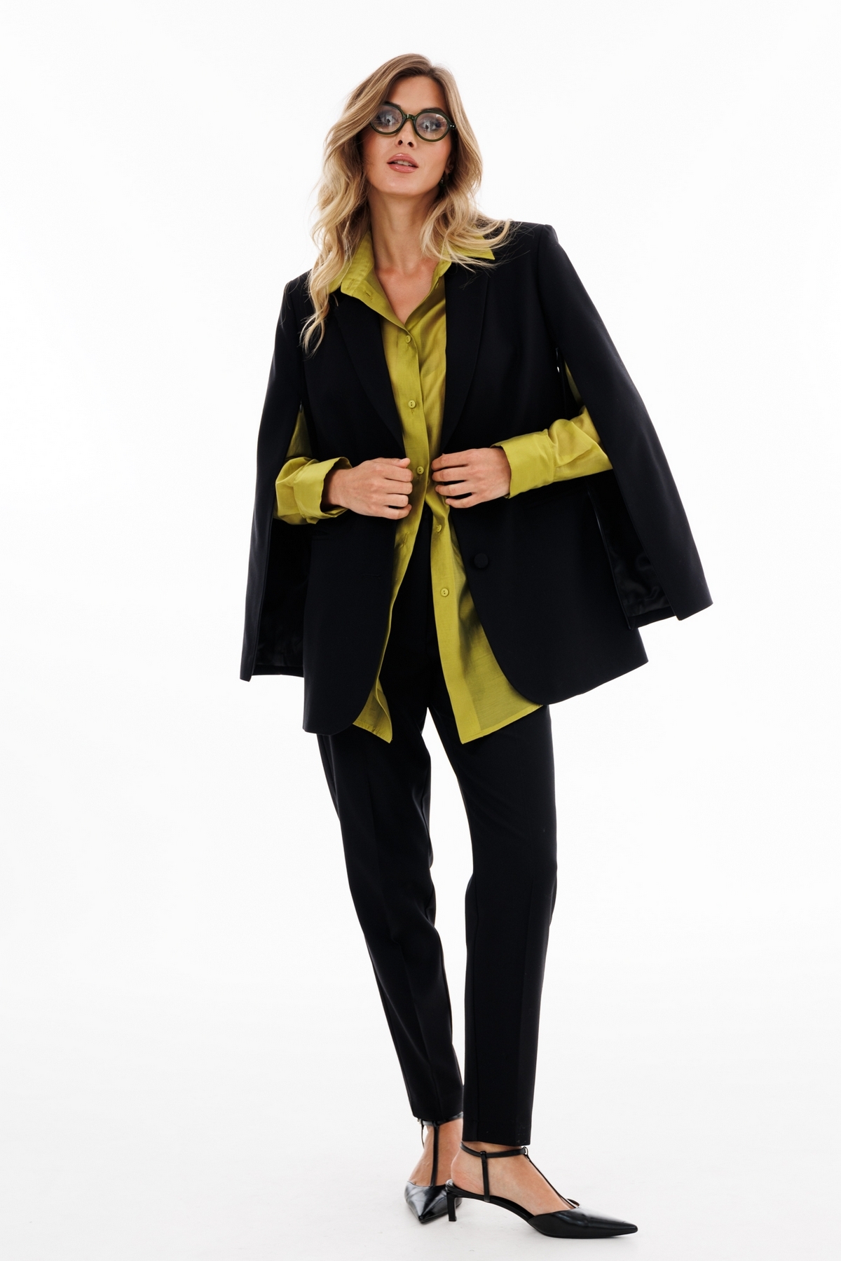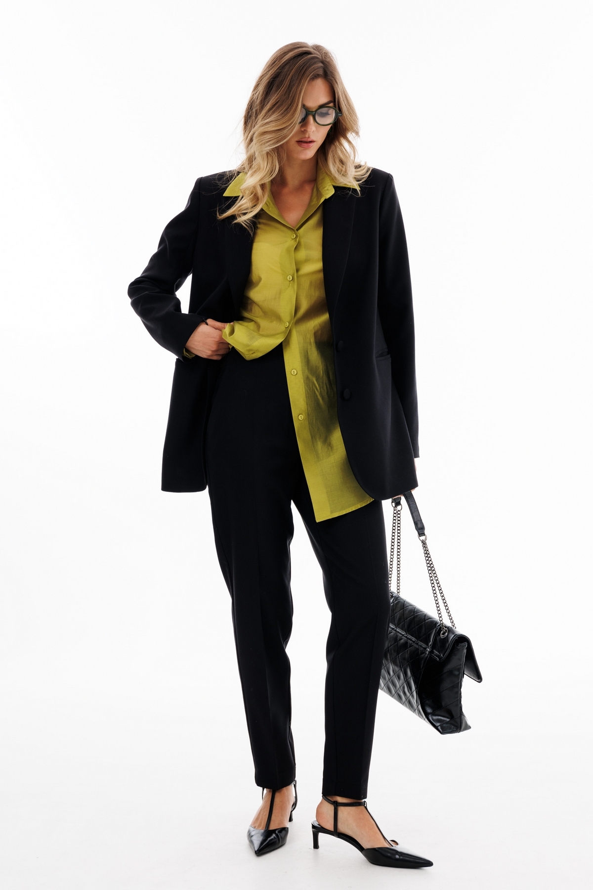 Брюки выполнены из костюмной ткани. Брюки зауженные к низу, длиной 7/8, на притачном поясе. Спереди боковые карманы с наклонным входом и застежка на молнию. Сзади декоративные карманы с листочкой.