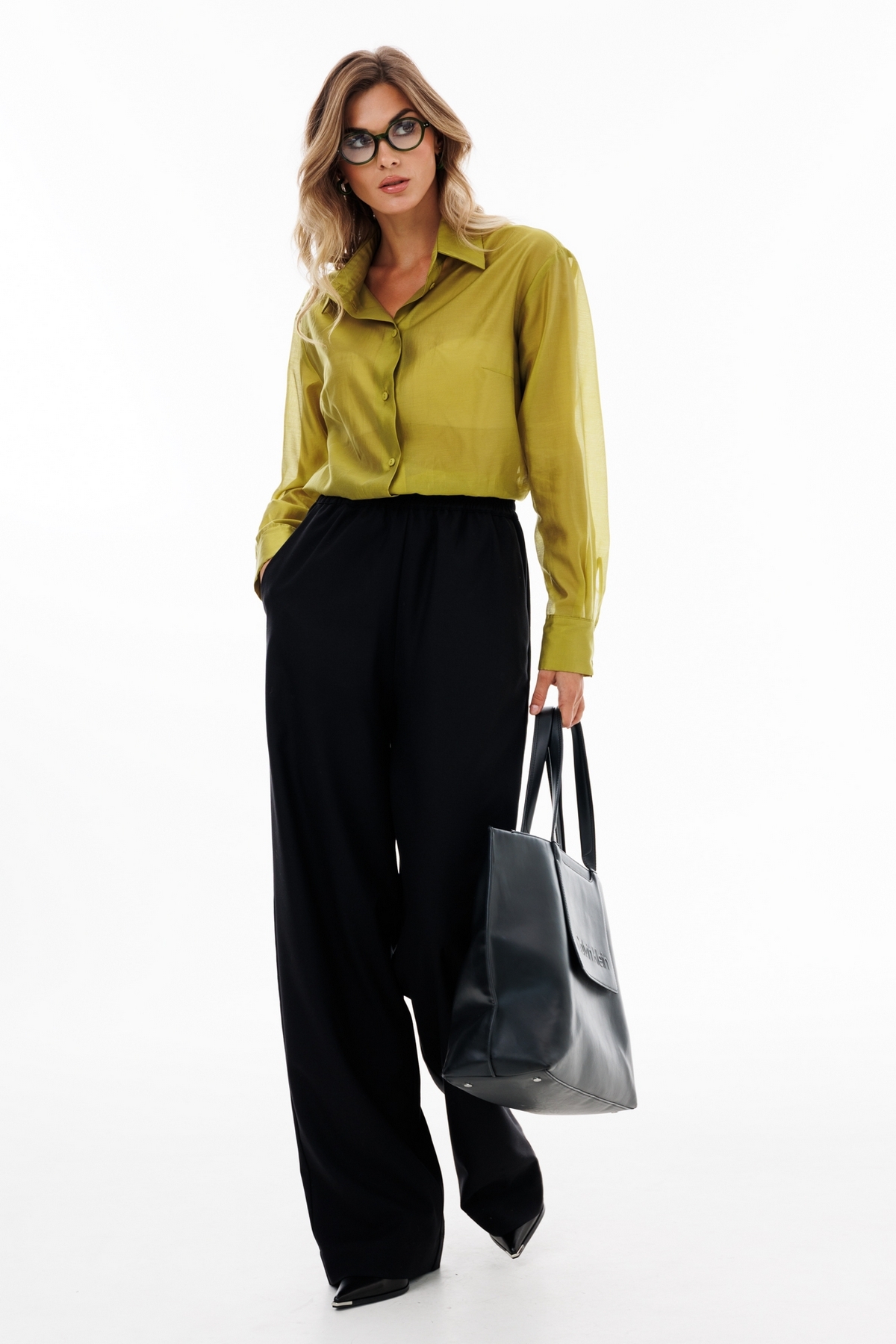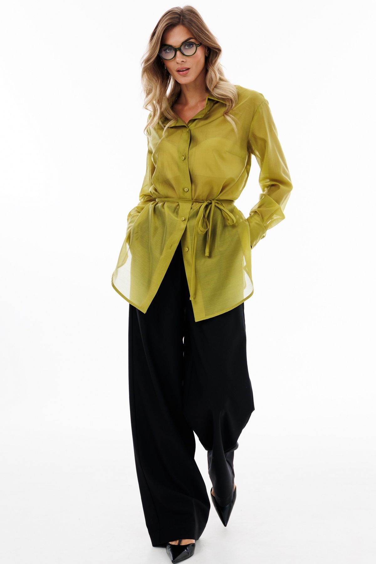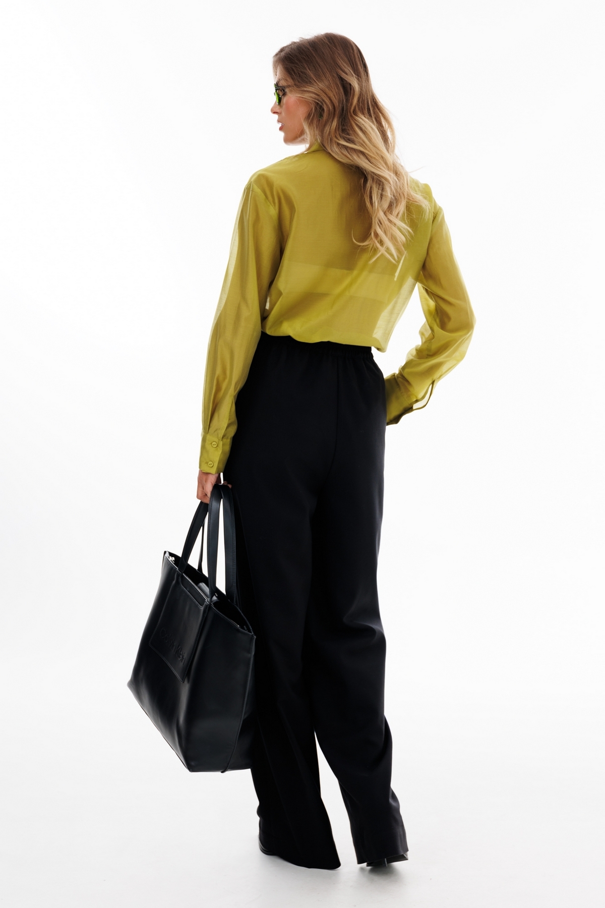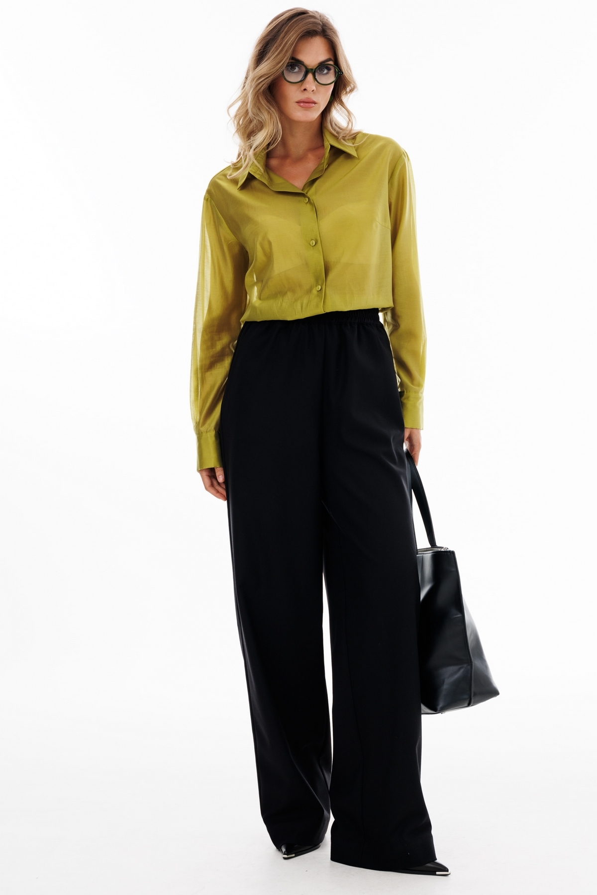 Брюки выполнены из костюмной ткани. Брюки прямого покроя длиной в пол, на притачном поясе с эластичной тесьмой. Спереди боковые карманы с наклонным входом.