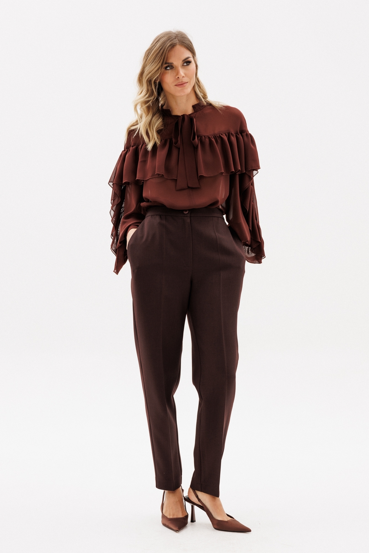 Брюки выполнены из костюмной ткани. Брюки зауженны к низу, длиной 7/8, на притачном поясе. Спереди боковые карманы с наклонным входом и застежка на пуговицу и молнию. Сзади талиевые вытачки и декоративные прорезные карманы. По задней части пояса эластичная тесьма.