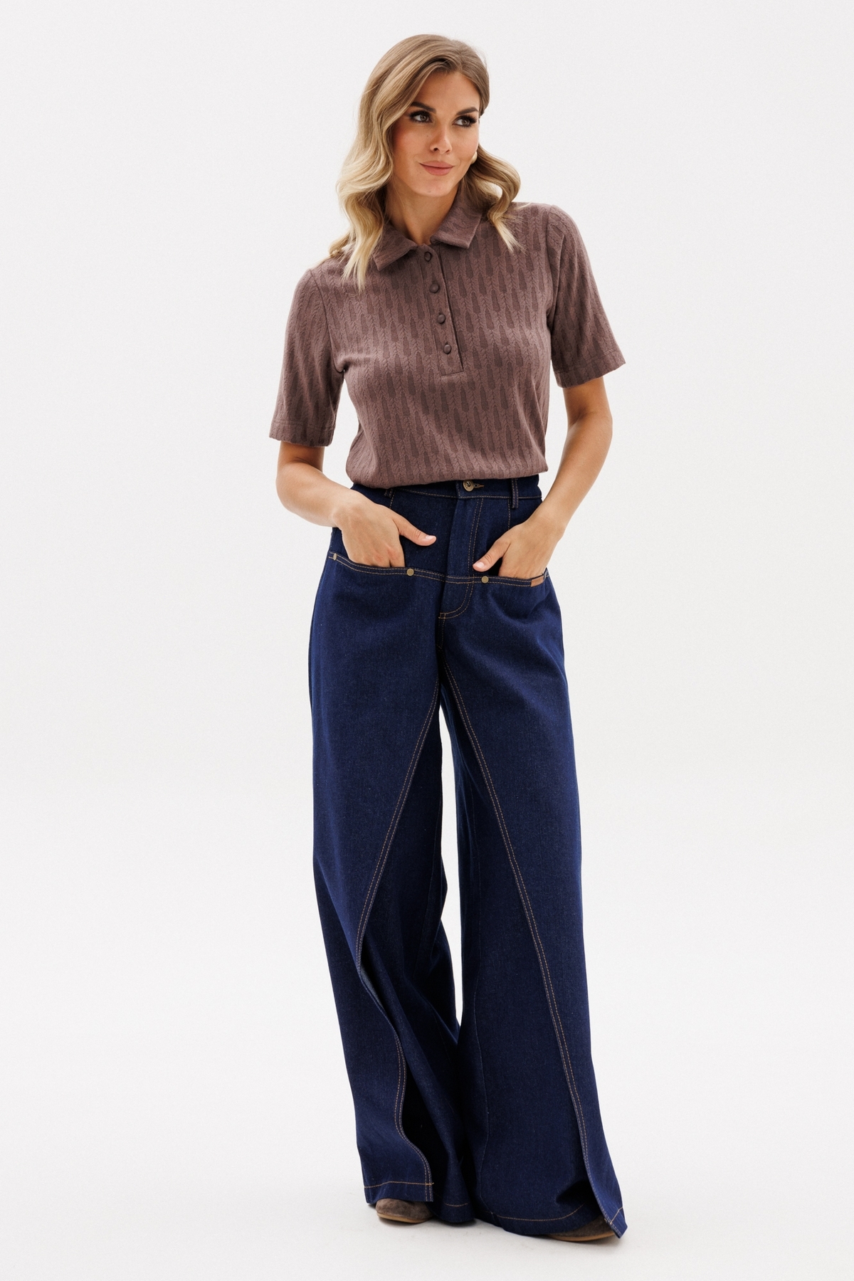 Джемпер выполнен из трикотажного полотна с рисунком. Джемпер полуприлегающего силуэта, длиной выше линии бедер. Спереди застежка на пуговицы. Воротник стояче-отложной. Плечевой шов удлинен. Рукав втачного покроя, одношовный, выше линии локтя.