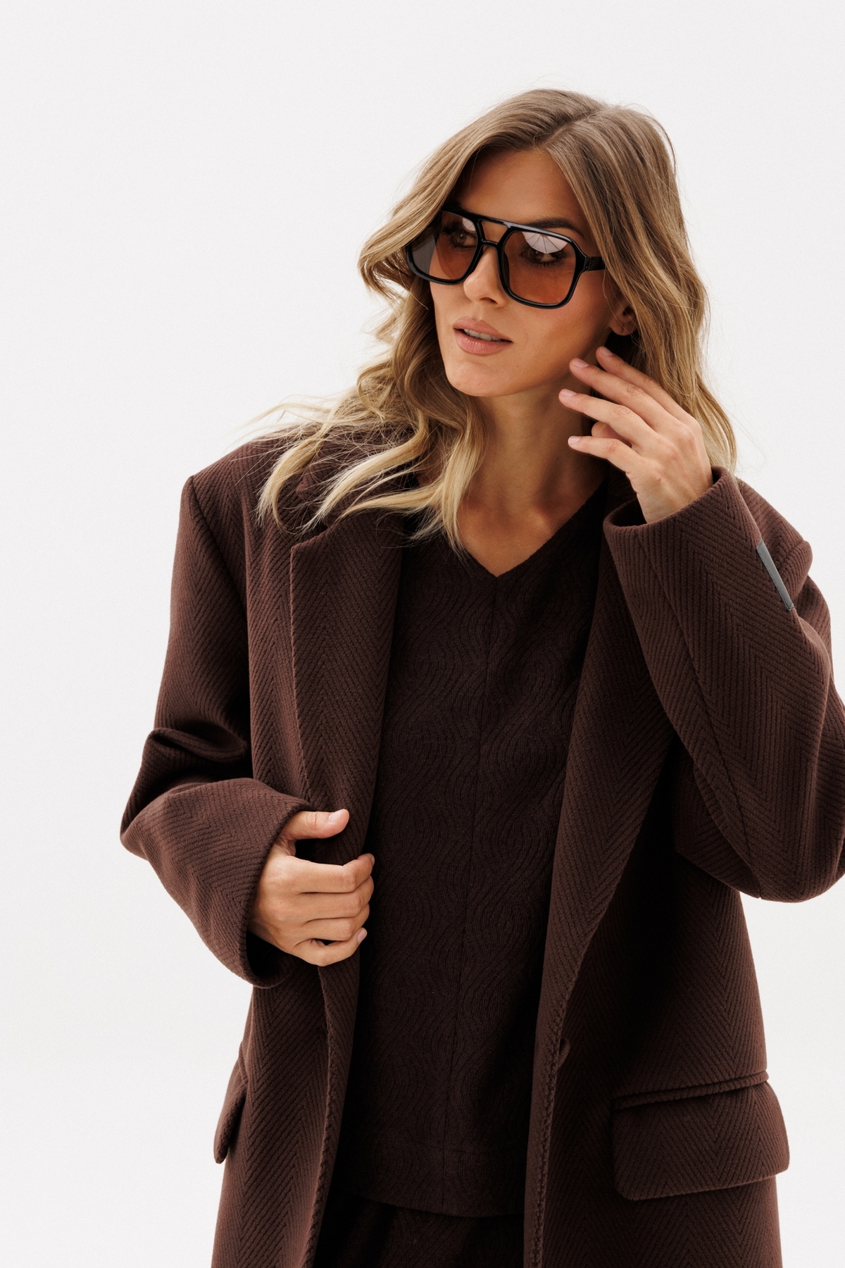Пальто выполнено из пальтовой ткани в рубчик. Пальто прямого силуэта, длиной до линии щиколотки. Спереди застежка на две пуговицы, горизонтальные прорезные карманы. Спинка со средним швом со шлицей по низу. Воротник пиджачного типа. Плечевой шов удлинен. Рукав втачной, двухшовный. Пальто на притачной по низу подкладке. Пальто декорировано по рукаву нашивкой из натуральной кожи.