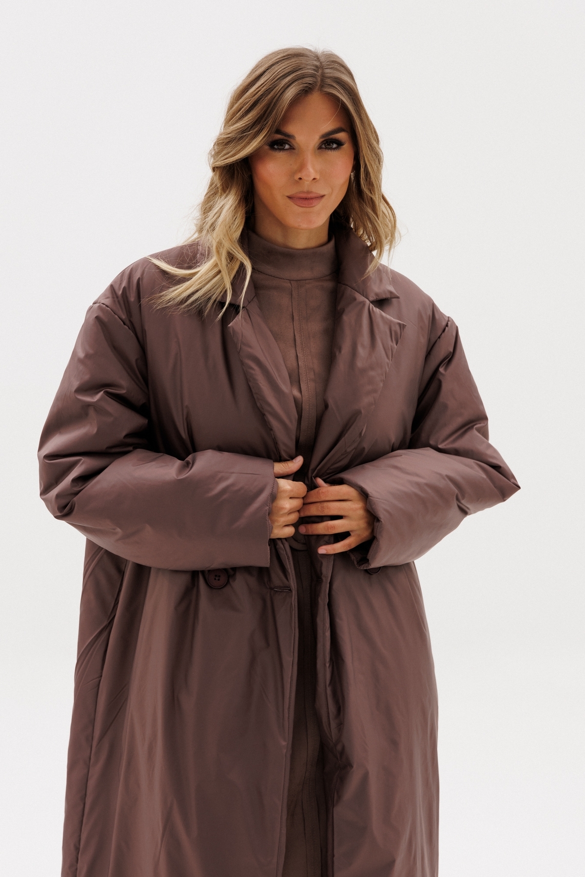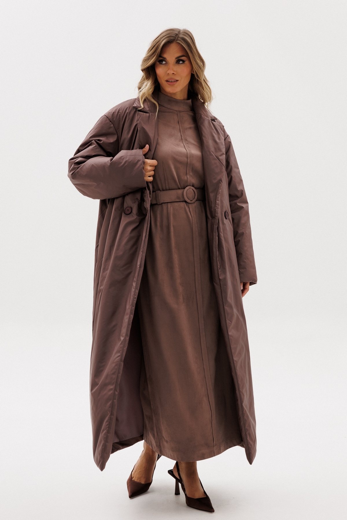 Пальто выполнено из плащевой ткани с утеплителем Isosoft. Пальто прямого силуэта, длиной до линии щиколотки. Спереди двубортная застежка на один ряд пуговиц и прорезные карманы в швах. Спинка со средним швом. Плечевой шов спущен. Воротник пиджачного типа. Рукав рубашечного покроя, двухшовный. Пальто на притачной по низу подкладке. Пояс из основной ткани входит в комплект.