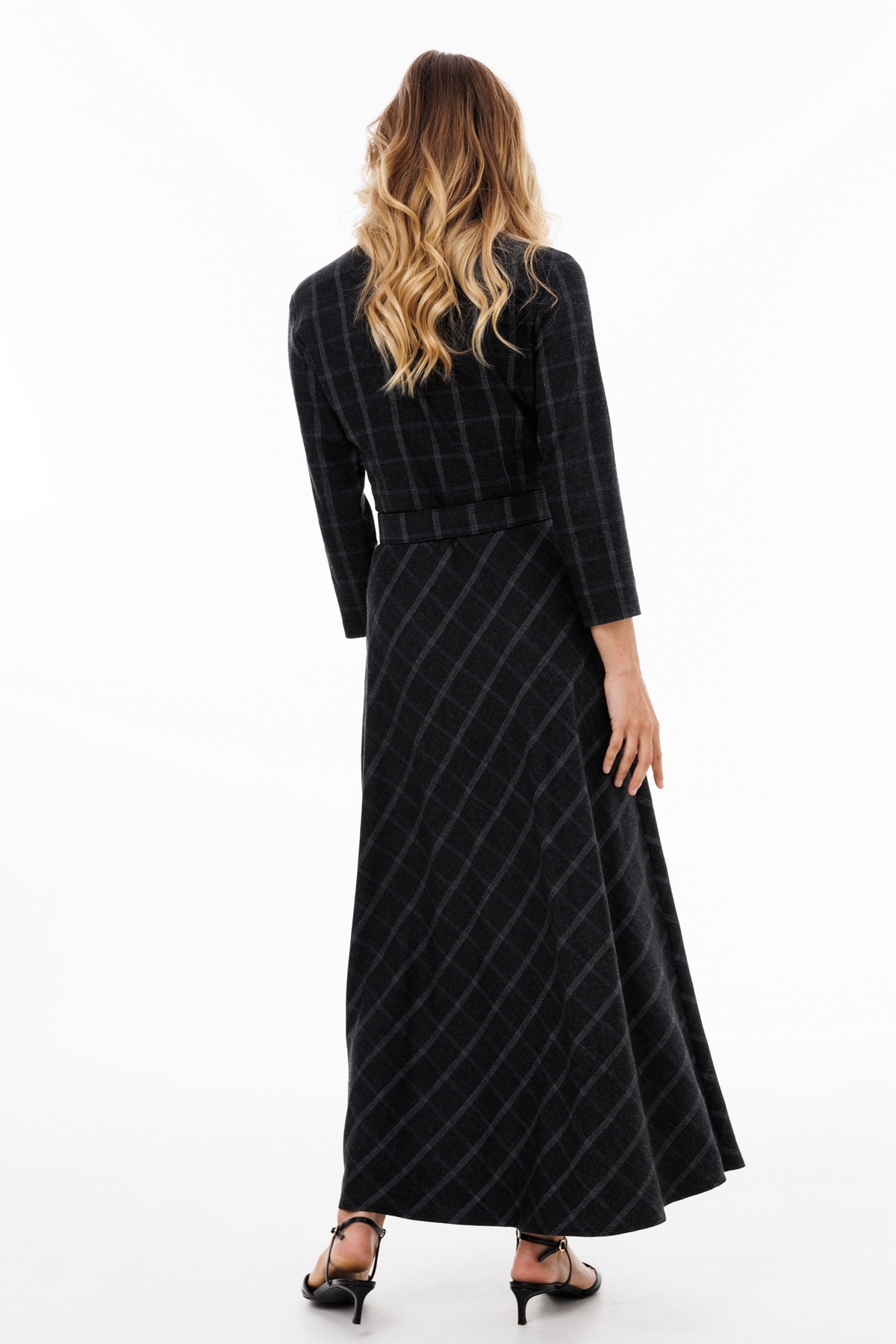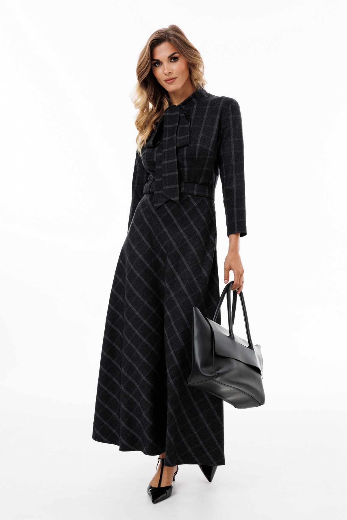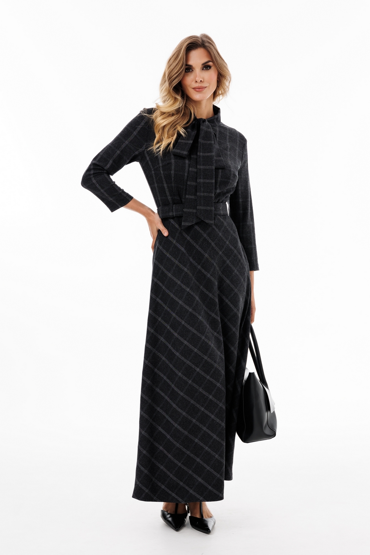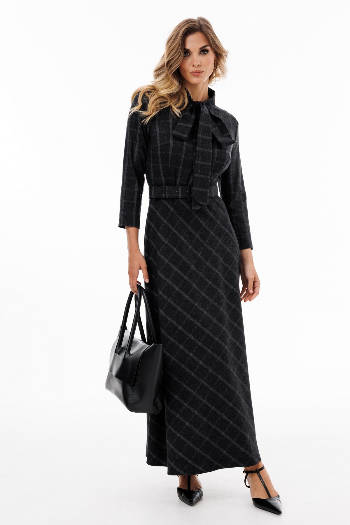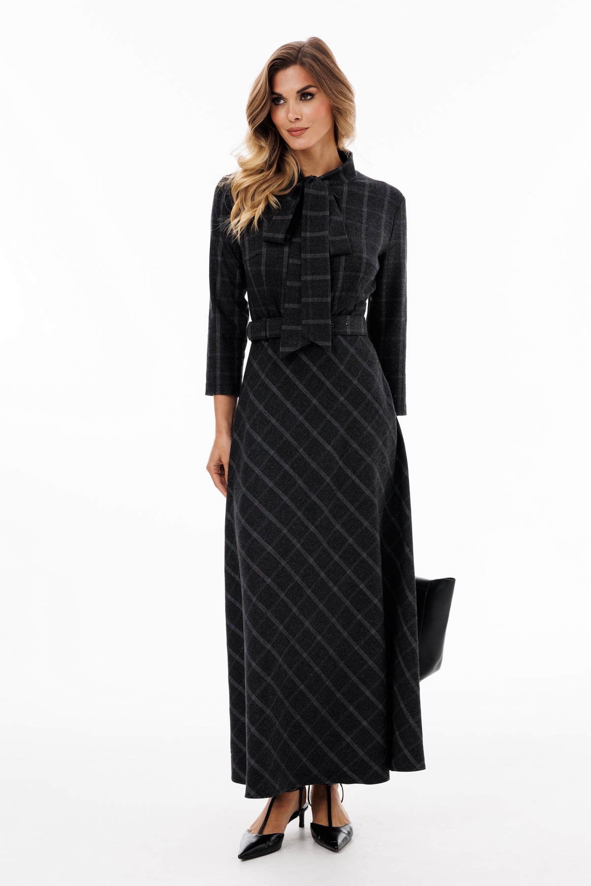 Платье выполнено из костюмной ткани в клетку. Платье Х-образного силуэта, длиной миди. Платье отрезное по линии талии. Спереди горловина V-образной формы,  застежка на пуговицы. Воротник стойка, переходящий в бант. Рукав втачной одношовный, длиной 3/4. Юбка покроена по косой. В левом боковом шве застежка на потайную молнию. В комплект входит ремень из основной ткани с обтяжной пряжкой.