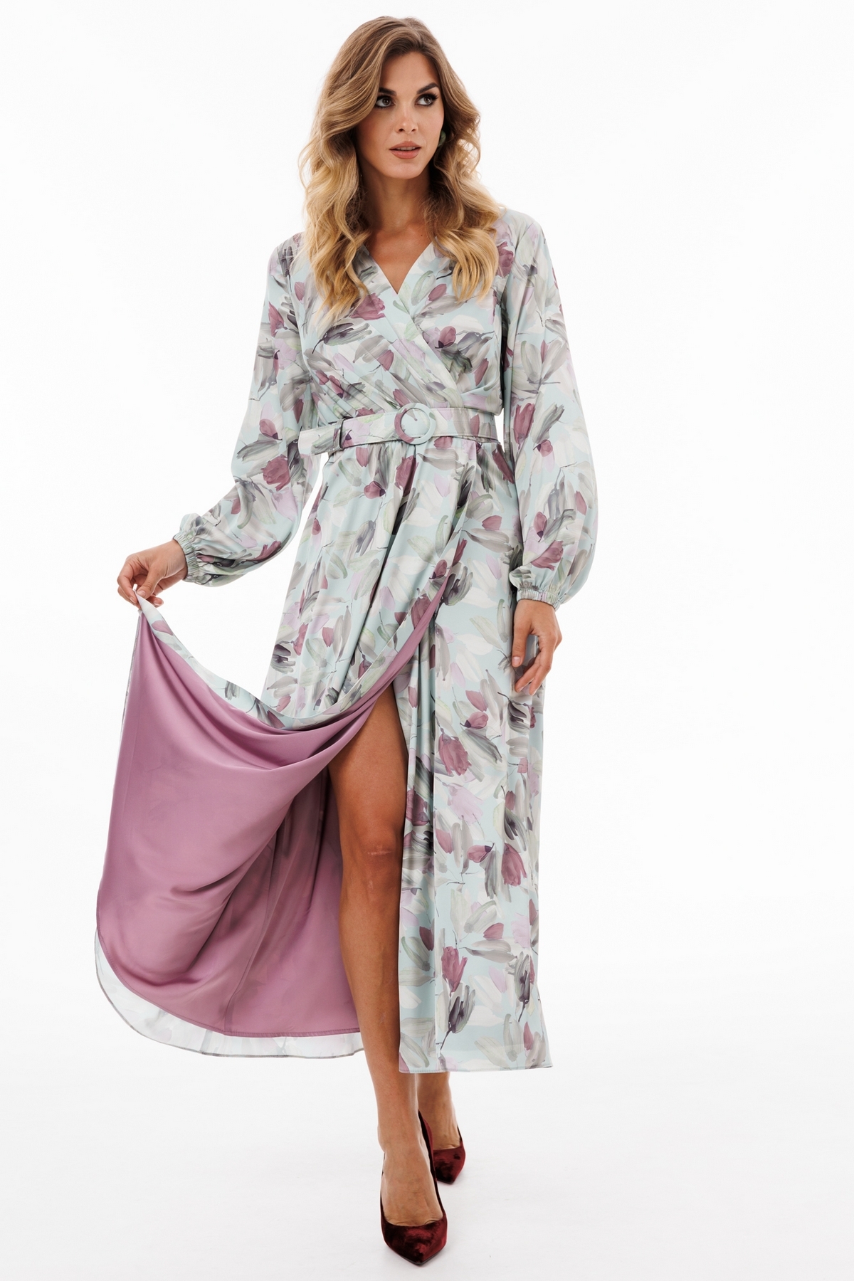 Платье выполнено из креп-атласа с принтом. Платье Х-образного силуэта, отрезное по линии талии, длиной миди. Перед выполнен "на запах" со складками по линии талии. Спинка цельная. Вырез V-образной формы. Рукав втачной, одношовный, с напуском. Низ рукава собран на эластичной тесьме. Юбка расширена к низу. Платье на отлетной по низу атласной подкладке. В комплект входит съемный ремень с обтяжной пряжкой.
