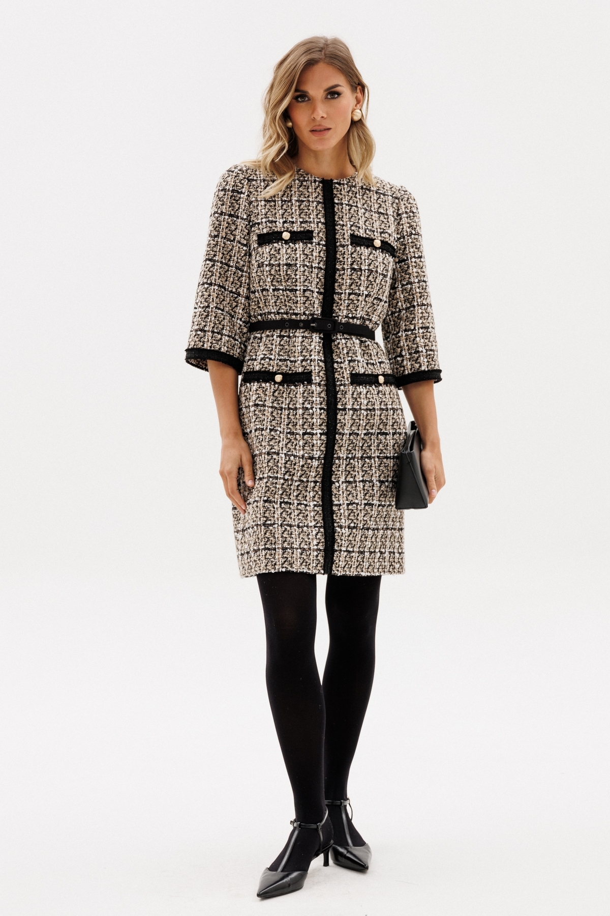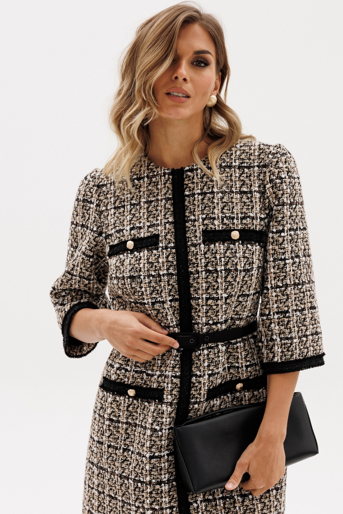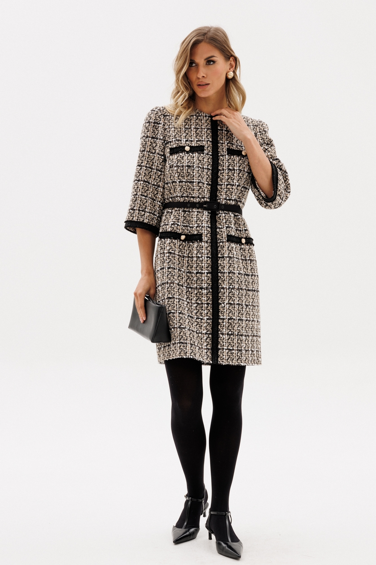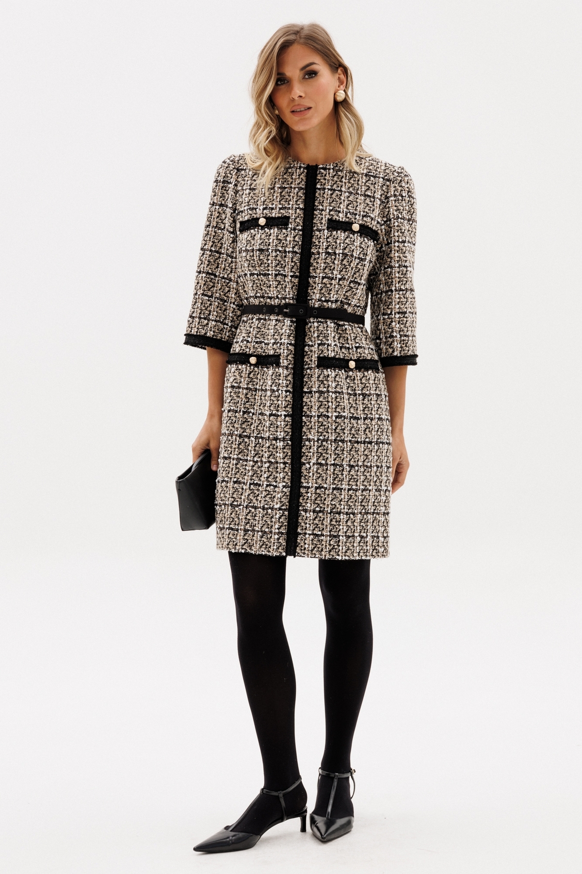 Платье выполнено из твида. Платье полуприлегающего силуэта, длиной выше линии колена. Застежка на потайную молнию в среднем шве спинки. Горловина округлой формы. Плечевой шов заужен. Рукав втачной одношовный, длиной 3/4. Платье декорировано настрочной тесьмой по центру переда, низу рукава. В комплект входит ремень из отделочной ткани с обтяжной пряжкой.
