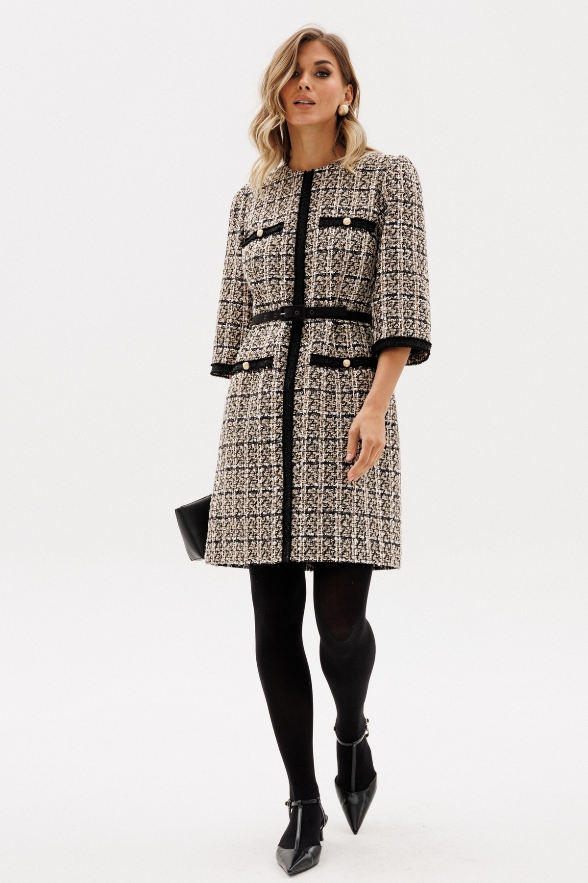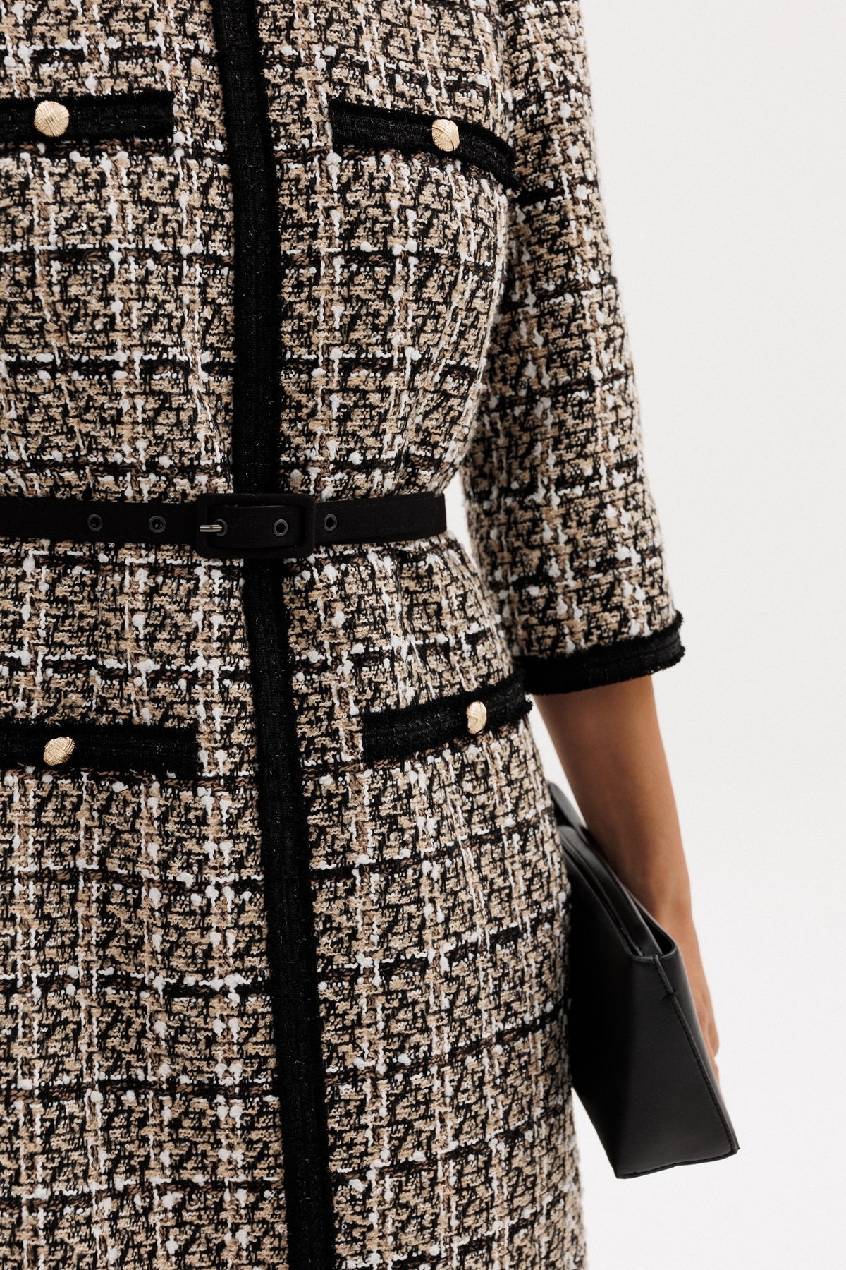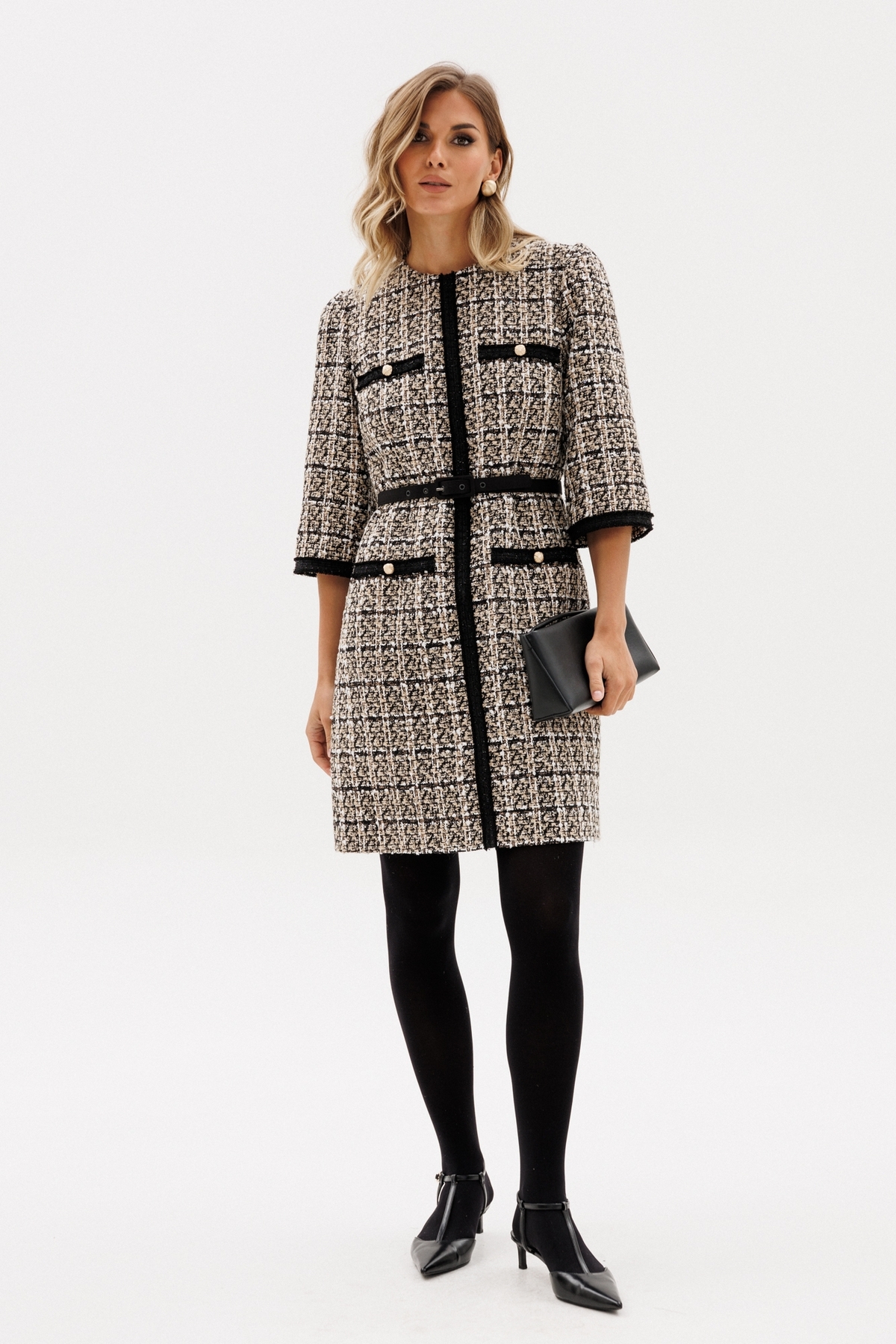 Платье выполнено из твида. Платье полуприлегающего силуэта, длиной выше линии колена. Застежка на потайную молнию в среднем шве спинки. Горловина округлой формы. Плечевой шов заужен. Рукав втачной одношовный, длиной 3/4. Платье декорировано настрочной тесьмой по центру переда, низу рукава. В комплект входит ремень из отделочной ткани с обтяжной пряжкой.