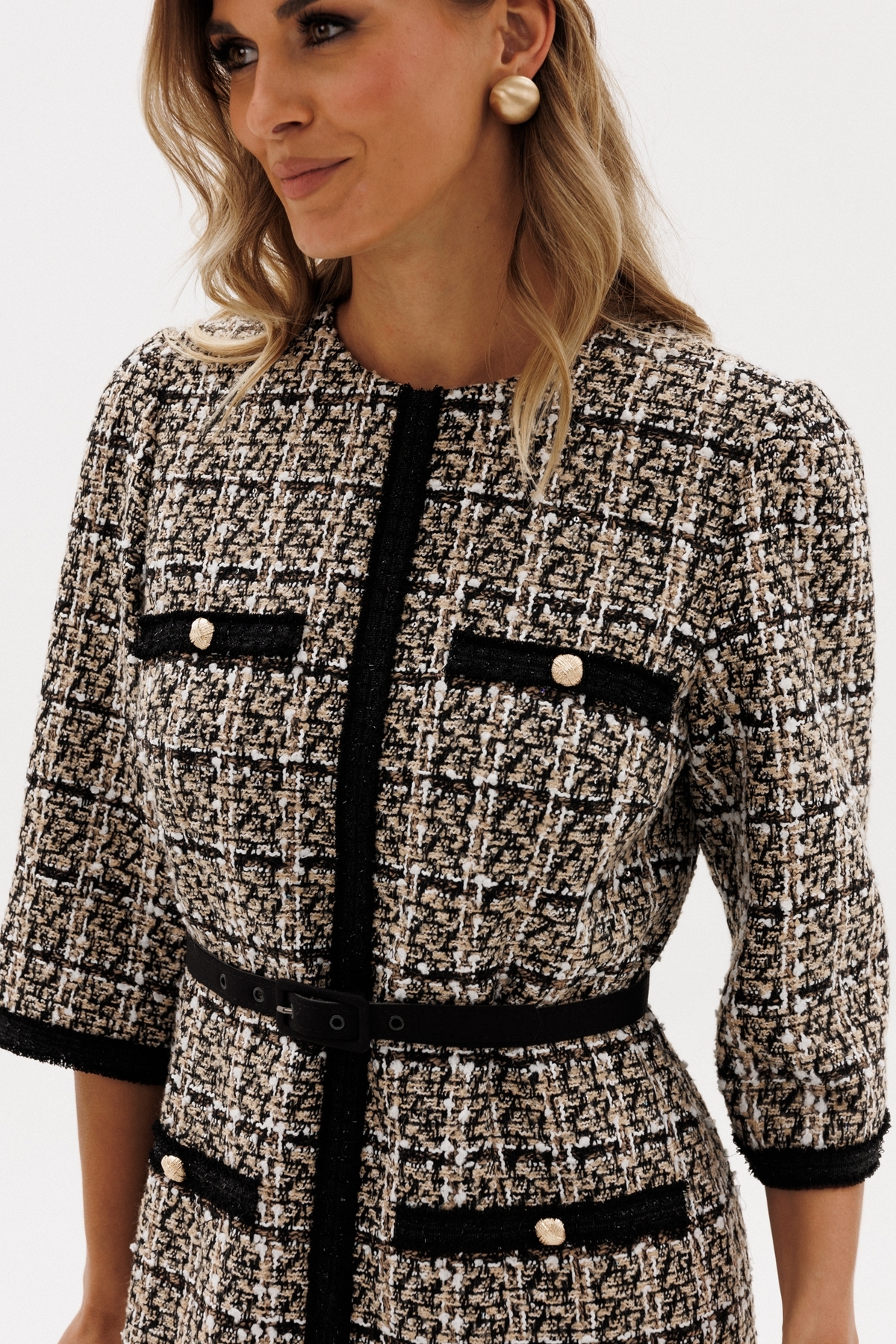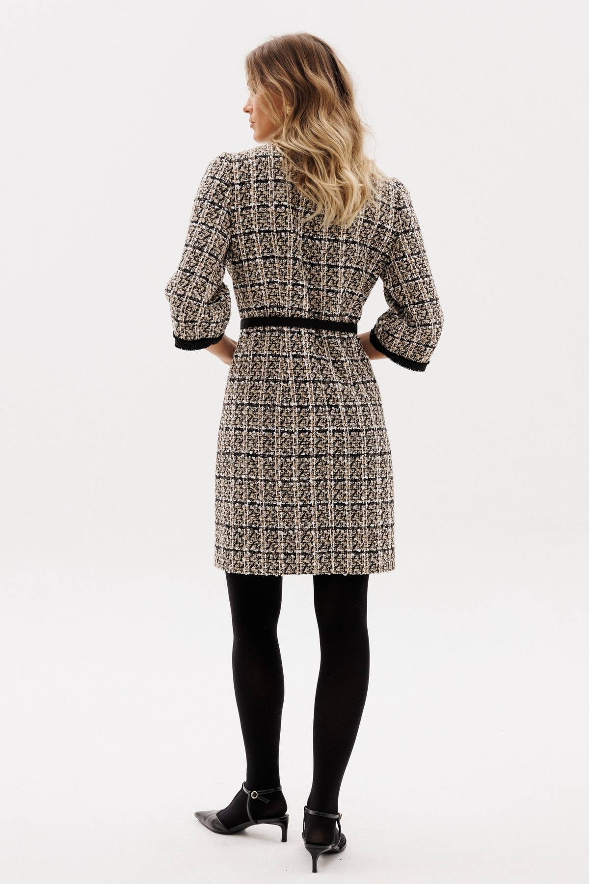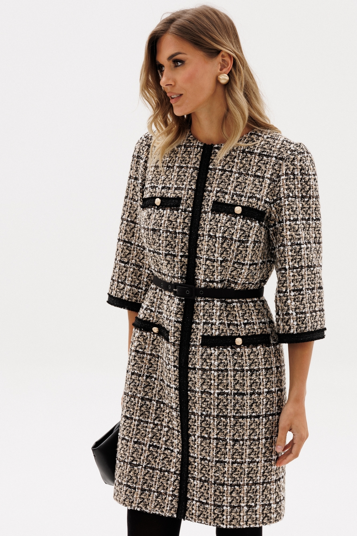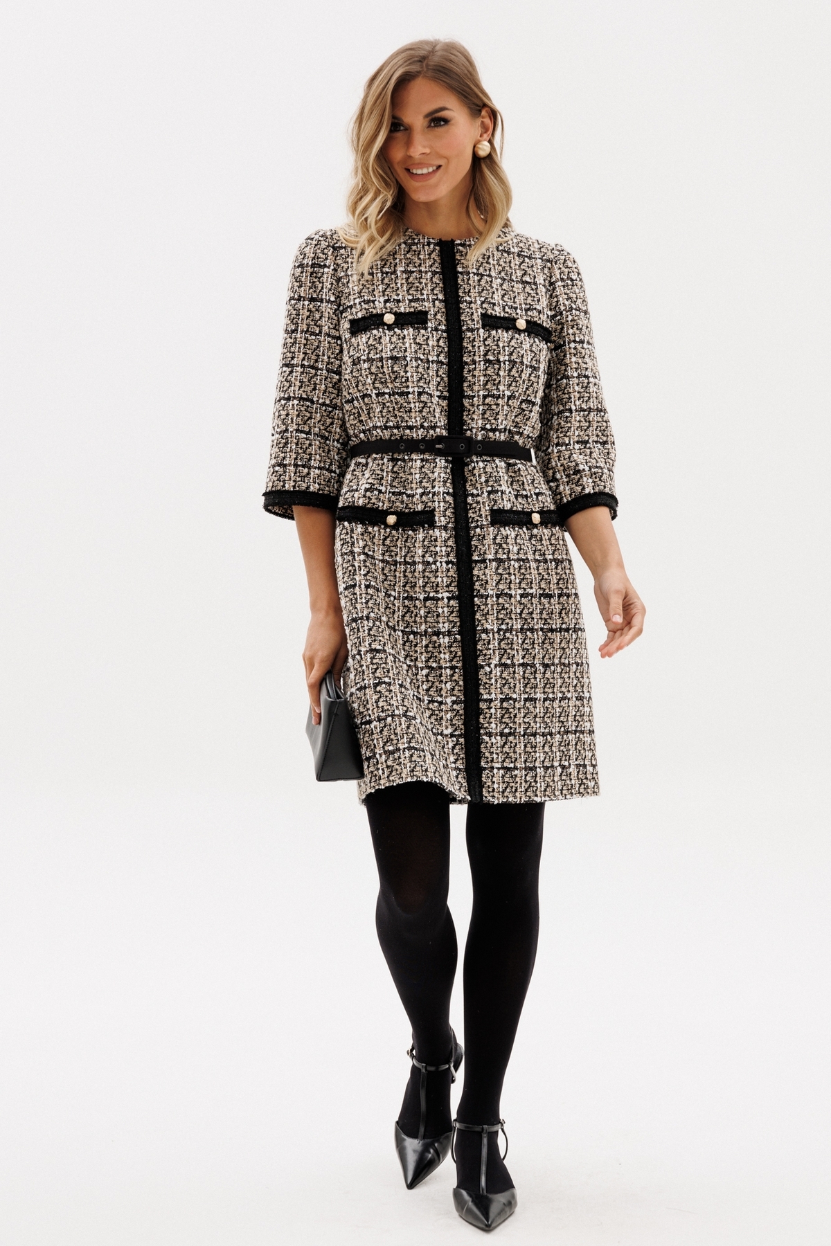 Платье выполнено из твида. Платье полуприлегающего силуэта, длиной выше линии колена. Застежка на потайную молнию в среднем шве спинки. Горловина округлой формы. Плечевой шов заужен. Рукав втачной одношовный, длиной 3/4. Платье декорировано настрочной тесьмой по центру переда, низу рукава. В комплект входит ремень из отделочной ткани с обтяжной пряжкой.