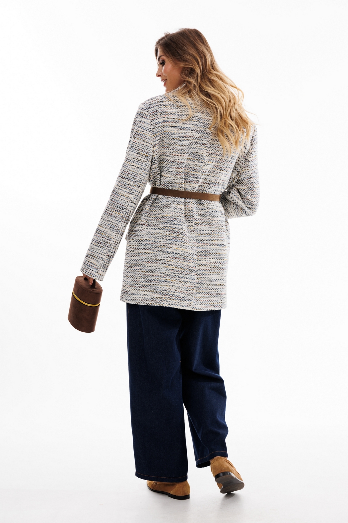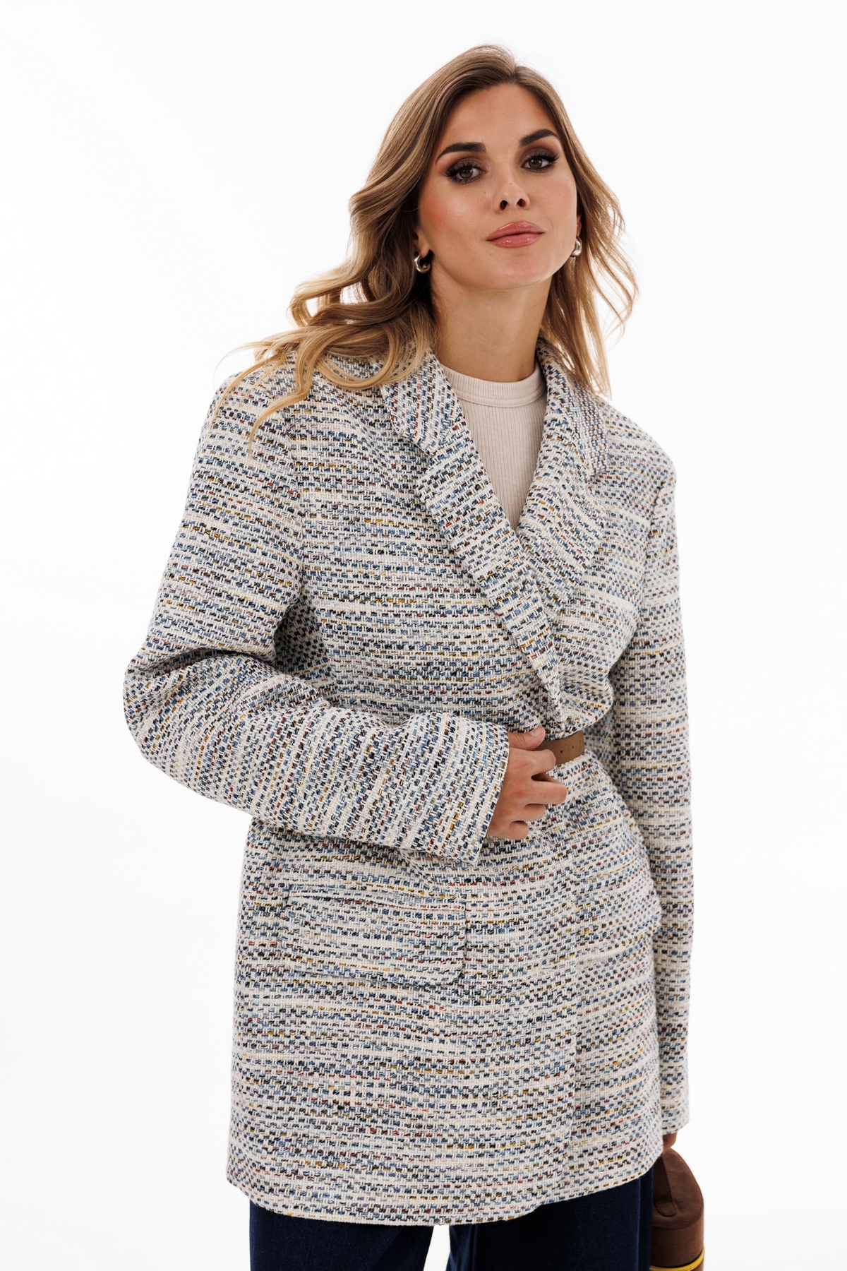 Жакет выполнен из меланжевой костюмной ткани. Жакет прямого силуэта, кроя oversize, длиной ниже линии бедра. Спереди карманы с клапанами, бортовая застежка на две пуговицы. Жакет по спинке со средним швом со шлицей. Воротник пиджачного типа. Плечевой шов удлинен. Рукав втачного покроя, двухшовный. Жакет на притачной по низу подкладке.