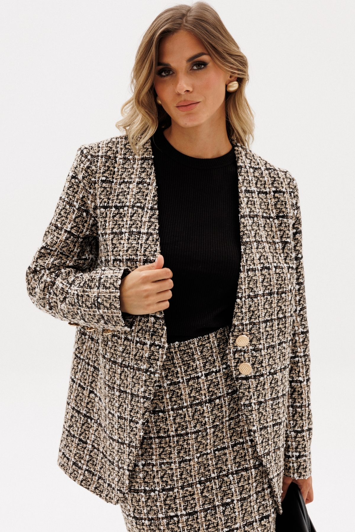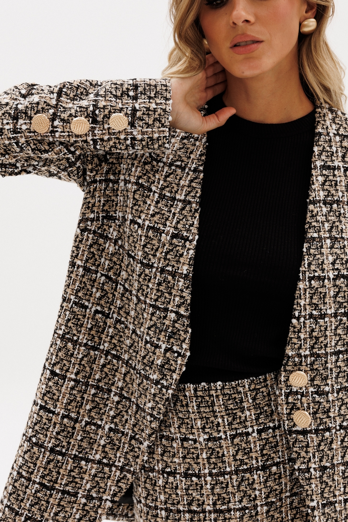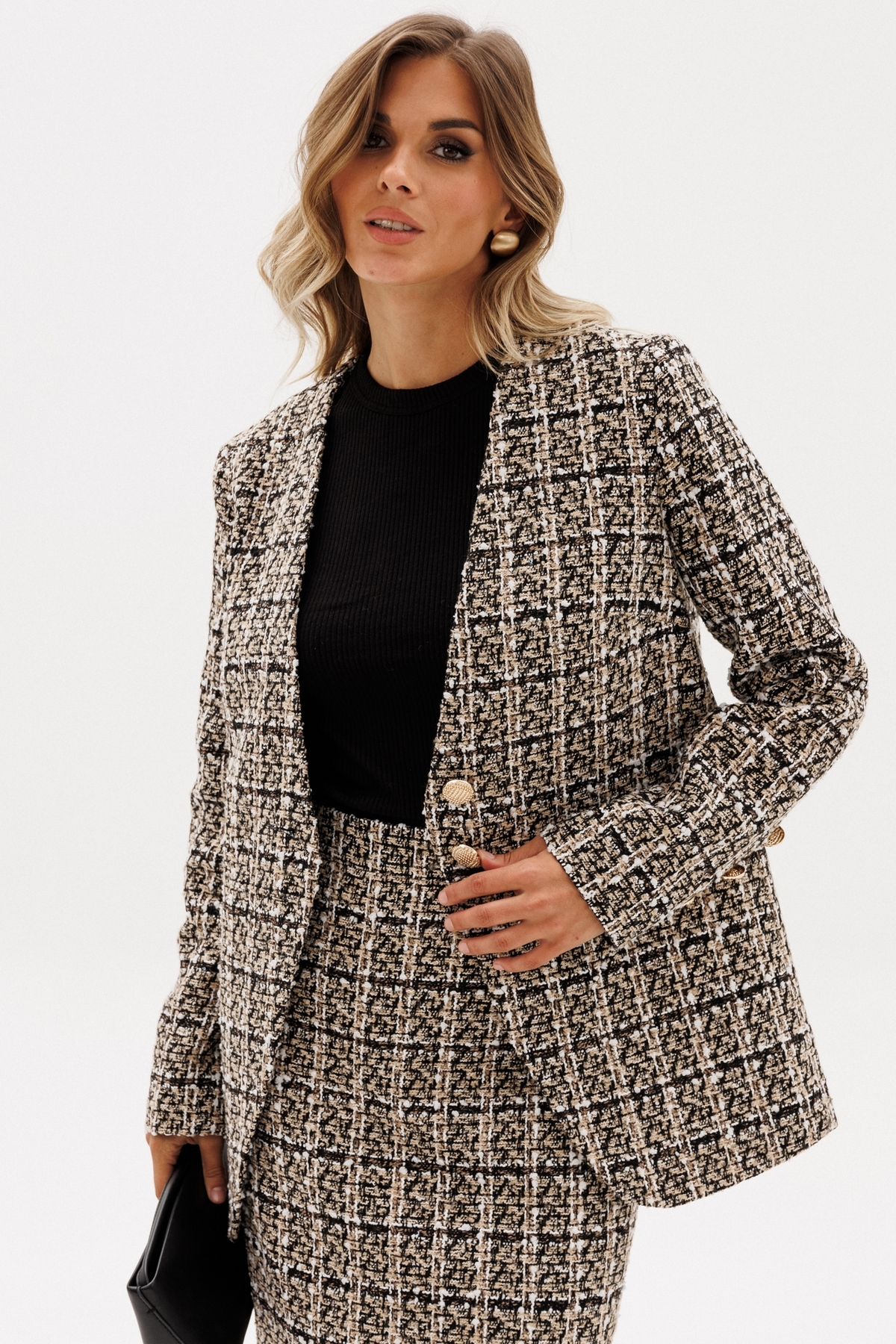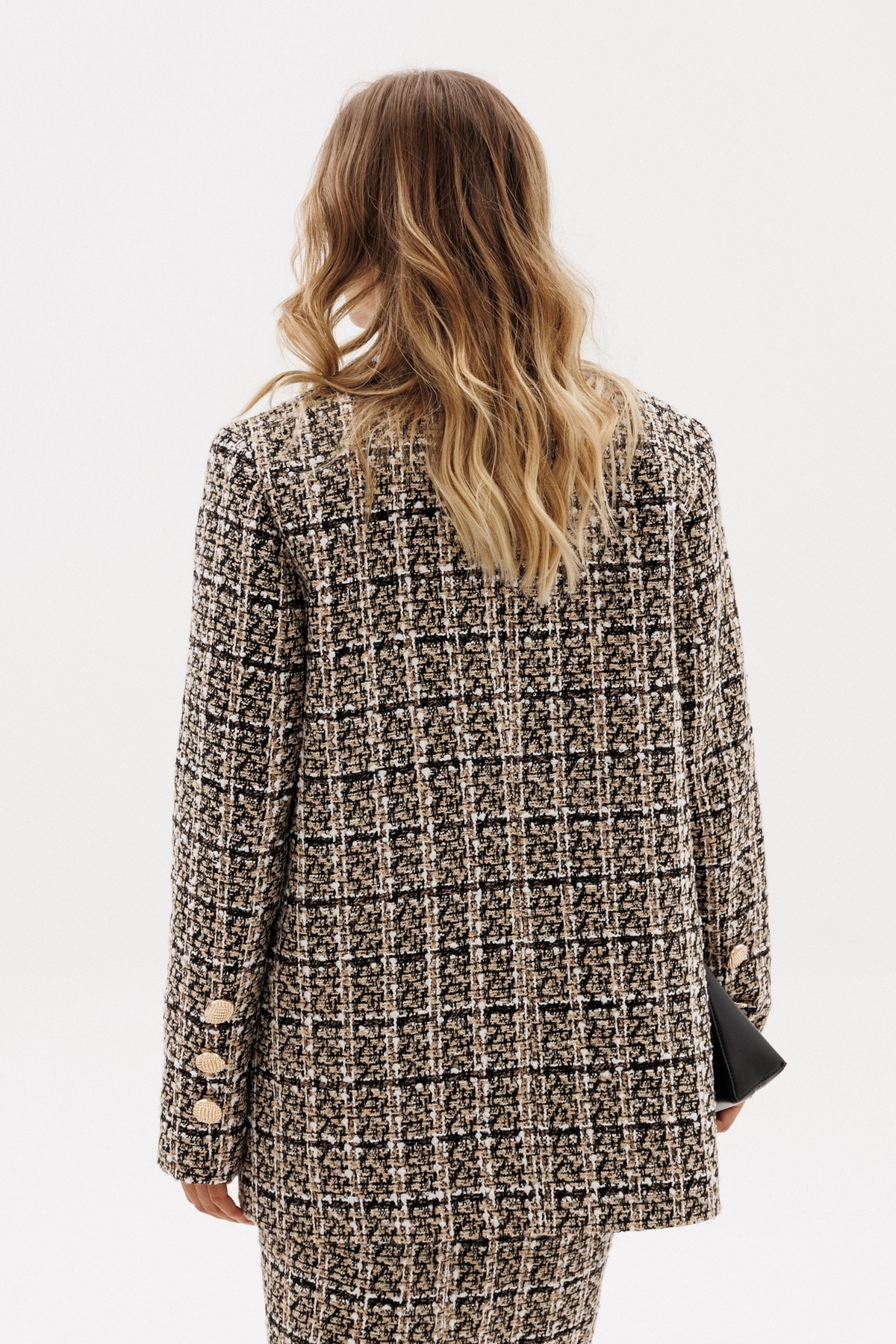 Жакет выполнен из твида. Жакет прямого силуэта, длиной до линии бедер. Спереди центральная застежка на пуговицы. Край борта фигурной формы. На спинке средний шов. Горловина V-образной формы. Рукав втачной двухшовный с декоративными пуговицами. Жакет на притачной по низу подкладке.