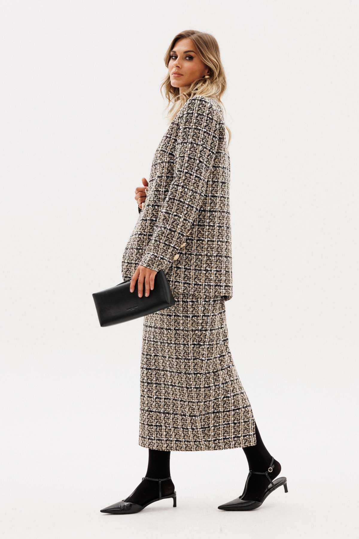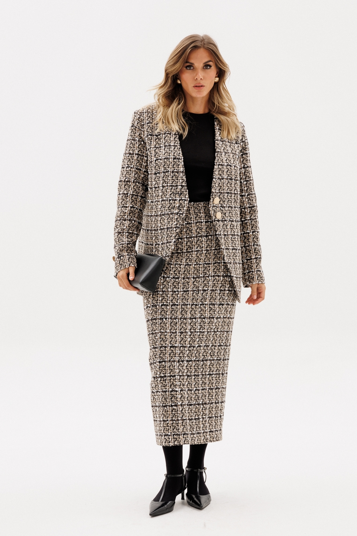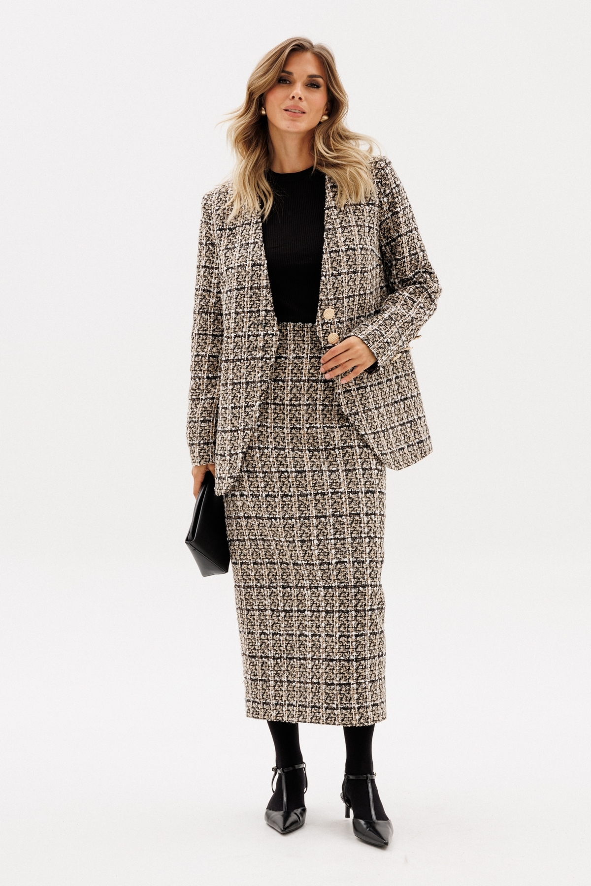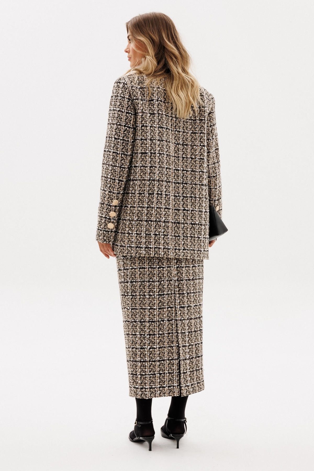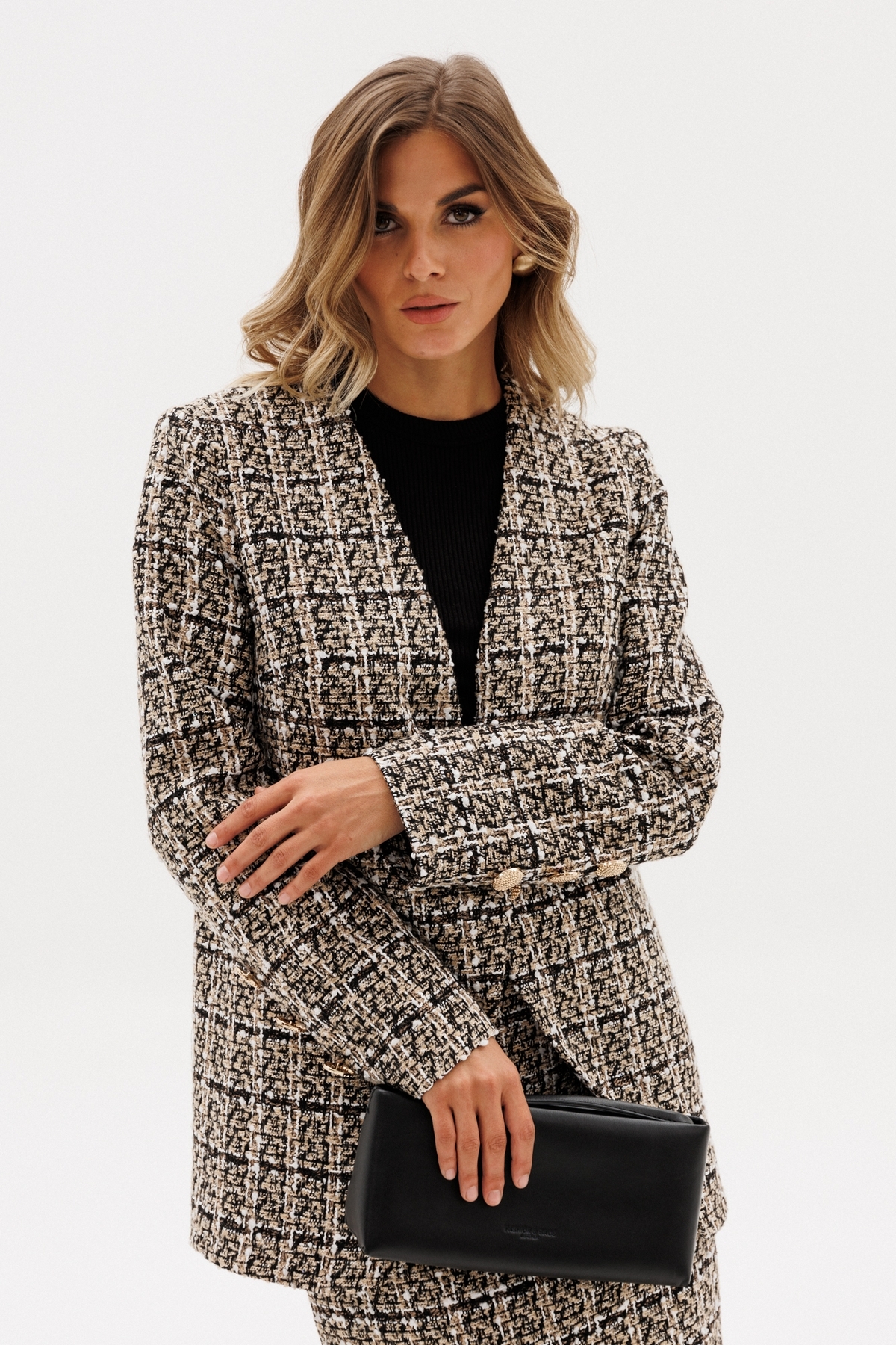 Жакет выполнен из твида. Жакет прямого силуэта, длиной до линии бедер. Спереди центральная застежка на пуговицы. Край борта фигурной формы. На спинке средний шов. Горловина V-образной формы. Рукав втачной двухшовный с декоративными пуговицами. Жакет на притачной по низу подкладке.