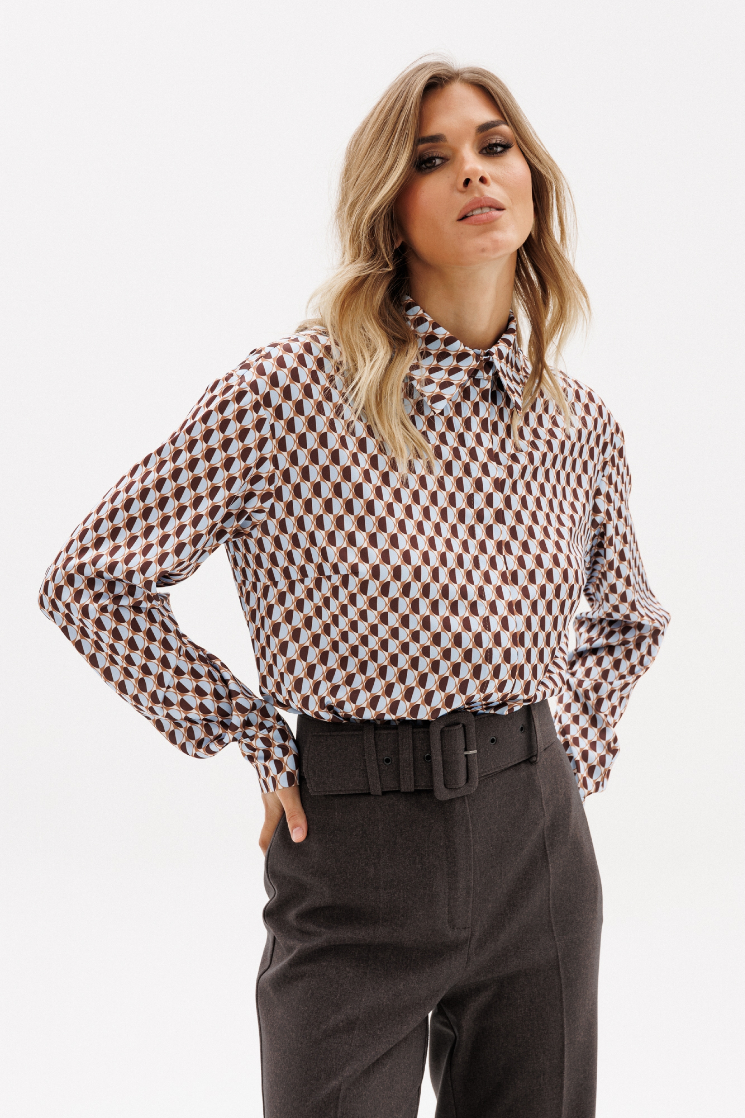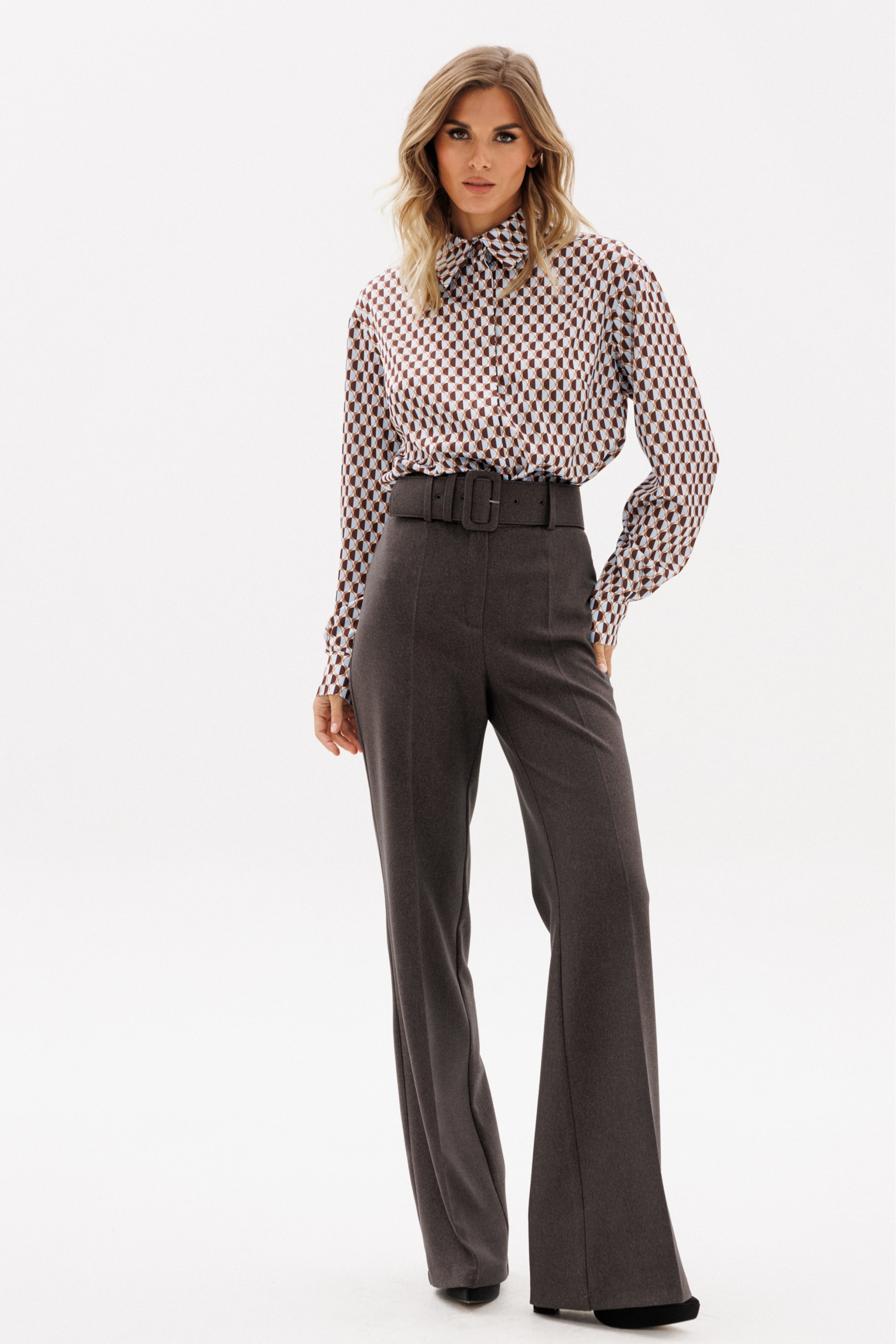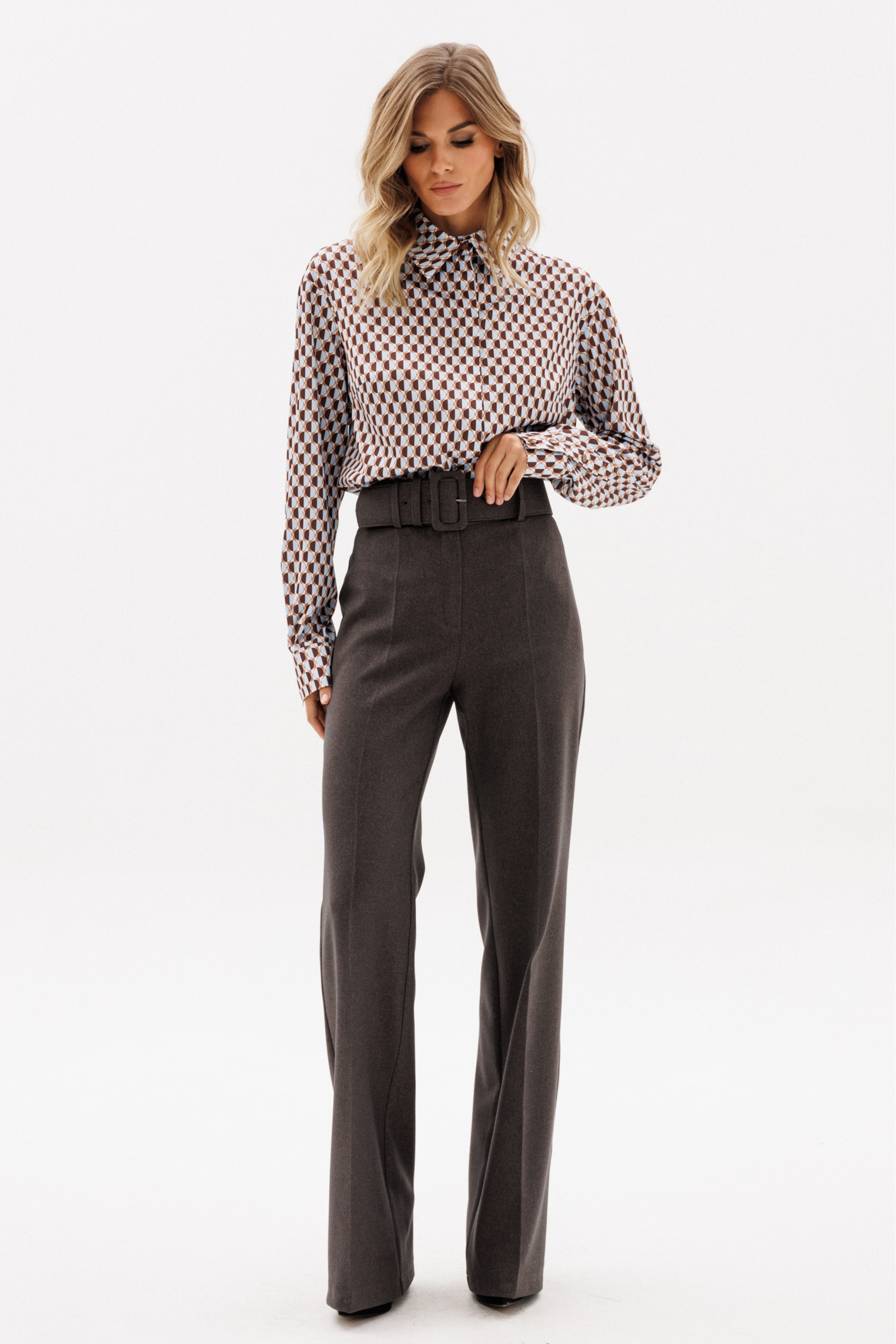 Брюки выполнены из костюмной ткани. Брюки покроя ""клеш"", на притачном поясе, длиной в пол. Спереди застежка на молнию с гульфиком, потайную пуговицу и два брючных крючка. Передние и задние части брюк заутюжены на кант. В комплект входит съемный пояс из основной ткани.