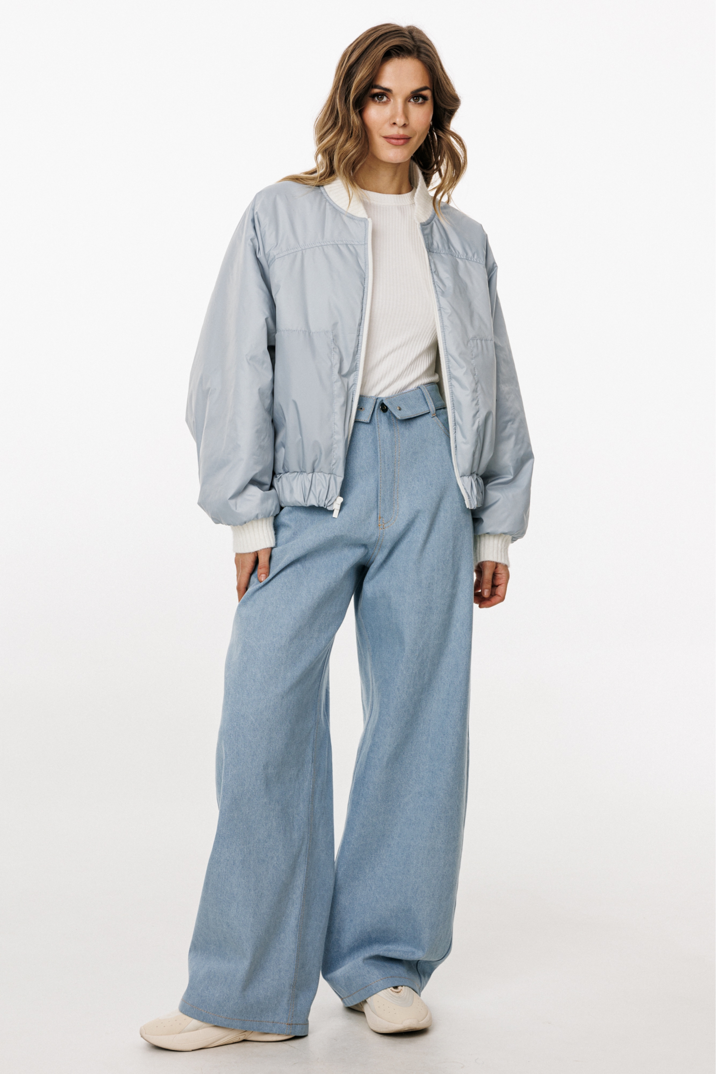 Брюки выполнены из плотного джинса. Брюки прямого силуэта, на притачном поясе, длиной в пол. На передних частях обработаны фигурные боковые карманы и застёжка на металлическую молнию и пуговицу. На задних частях обработаны кокетки и накладные карманы. Пояс выполнен с декоративным отворотом на лицо. По поясу обработаны 5 шлевок и декоративная петля.