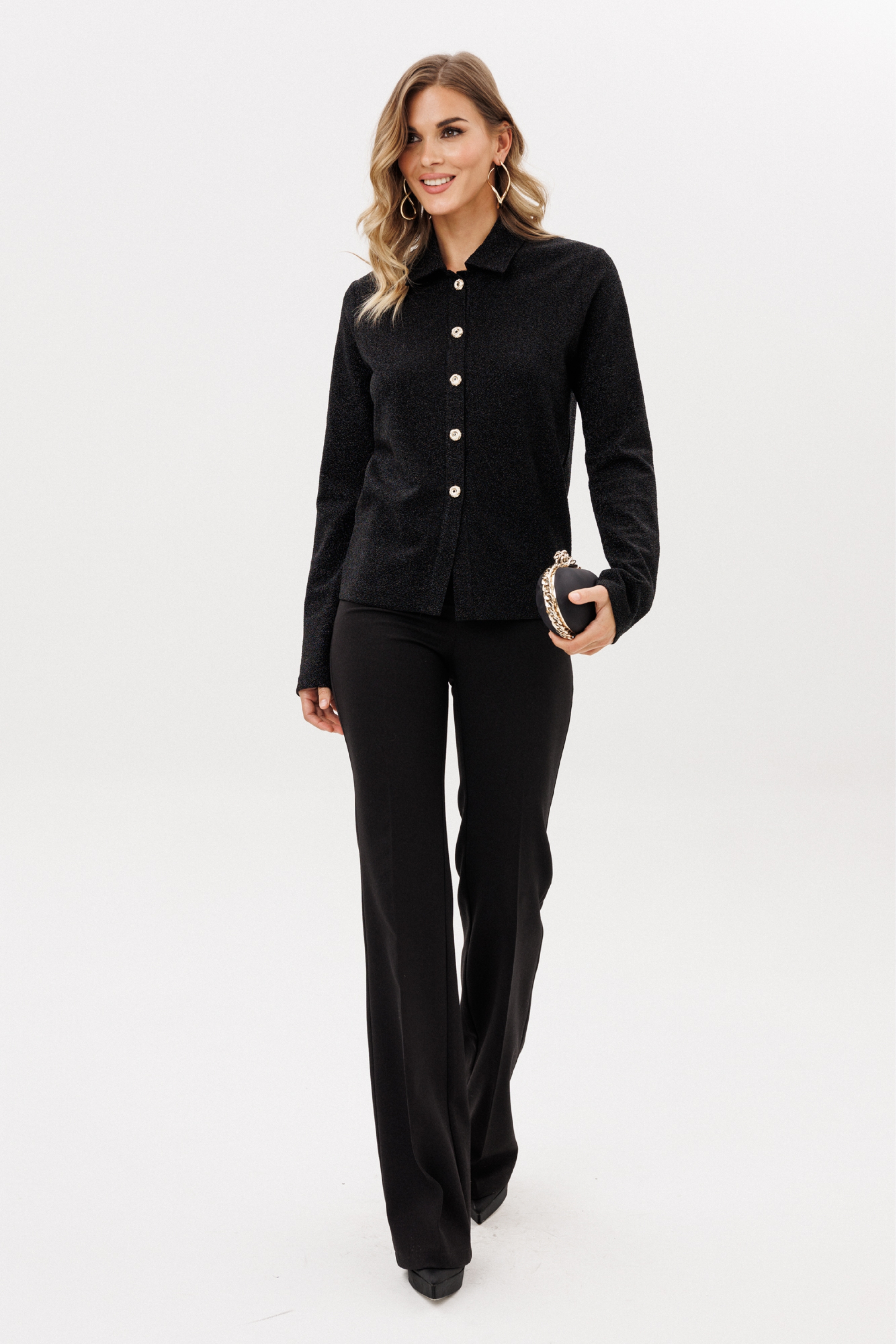 Джемпер выполнен из трикотажного полотна с блеском. Джемпер полуприлегающего силуэта, длиной выше линии бедер. Воротник стояче-отложной. Плечевой шов удлинен. Рукав втачного покроя, одношовный. Застежка по планке на петли и декоративные пуговицы.