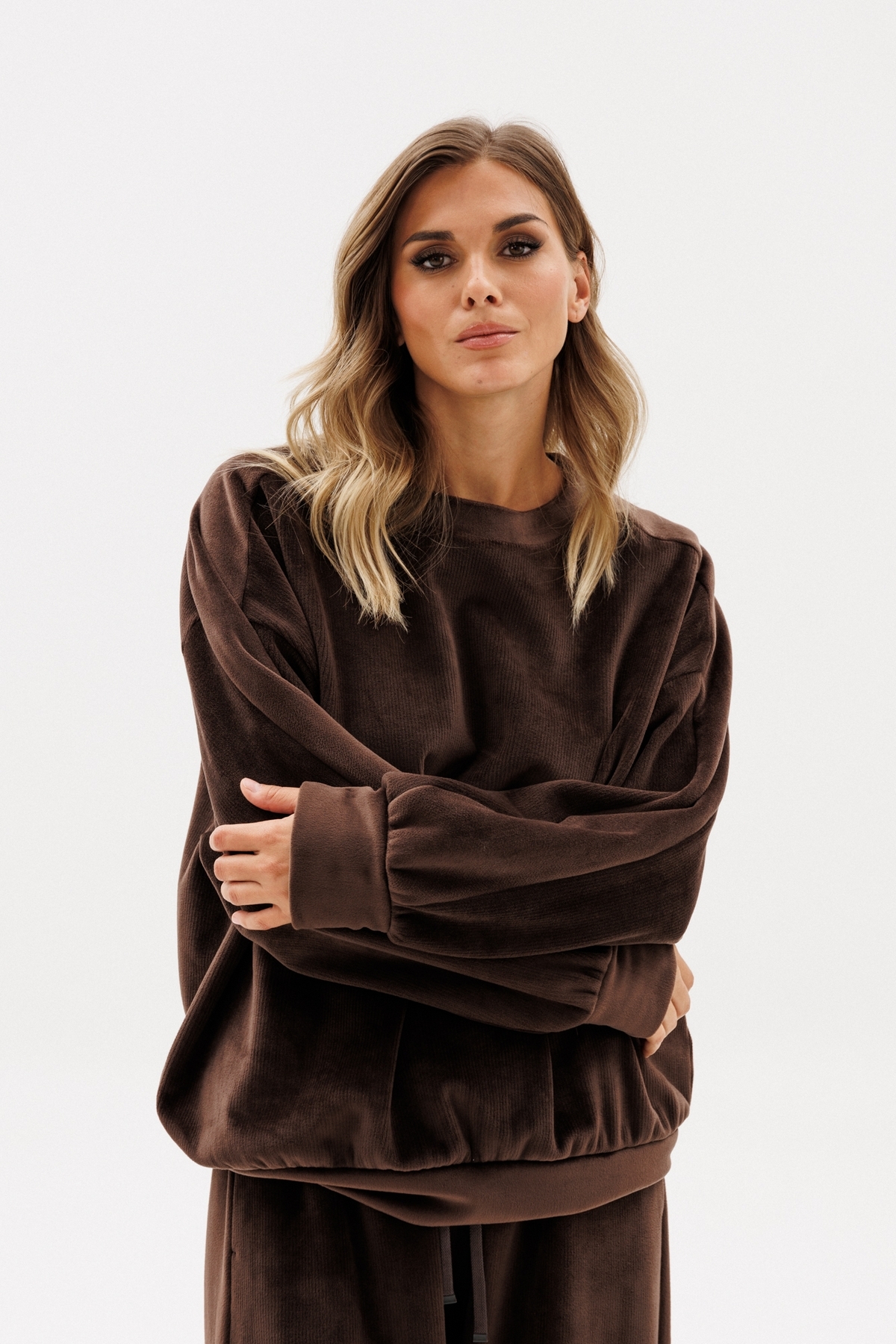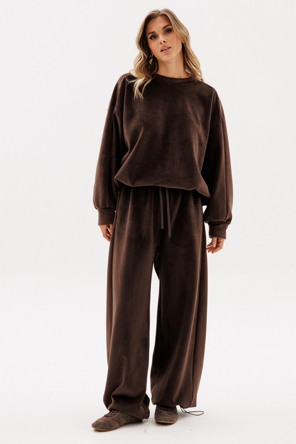 Комплект: джемпер+брюки. Комплект выполнен из двустороннего велюра в мелкий рубчик. Джемпер О-образного силуэта, покроя "oversize", длиной до линии бедер. Перед и спинка цельные. Горловина округлой формы, обработана бейкой. Плечевой шов удлинен. Рукав рубашечного покроя, одношовный. Низ рукава на манжете. Верхняя часть рукава переходит в кокетку переда т спинки и доходит до горловины. По низу джемпера обработан пояс. Пояс, манжеты, верхняя часть рукава и бейка горловины выполнены из основной, но без рубчика. Брюки на притачном поясе с эластичной тесьмой, прямого силуэта, длиной в пол, покроя "oversize". Боковой шов заменен лампасом. В швах лампаса карманы. Сзади накладные карманы. В пояс протянут шнур с наконечниками. По низу брюк втянута эластичная тесьма с фиксаторами. Лампасы и пояс выполнены из основной ткани, но без рубчика.