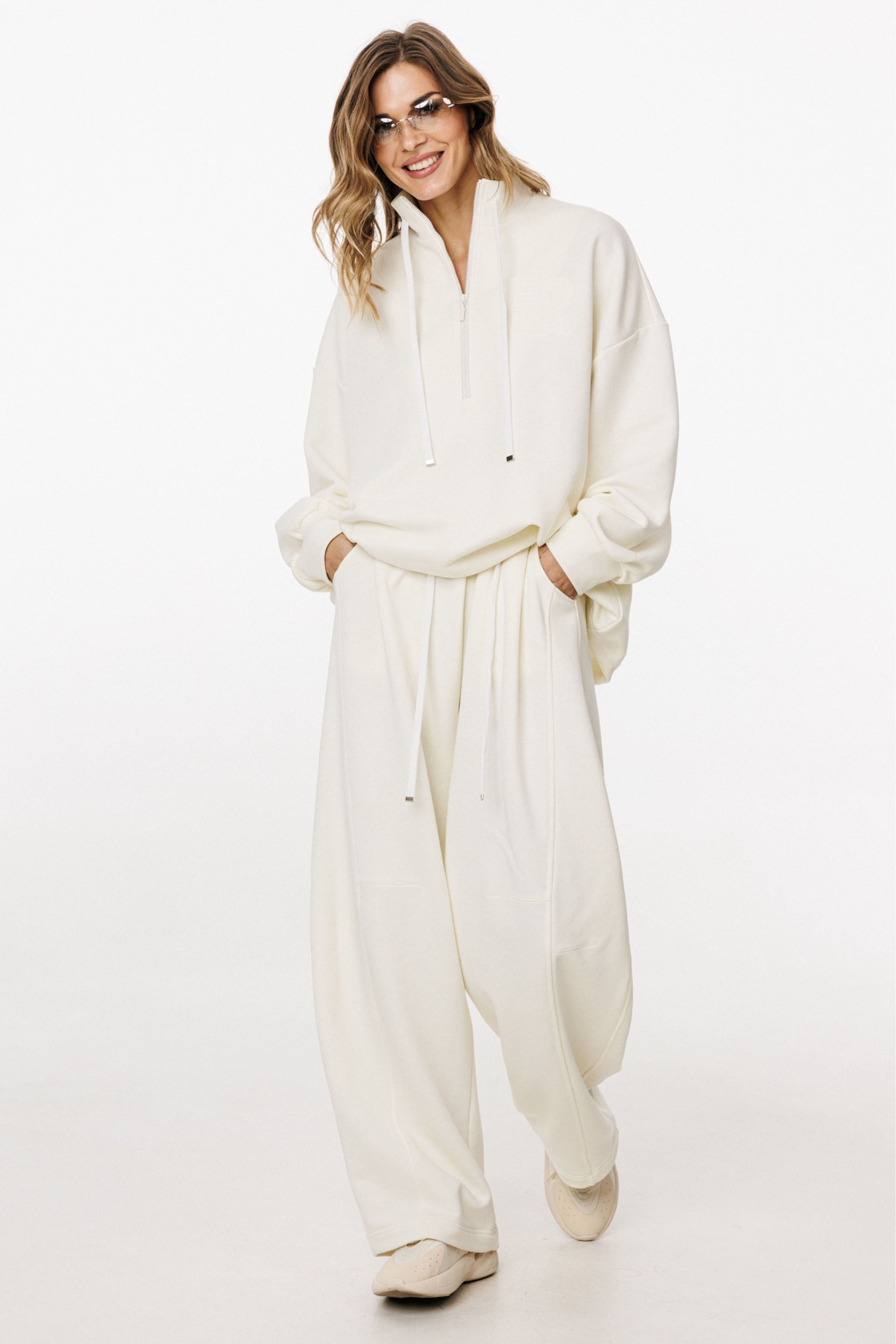 Комплект: джемпер+брюки. Комплект выполнен из трикотажного полотна. Джемпер прямого силуэта, покроя ""oversize"" длиной до линии бедер. Спереди застежка на молнию. Воротник-стойка. Плечевой шов удлинен. Рукав рубашечного покроя, одношовный, расширенный и присборенный к низу. Низ рукава на притачной манжете. Низ джемпера на эластичной тесьме с фиксаторами. Джемпер декорирован вышивкой по переду. Брюки прямого силуэта, длиной в пол, на притачном поясе с эластичной тесьмой. Спереди боковые карманы с фигурным входом, петли в поясе, в которые втянут шнур из основной ткани, коленные вытачки, складки. Сзади справа накладной карман.