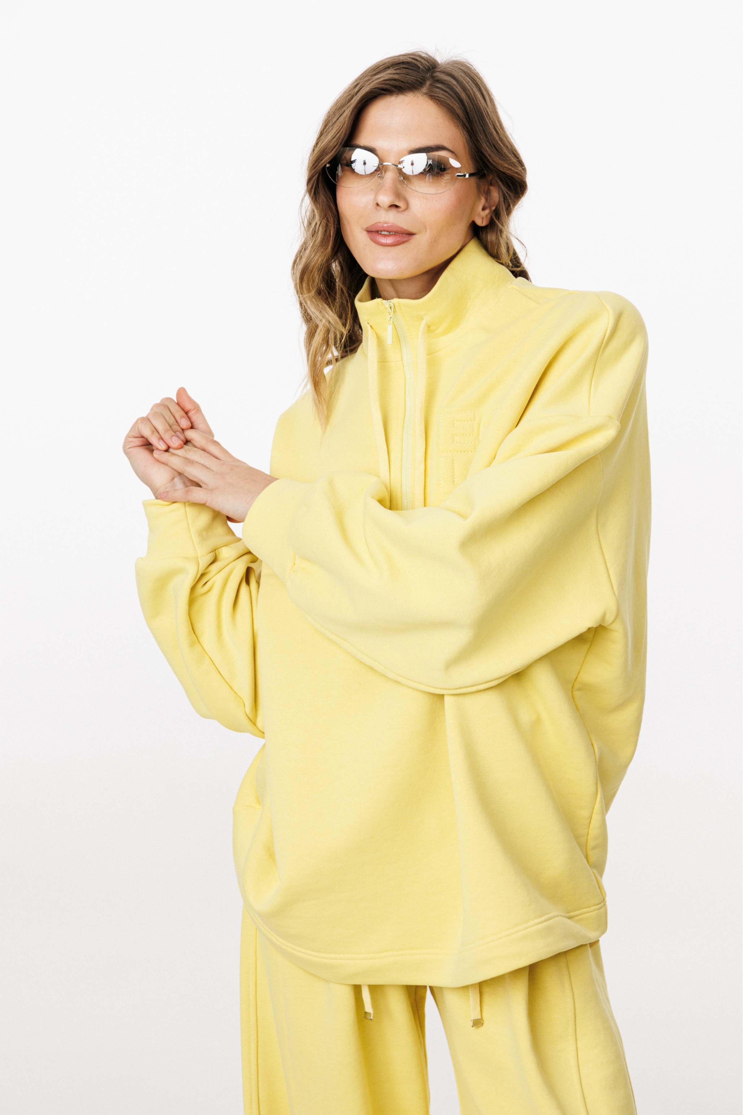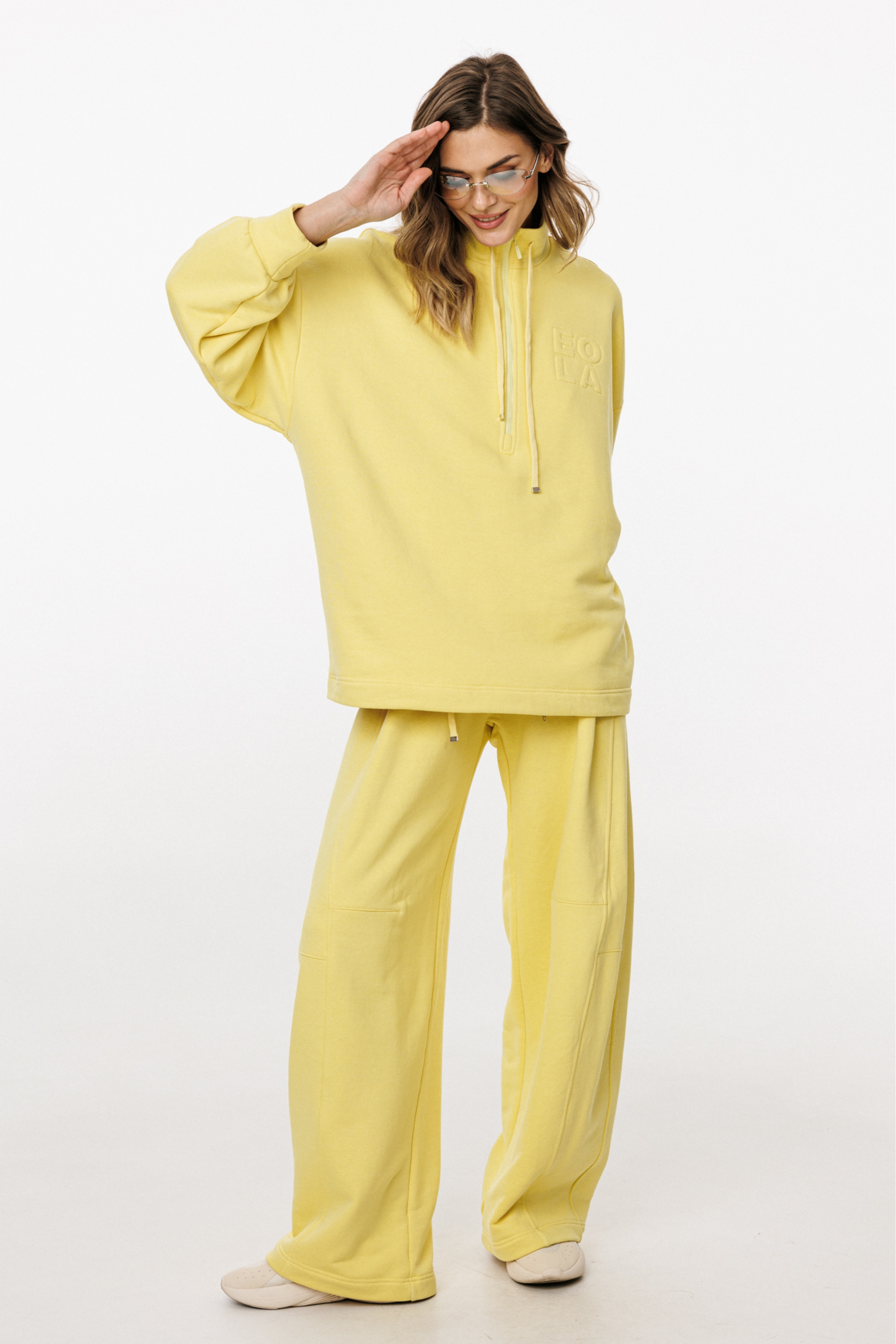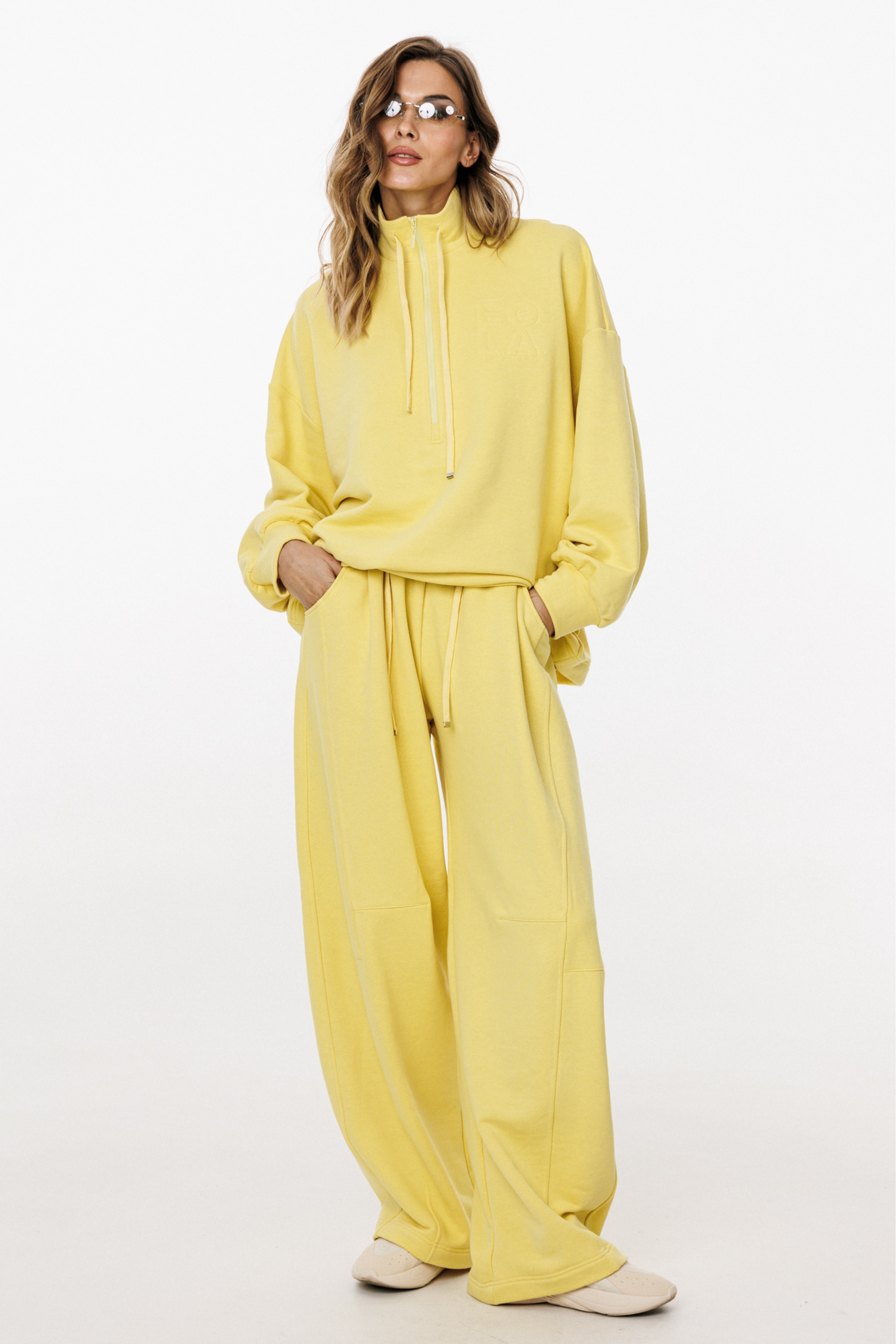Комплект: джемпер+брюки. Комплект выполнен из трикотажного полотна. Джемпер прямого силуэта, покроя ""oversize"" длиной до линии бедер. Спереди застежка на молнию. Воротник-стойка. Плечевой шов удлинен. Рукав рубашечного покроя, одношовный, расширенный и присборенный к низу. Низ рукава на притачной манжете. Низ джемпера на эластичной тесьме с фиксаторами. Джемпер декорирован вышивкой по переду. Брюки прямого силуэта, длиной в пол, на притачном поясе с эластичной тесьмой. Спереди боковые карманы с фигурным входом, петли в поясе, в которые втянут шнур из основной ткани, коленные вытачки, складки. Сзади справа накладной карман.