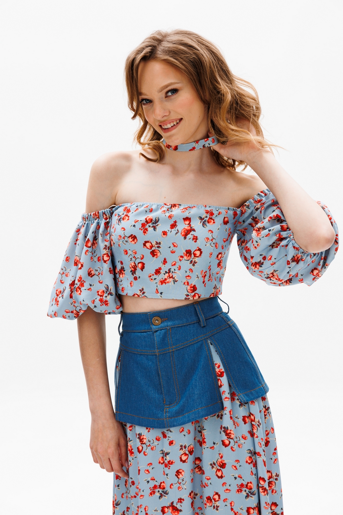 Блузка выполнена из плательной ткани с цветочным принтом. Блузка приталенного силуэта. На спинке обработаны два рельефа с центральной частью, собранной на венгерку. Лиф и спинка на подкладке. Рукав длиной до линии локтя, одношовный, расширенный. Сверху и снизу обработан эластичной тесьмой. Чокер входит в комплект.
