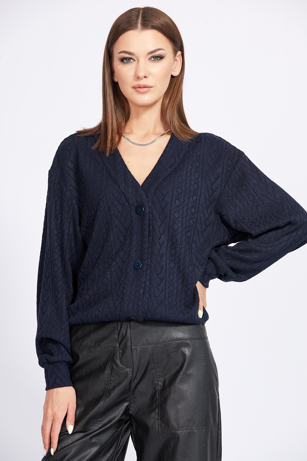 Кардиган выполнен из трикотожного полотна "в косичку". Кардиган свободного кроя, длиной выше линии бедер. Застежка спереди на пуговицы. Спинка цельная. Горловина спереди V-образной формы. Плечевой шов спущен. Рукав одношовный, присборенный по низу. Низ рукава на притачной манжете. Низ кардигана присборен на притачной пояс из основной ткани.
