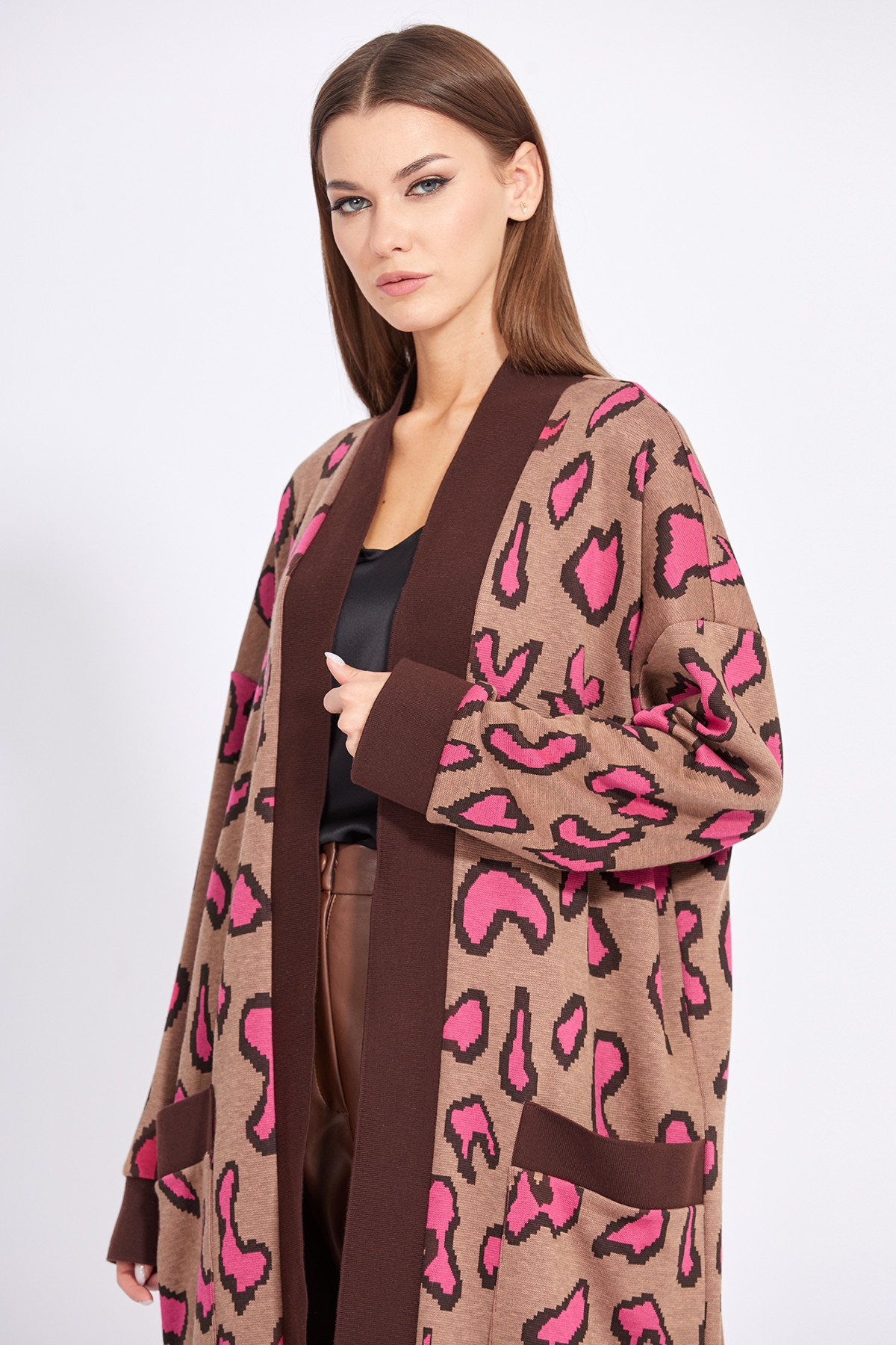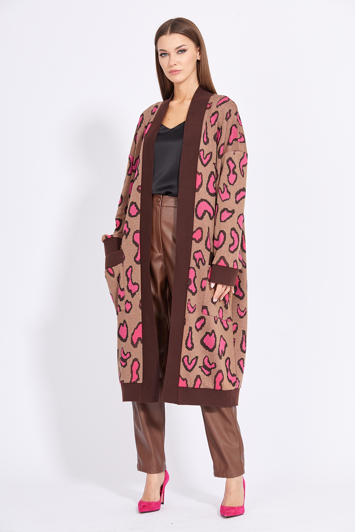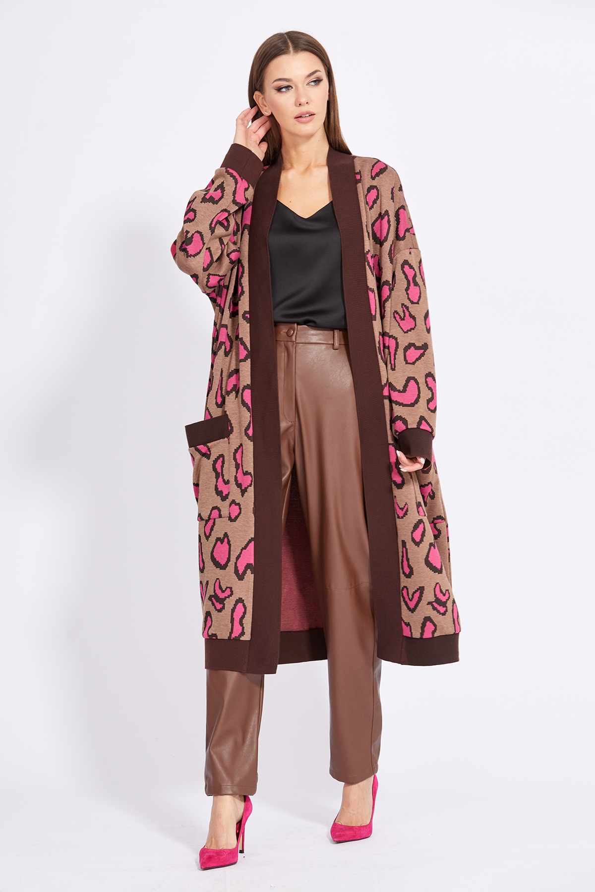 Кардиган выполнен из трикотажного полотна с анималистичным принтом. Кардиган прямого силуэта, длиной ниже линии колена. Спинка цельная. Перед состоит из двух половинок. Спереди накладные карманы. Горловина спинки и борт выполнены из довяза. Плечевой шов спущен. Рукав одношовный. Низ рукава, низ кардигана и верх кармана выполнены из довяза.