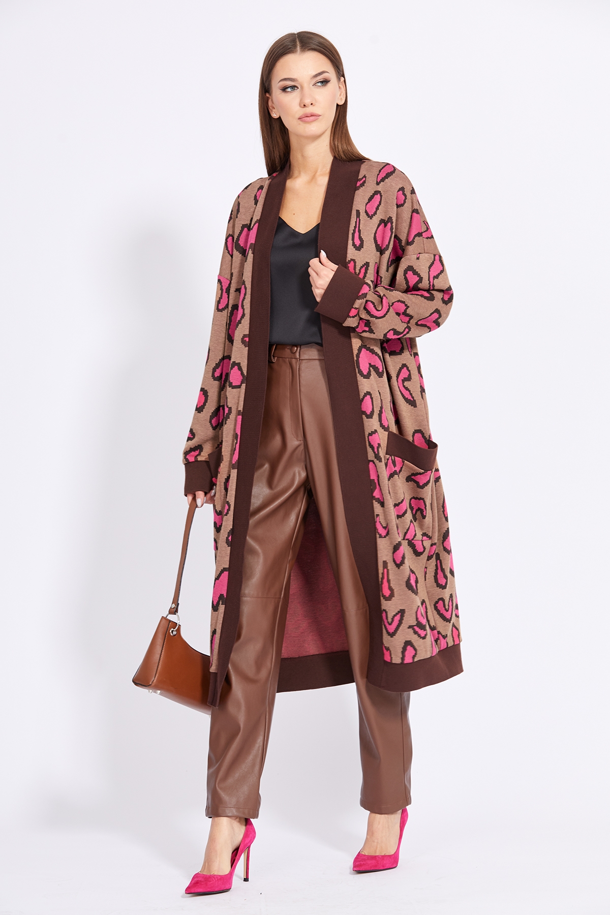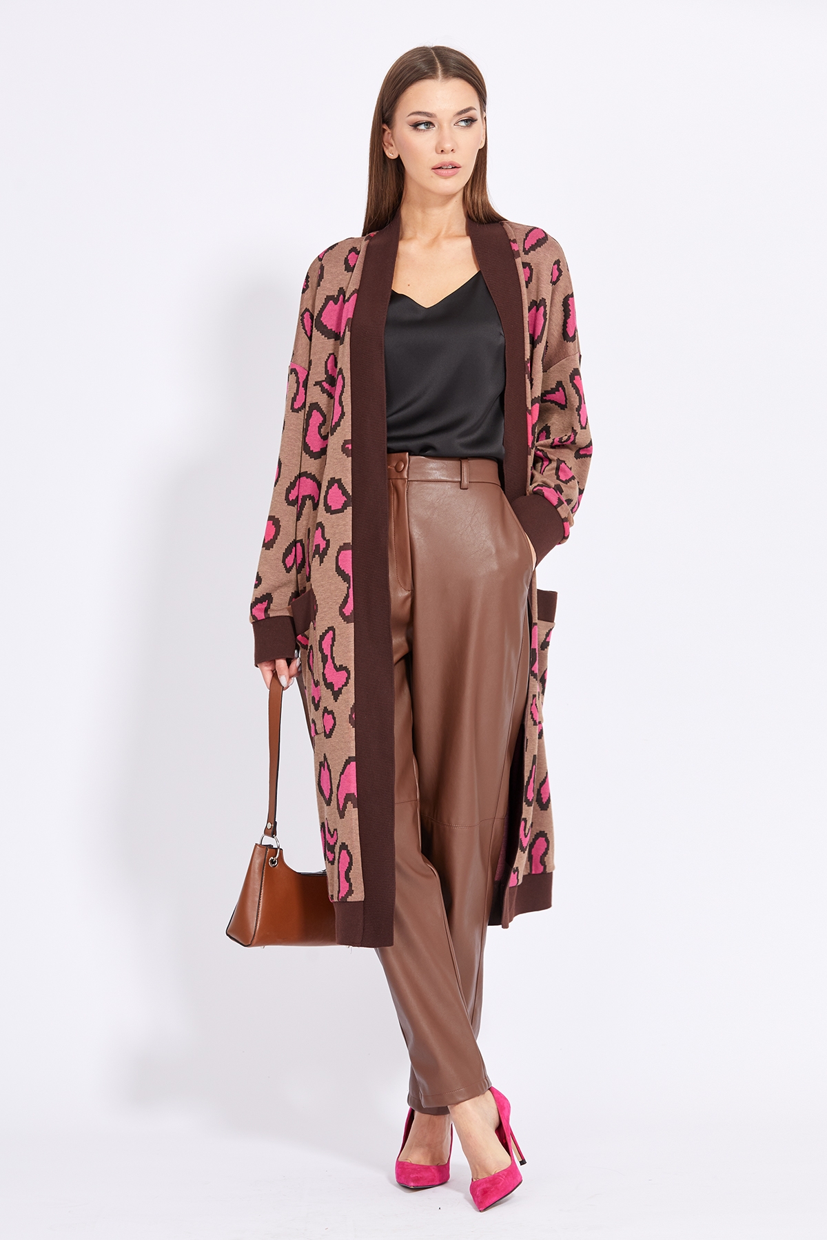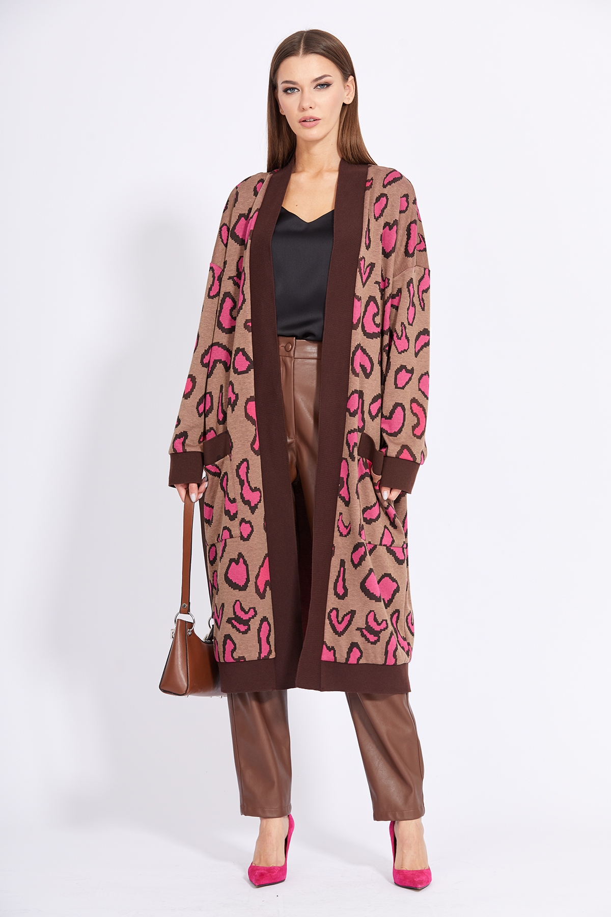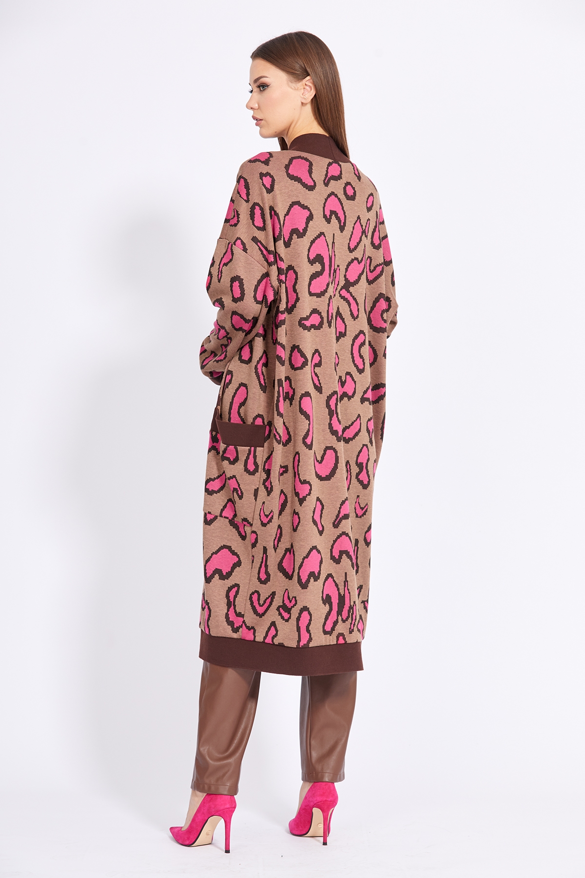 Кардиган выполнен из трикотажного полотна с анималистичным принтом. Кардиган прямого силуэта, длиной ниже линии колена. Спинка цельная. Перед состоит из двух половинок. Спереди накладные карманы. Горловина спинки и борт выполнены из довяза. Плечевой шов спущен. Рукав одношовный. Низ рукава, низ кардигана и верх кармана выполнены из довяза.