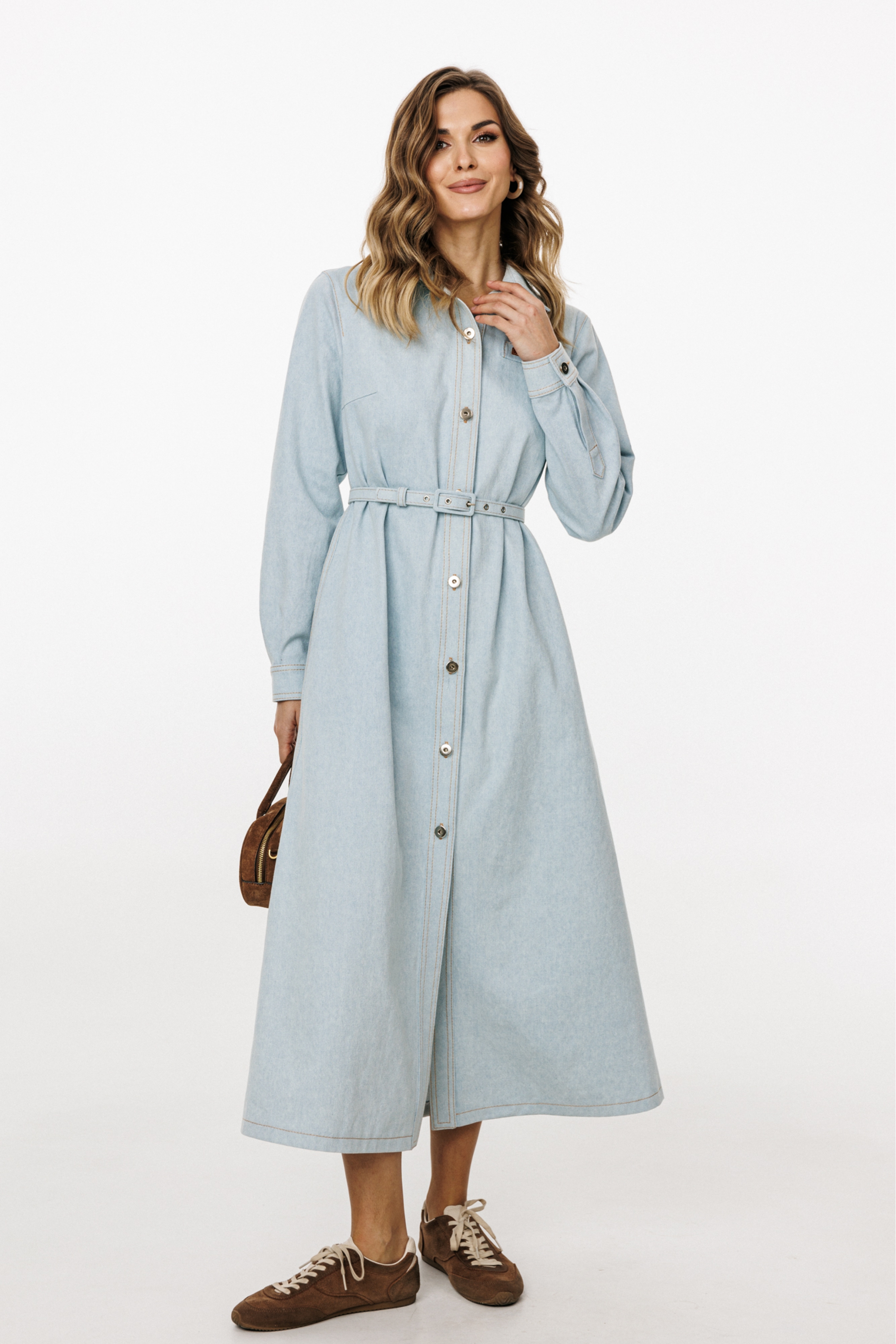 Платье выполнено из плотного джинса. Платье А-образного силуэта, длиной миди. Застежка спереди на металлические пробивные пуговицы. На спинке кокетка и встречная складка от нее. Воротник стояче-отложной с отрезной стойкой. Рукав втачной, одношовный, с прорезью и складками по низу. Низ рукава на манжете, застегивающейся на пуговицу. В боковых швах карманы. Платье декорировано нашивками из натуральной кожи по переду и спинке.