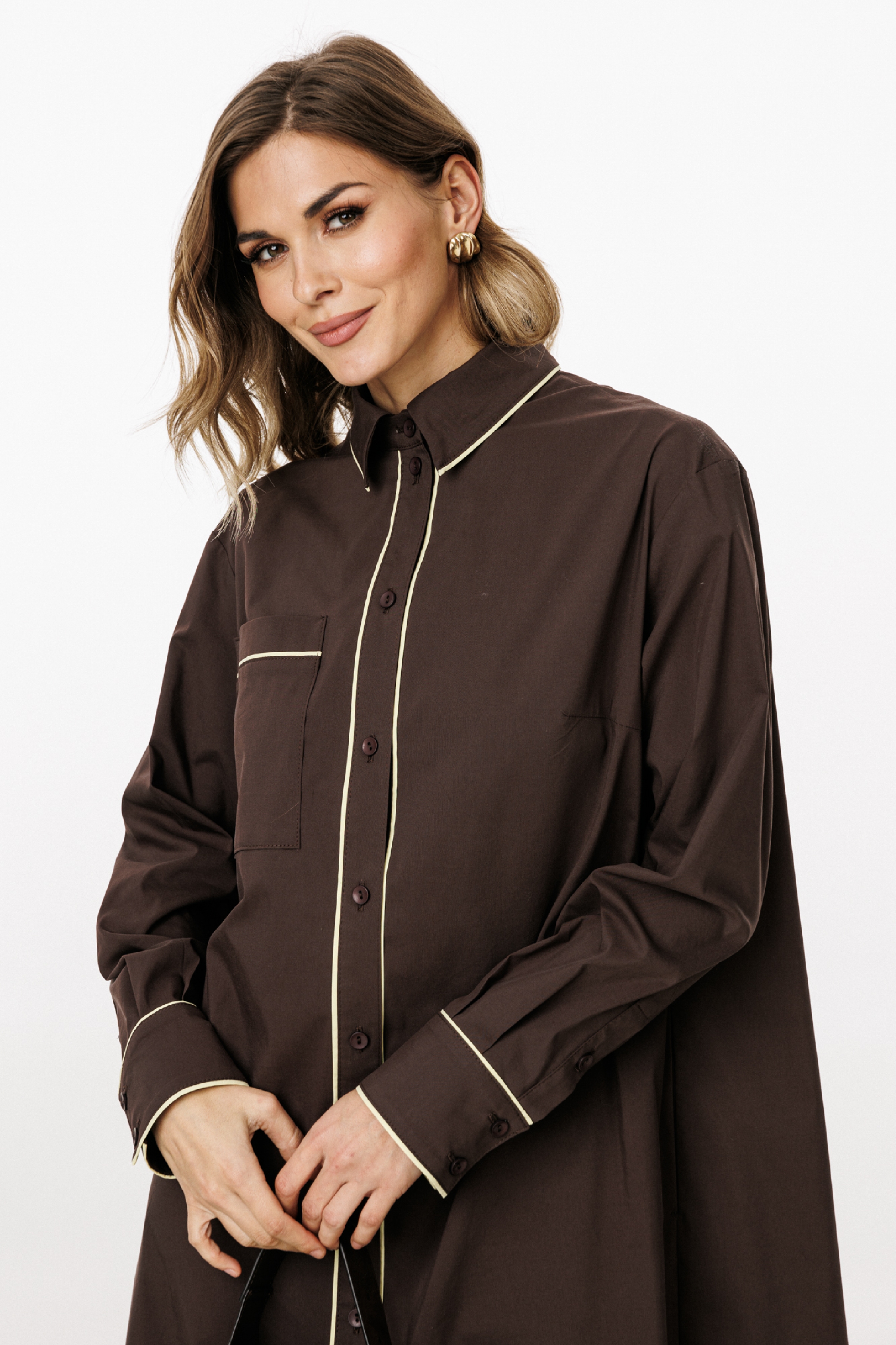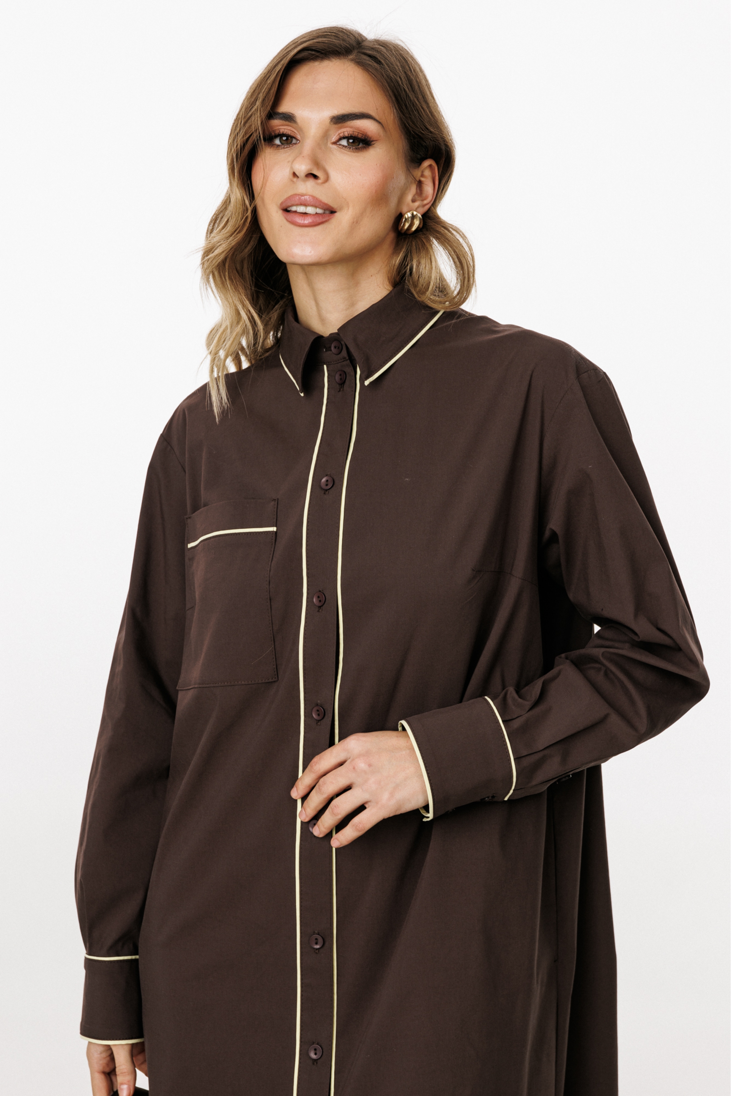 Платье выполнено из плательно-блузочной ткани. Платье прямого силуэта. По переду один накладной нагрудный карман и центральная застежка до верха с отрезной планкой с петлями и пуговицами. На спинке обработаны кокетка и складки от неё. Горловина округлой формы, обработана воротником рубашечного типа с отрезной планкой. Плечевой шов удлинен. Рукав рубашечного покроя, одношовный, со складками и обтачкой прорези по низу. Низ рукава обработан притачной манжетой, застегивающейся на петли и пуговицы. В боковых швах обработаны карманы и разрезы. В комплект входит съемный пояс из основной ткани. Платье декорировано контрастным кантом по отлету воротника, кокетки спинки, манжетам, карману, планкам и поясу.